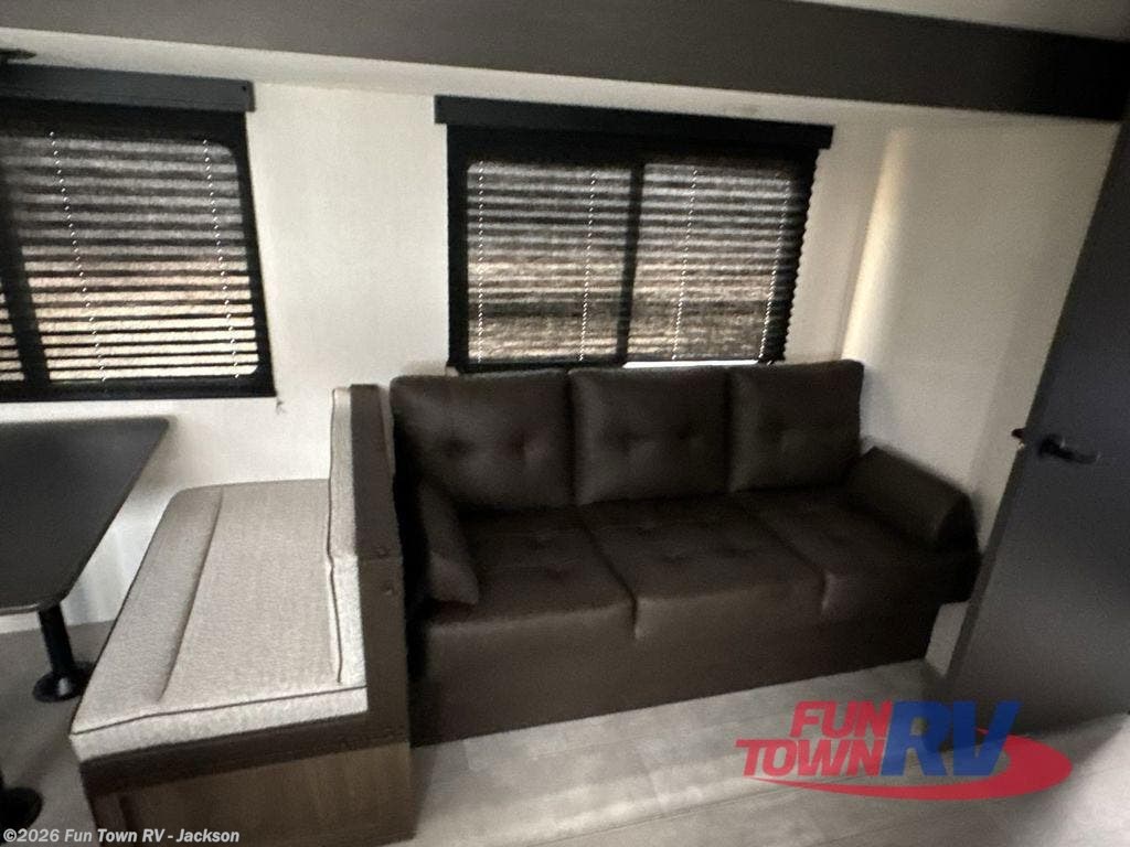 This travel trailer is the best option for a big family! The trailer boasts a spacious bunk bed above a sofa bed, providing ample sleeping space for kids and adults alike. The luxurious front king bed is a serene retreat, featuring expansive wardrobes and overhead cabinets for storing your essentials. The charming booth dinette is a cozy spot for meals or extra sleeping space, as well as the versatile jackknife sofa, which also provides additional sleeping space or a comfortable spot to relax. The sleek entertainment center is perfect for family movie nights. The well-appointed kitchen is equipped with a large fridge, convenient shelves, and a spacious pantry, making meal prep and storage an easy chore. The modern full bathroom features a well-stocked linen closet and provides a convenient space for freshening up. Plus, with two convenient entry/exit doors, this trailer offers added flexibility and ease of use, and the ample overhead cabinets provide additional storage space for your belongings.