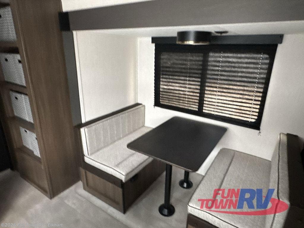 This travel trailer is the best option for a big family! The trailer boasts a spacious bunk bed above a sofa bed, providing ample sleeping space for kids and adults alike. The luxurious front king bed is a serene retreat, featuring expansive wardrobes and overhead cabinets for storing your essentials. The charming booth dinette is a cozy spot for meals or extra sleeping space, as well as the versatile jackknife sofa, which also provides additional sleeping space or a comfortable spot to relax. The sleek entertainment center is perfect for family movie nights. The well-appointed kitchen is equipped with a large fridge, convenient shelves, and a spacious pantry, making meal prep and storage an easy chore. The modern full bathroom features a well-stocked linen closet and provides a convenient space for freshening up. Plus, with two convenient entry/exit doors, this trailer offers added flexibility and ease of use, and the ample overhead cabinets provide additional storage space for your belongings.