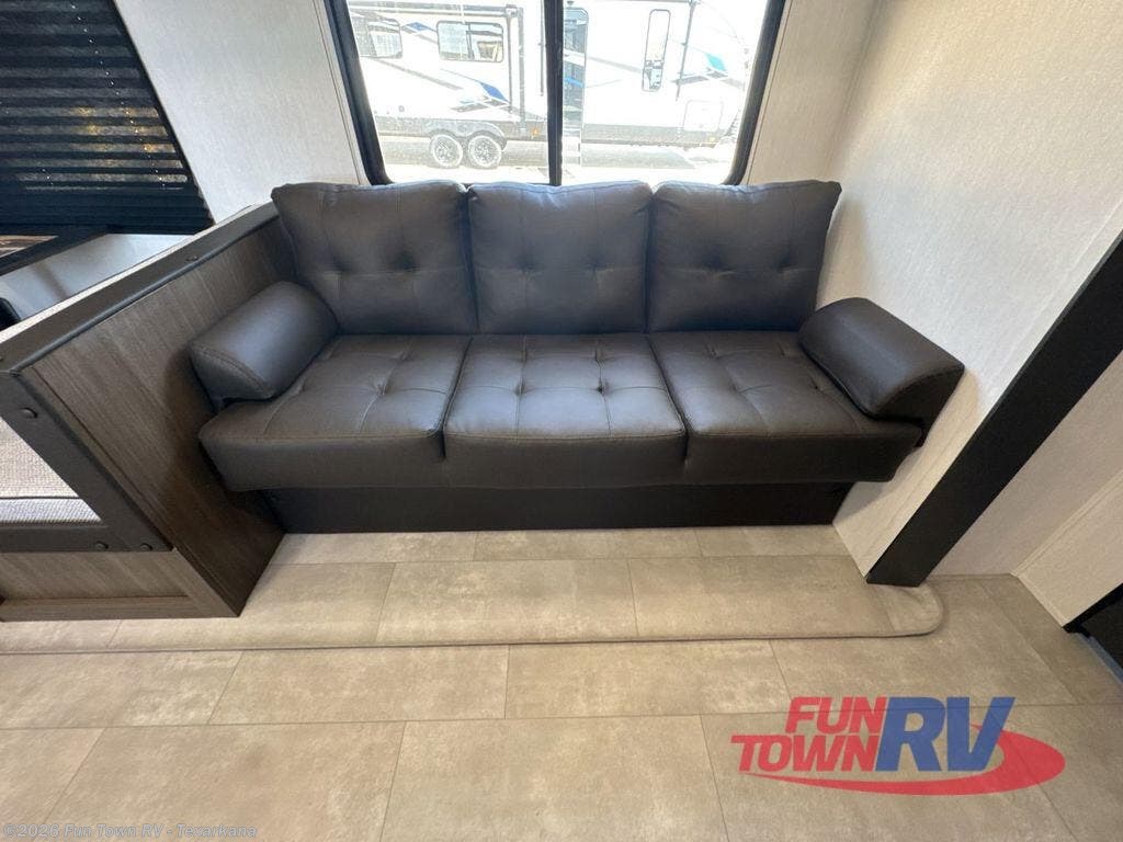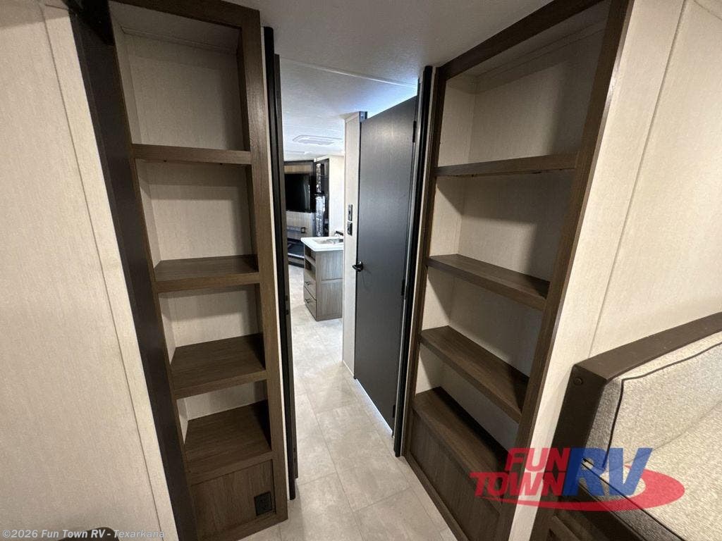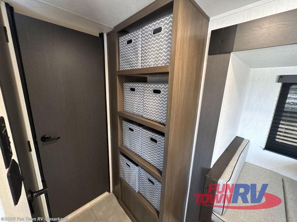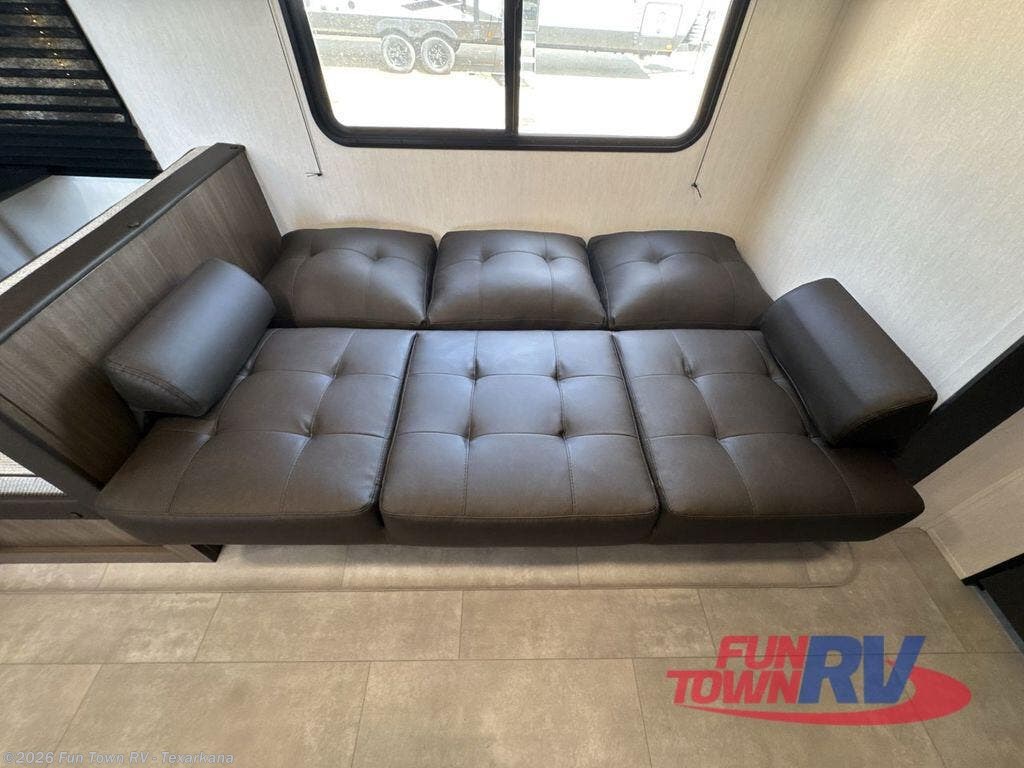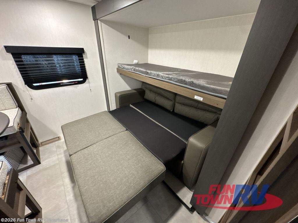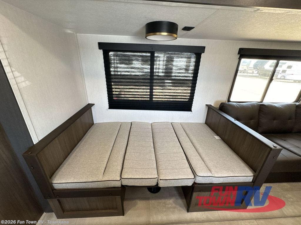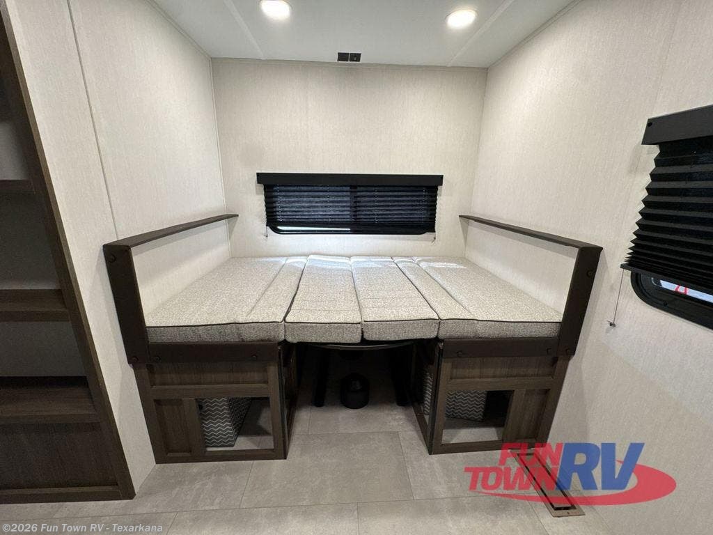 This travel trailer is the best option for a big family! The trailer boasts a spacious bunk bed above a sofa bed, providing ample sleeping space for kids and adults alike. The luxurious front king bed is a serene retreat, featuring expansive wardrobes and overhead cabinets for storing your essentials. The charming booth dinette is a cozy spot for meals or extra sleeping space, as well as the versatile jackknife sofa, which also provides additional sleeping space or a comfortable spot to relax. The sleek entertainment center is perfect for family movie nights. The well-appointed kitchen is equipped with a large fridge, convenient shelves, and a spacious pantry, making meal prep and storage an easy chore. The modern full bathroom features a well-stocked linen closet and provides a convenient space for freshening up. Plus, with two convenient entry/exit doors, this trailer offers added flexibility and ease of use, and the ample overhead cabinets provide additional storage space for your belongings.