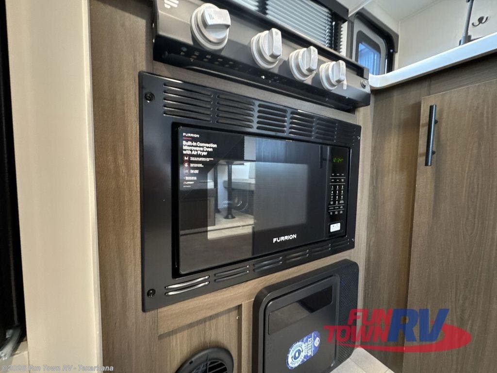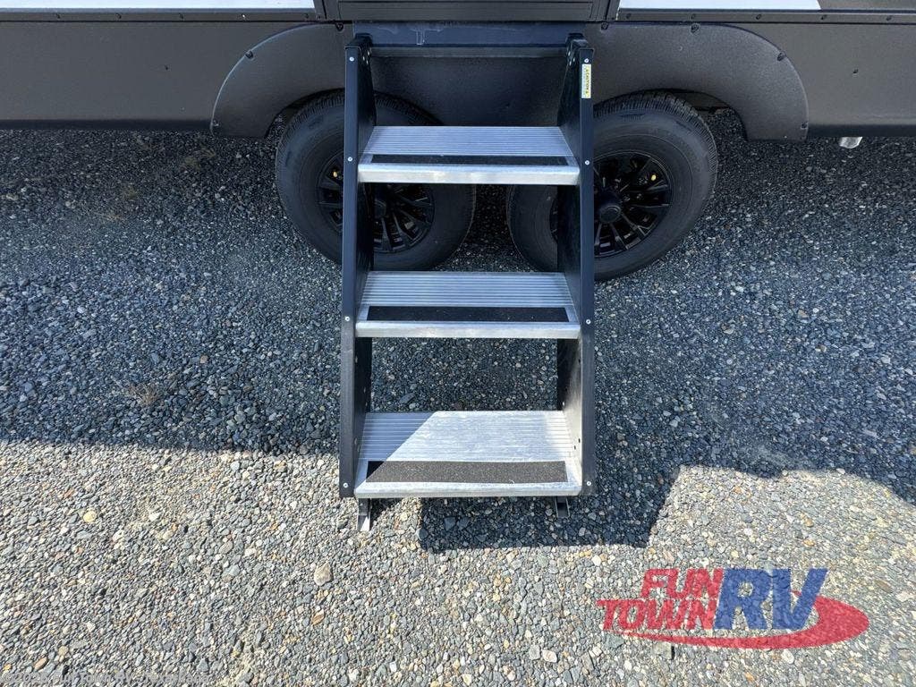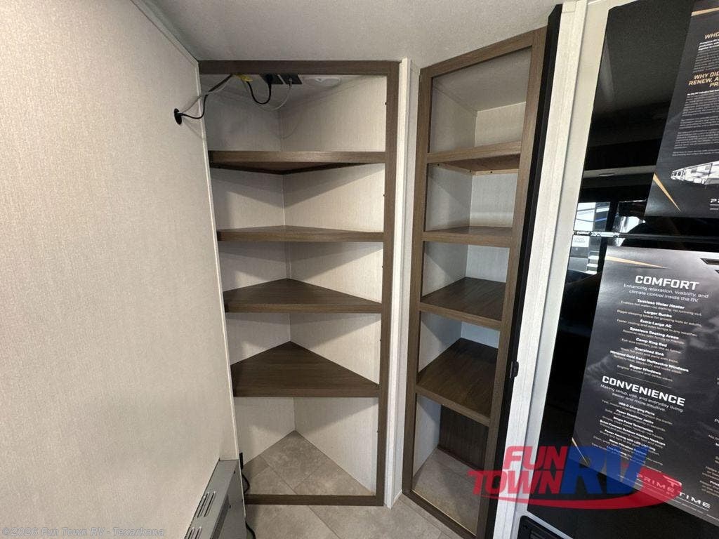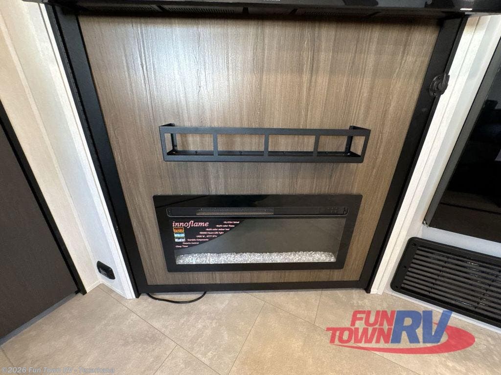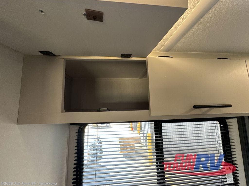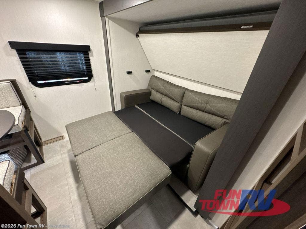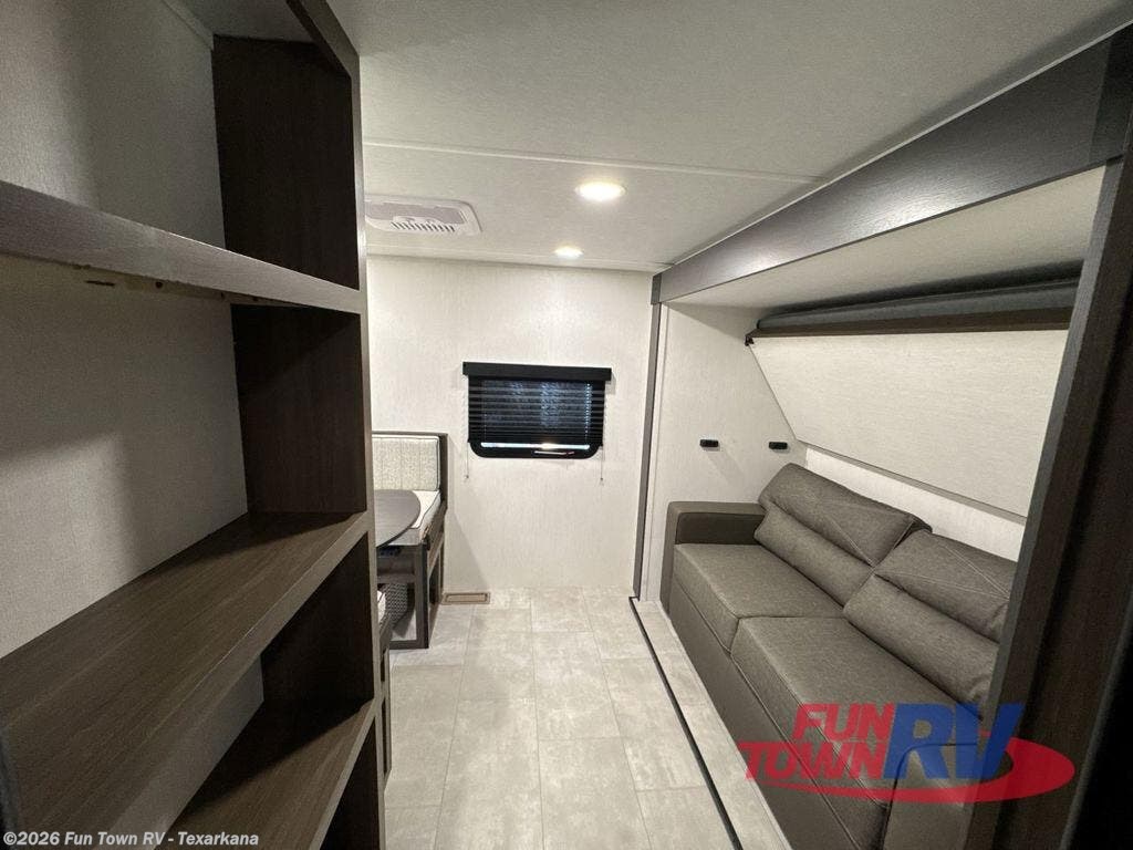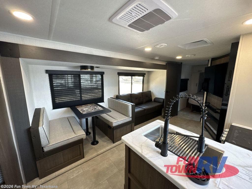 This travel trailer is the best option for a big family! The trailer boasts a spacious bunk bed above a sofa bed, providing ample sleeping space for kids and adults alike. The luxurious front king bed is a serene retreat, featuring expansive wardrobes and overhead cabinets for storing your essentials. The charming booth dinette is a cozy spot for meals or extra sleeping space, as well as the versatile jackknife sofa, which also provides additional sleeping space or a comfortable spot to relax. The sleek entertainment center is perfect for family movie nights. The well-appointed kitchen is equipped with a large fridge, convenient shelves, and a spacious pantry, making meal prep and storage an easy chore. The modern full bathroom features a well-stocked linen closet and provides a convenient space for freshening up. Plus, with two convenient entry/exit doors, this trailer offers added flexibility and ease of use, and the ample overhead cabinets provide additional storage space for your belongings.
