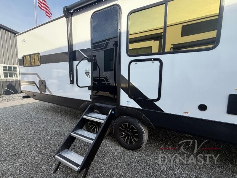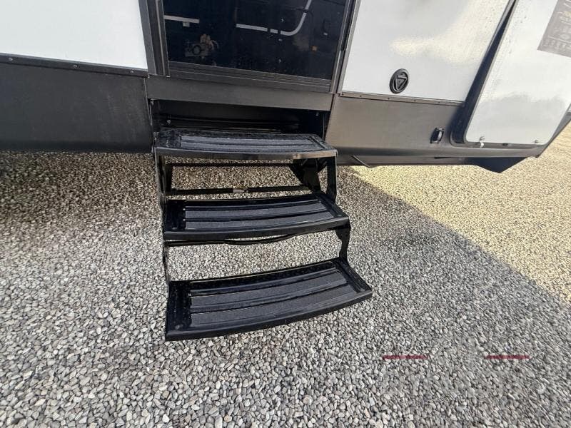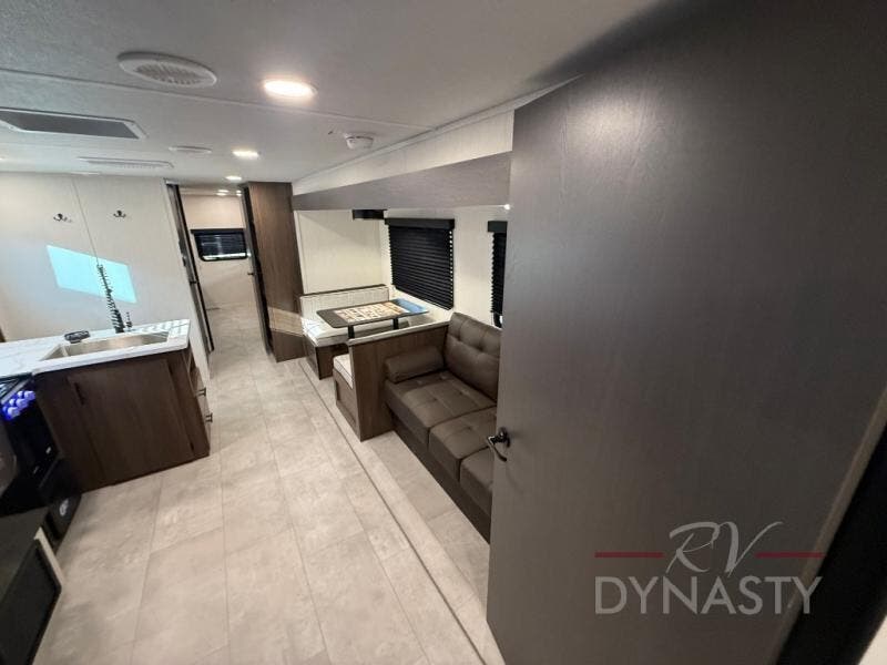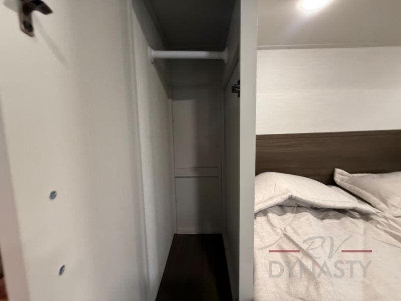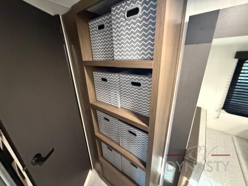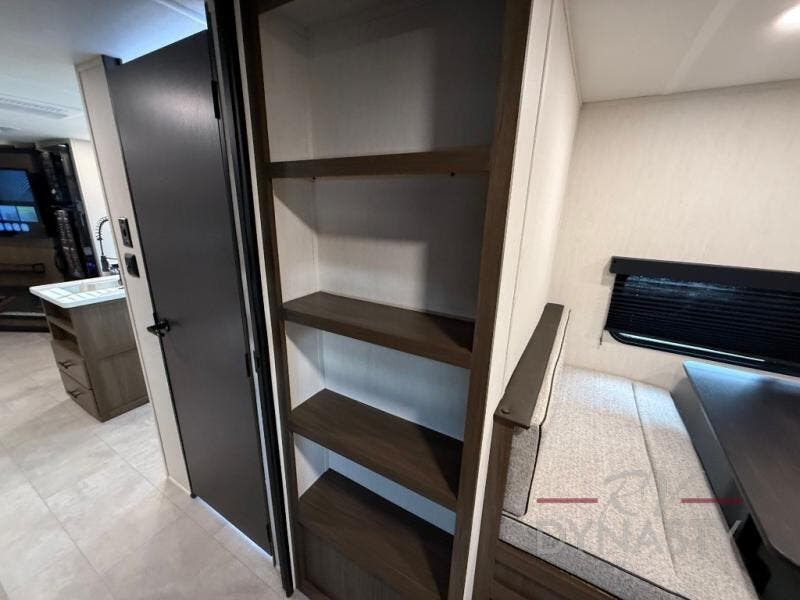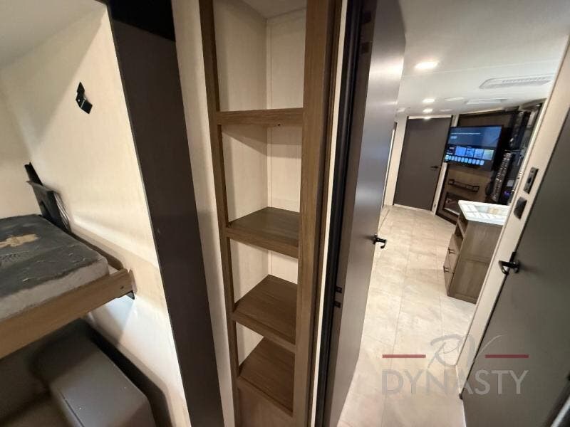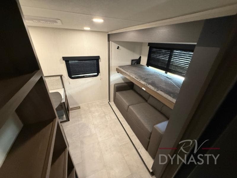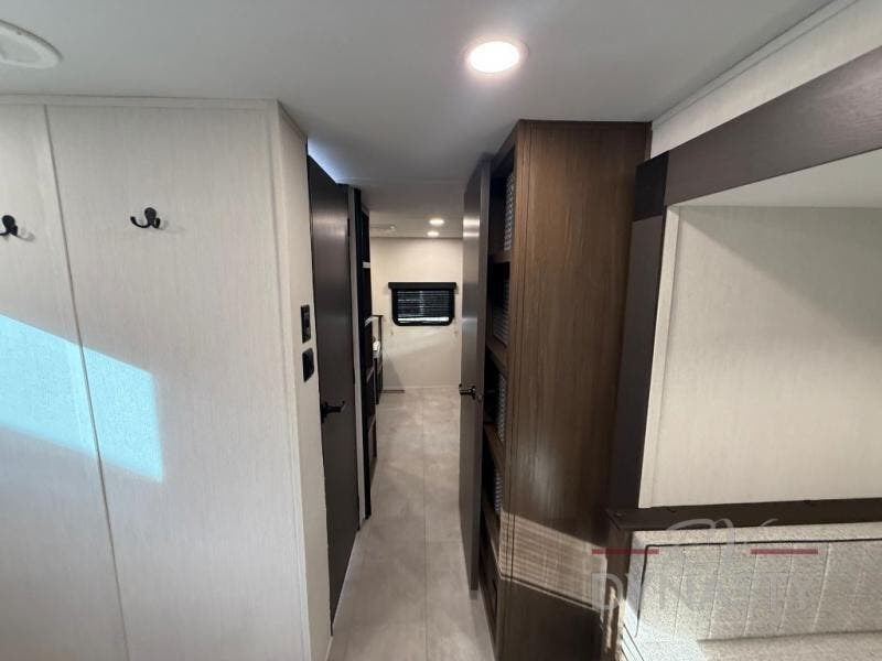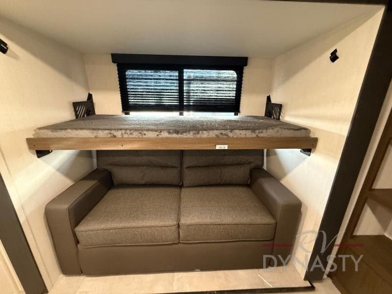 This travel trailer is the best option for a big family! The trailer boasts a spacious bunk bed above a sofa bed, providing ample sleeping space for kids and adults alike. The luxurious front king bed is a serene retreat, featuring expansive wardrobes and overhead cabinets for storing your essentials. The charming booth dinette is a cozy spot for meals or extra sleeping space, as well as the versatile jackknife sofa, which also provides additional sleeping space or a comfortable spot to relax. The sleek entertainment center is perfect for family movie nights. The well-appointed kitchen is equipped with a large fridge, convenient shelves, and a spacious pantry, making meal prep and storage an easy chore. The modern full bathroom features a well-stocked linen closet and provides a convenient space for freshening up. Plus, with two convenient entry/exit doors, this trailer offers added flexibility and ease of use, and the ample overhead cabinets provide additional storage space for your belongings.
