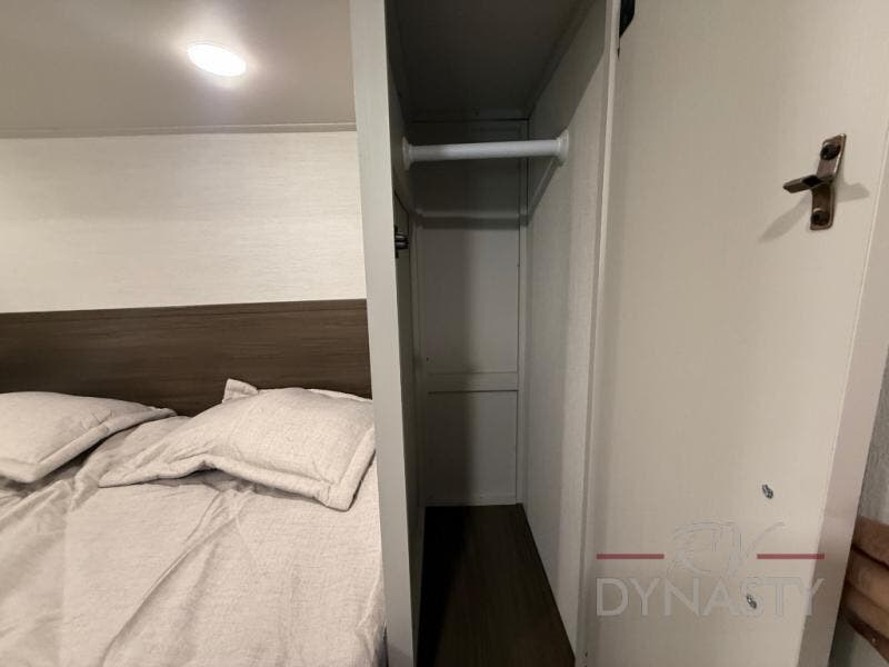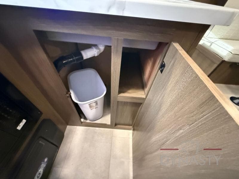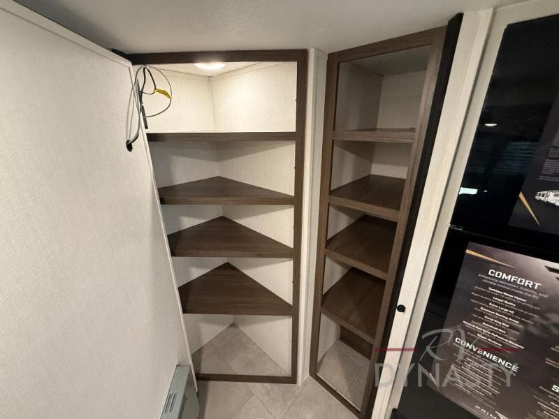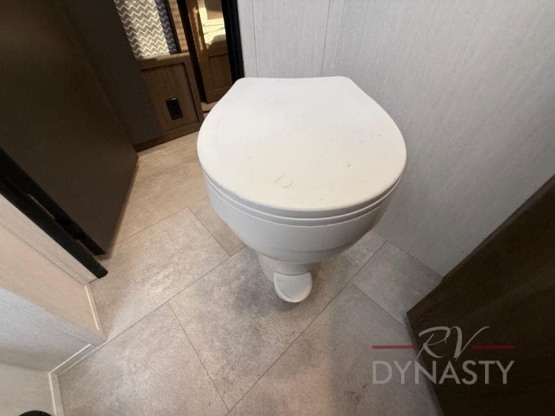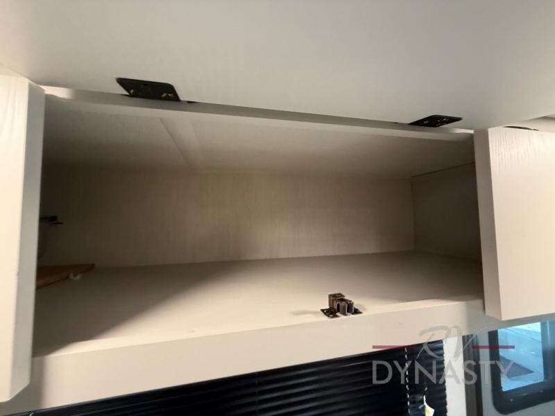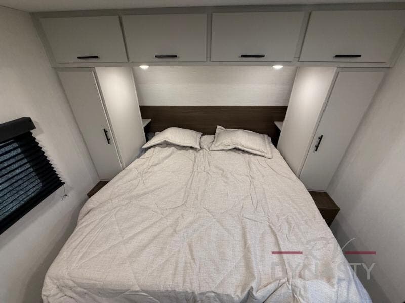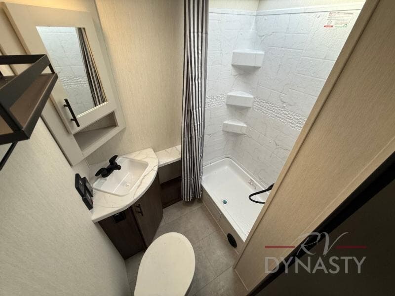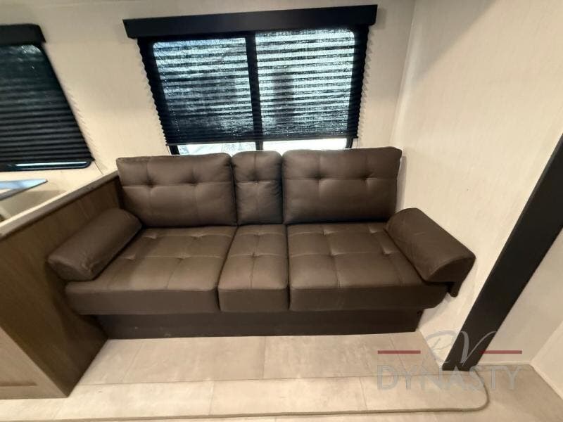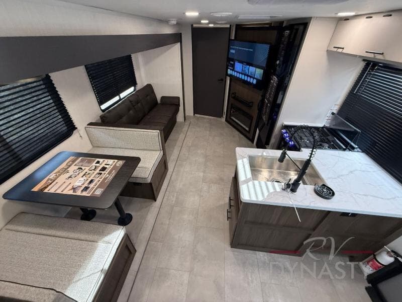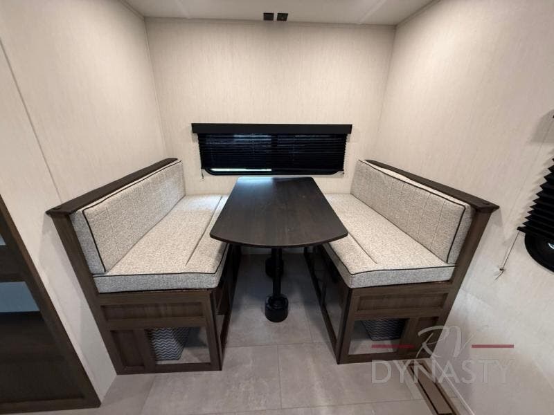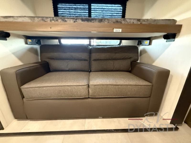 This travel trailer is the best option for a big family! The trailer boasts a spacious bunk bed above a sofa bed, providing ample sleeping space for kids and adults alike. The luxurious front king bed is a serene retreat, featuring expansive wardrobes and overhead cabinets for storing your essentials. The charming booth dinette is a cozy spot for meals or extra sleeping space, as well as the versatile jackknife sofa, which also provides additional sleeping space or a comfortable spot to relax. The sleek entertainment center is perfect for family movie nights. The well-appointed kitchen is equipped with a large fridge, convenient shelves, and a spacious pantry, making meal prep and storage an easy chore. The modern full bathroom features a well-stocked linen closet and provides a convenient space for freshening up. Plus, with two convenient entry/exit doors, this trailer offers added flexibility and ease of use, and the ample overhead cabinets provide additional storage space for your belongings.