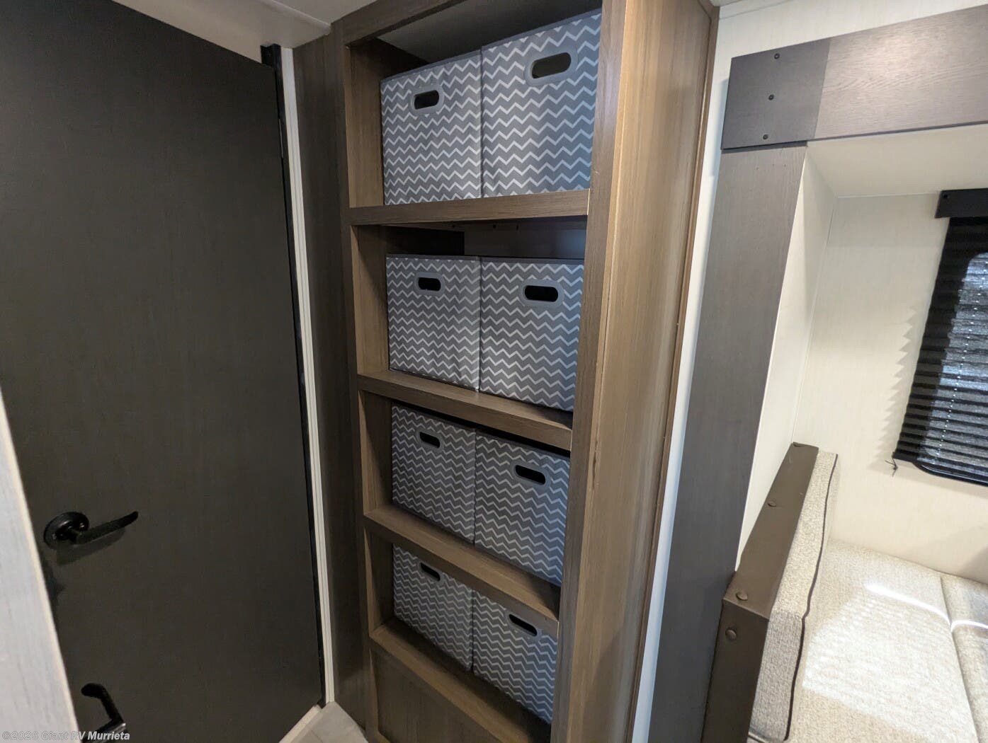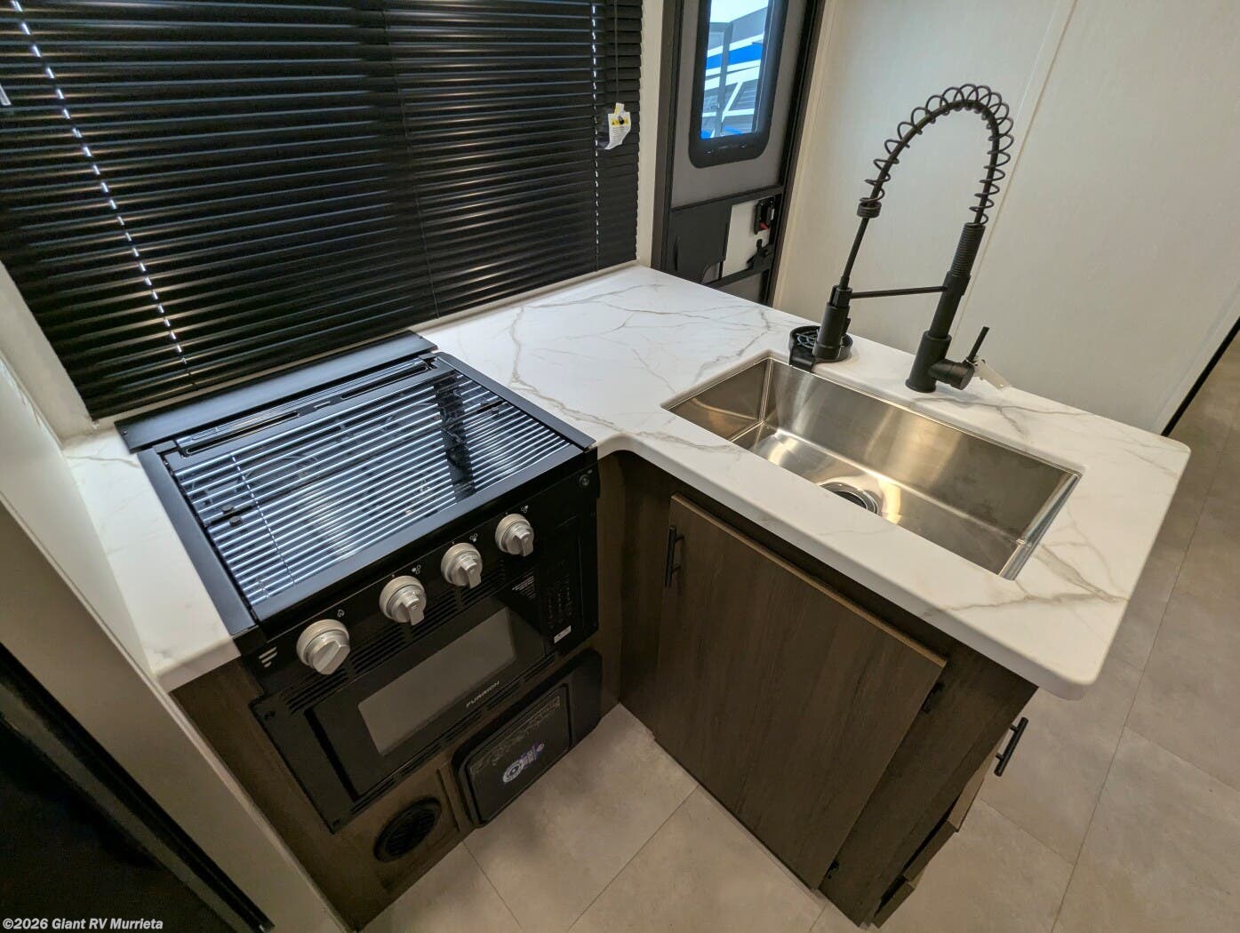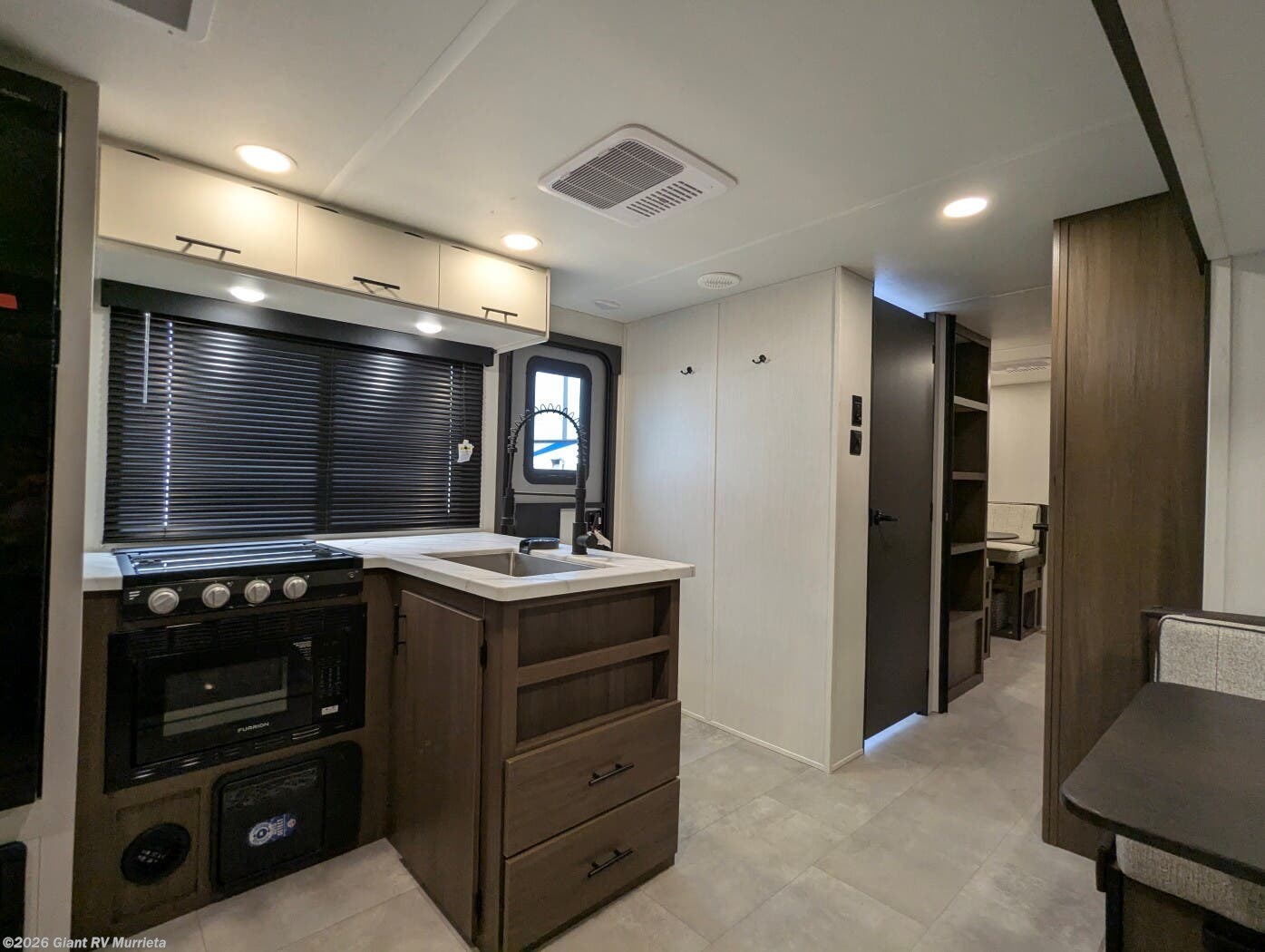 - Modern Amenities: Features air conditioning, a kitchen with a 12V refrigerator, microwave, pantry, and an exterior camp kitchen for easy meals.