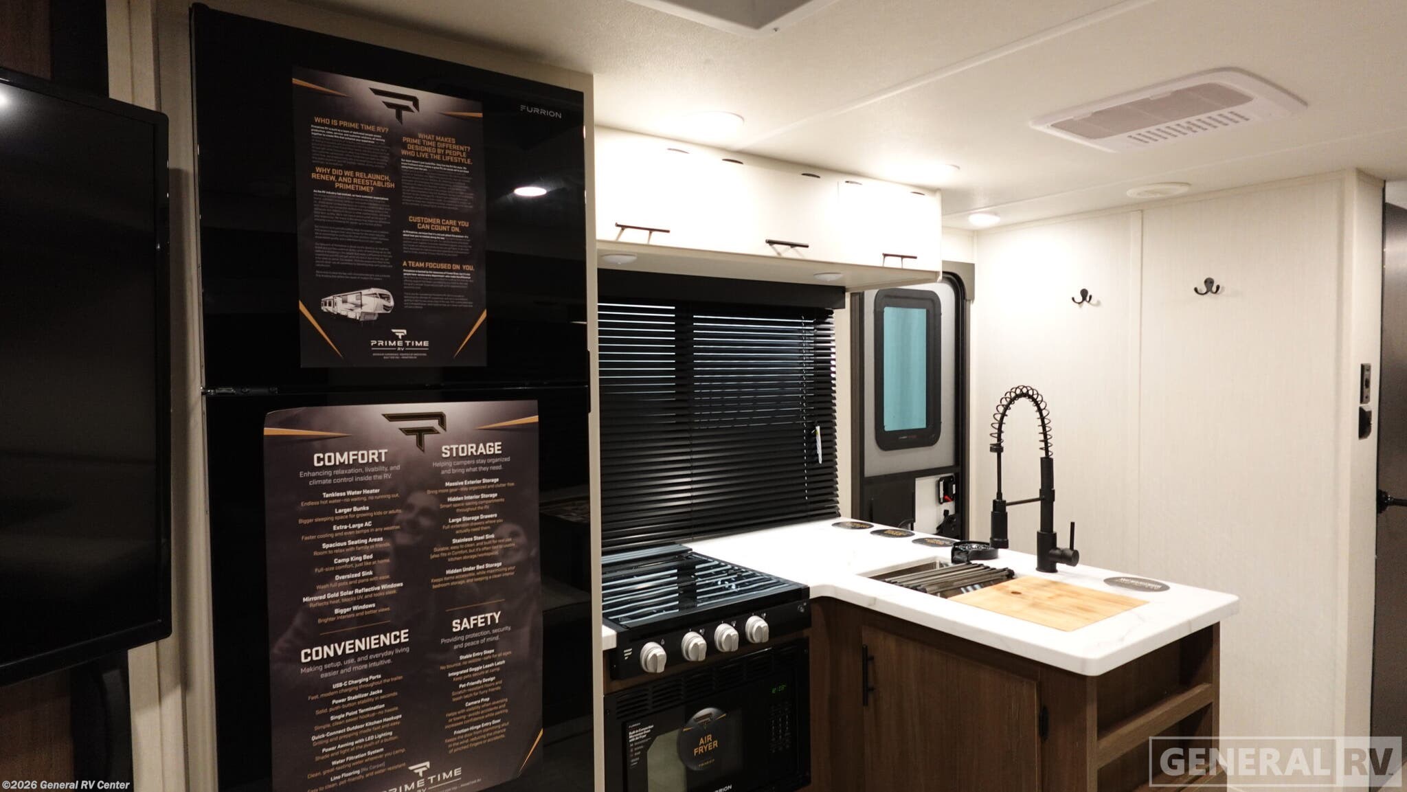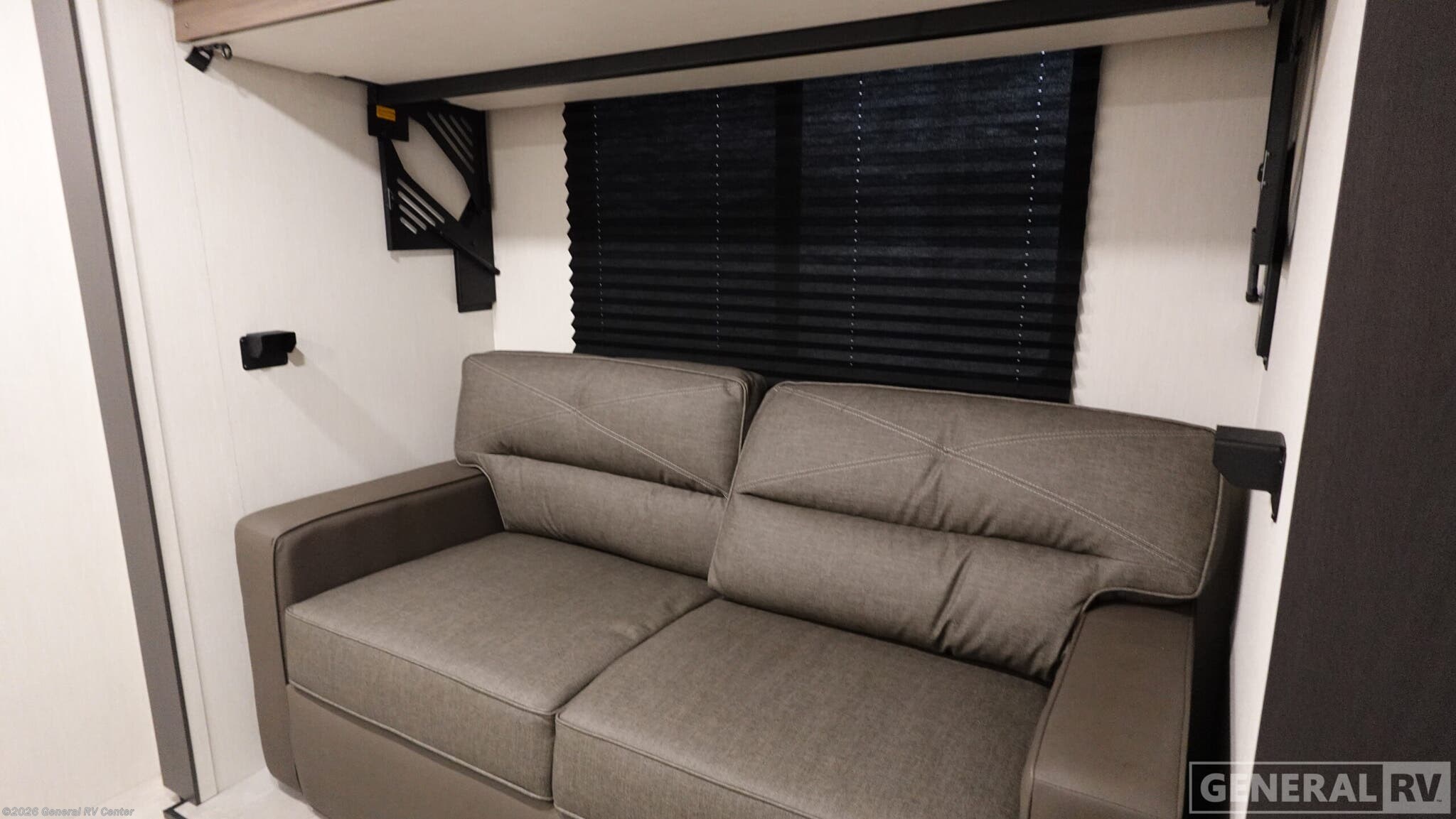 Discover the 2026 Prime Time Tracer 295DB, a spacious and thoughtfully designed travel trailer perfect for families and adventurers alike. With a length of 37 feet, this RV offers ample room to relax and enjoy your journey. The layout includes a cozy bunk bed area and a versatile sofa bed, ensuring comfortable sleeping arrangements for up to eight people. The central living space features a jackknife sofa and a dinette, providing the perfect setting for meals and relaxation. The well-equipped kitchen comes with an air fryer cooktop and a generous pantry, making meal preparation a breeze. The entertainment center is conveniently located for easy viewing from the main living area. At the rear, the private bedroom boasts a luxurious camp king bed, surrounded by ample storage including wardrobes and overhead cabinets. The bathroom features a spacious shower and linen closet, adding to the comfort and convenience of this model. With a fresh water capacity of 42 gallons and a gray water capacity of 102 gallons, the Tracer 295DB is designed for extended stays. An exterior awning provides a shaded outdoor space, perfect for enjoying the great outdoors. For more information or to see this model in person, visit your nearest General RV Dealership Location.