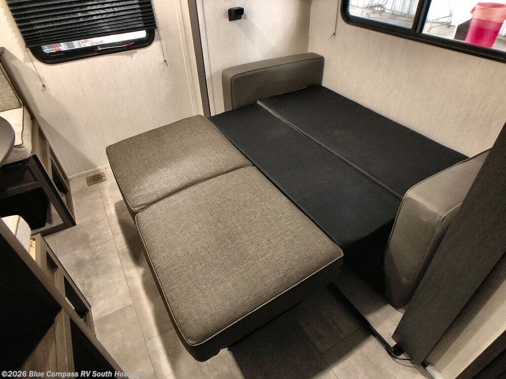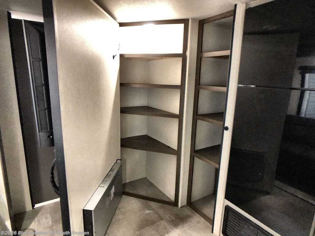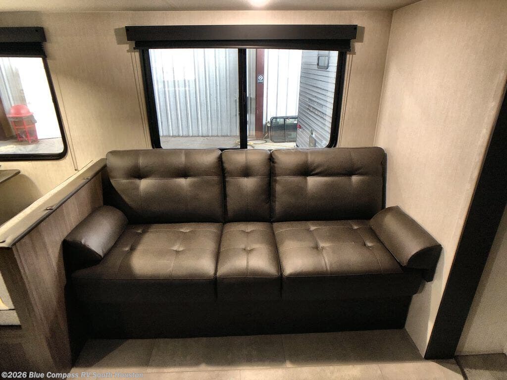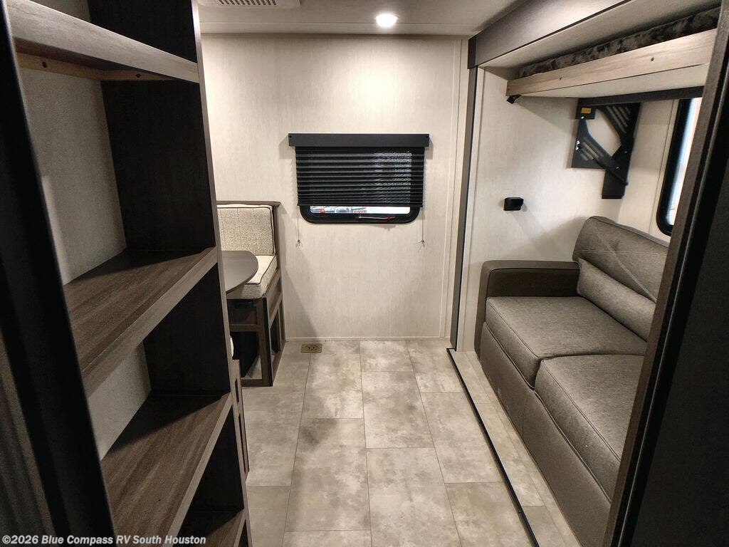 This travel trailer is the best option for a big family! The trailer boasts a spacious bunk bed above a sofa bed, providing ample sleeping space for kids and adults alike. The luxurious front king bed is a serene retreat, featuring expansive wardrobes and overhead cabinets for storing your essentials. The charming booth dinette is a cozy spot for meals or extra sleeping space, as well as the versatile jackknife sofa, which also provides additional sleeping space or a comfortable spot to relax. The sleek entertainment center is perfect for family movie nights. The well-appointed kitchen is equipped with a large fridge, convenient shelves, and a spacious pantry, making meal prep and storage an easy chore. The modern full bathroom features a well-stocked medicine cabinet. Plus, with two convenient entry/exit doors, this trailer offers added flexibility and ease of use, and the ample overhead cabinets provide additional storage space for your belongings.