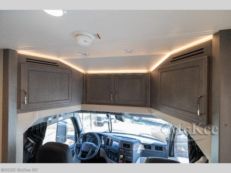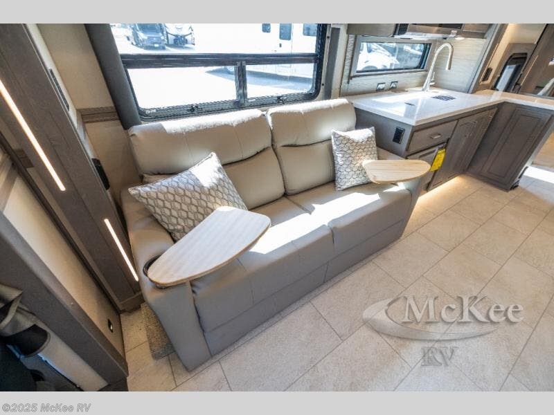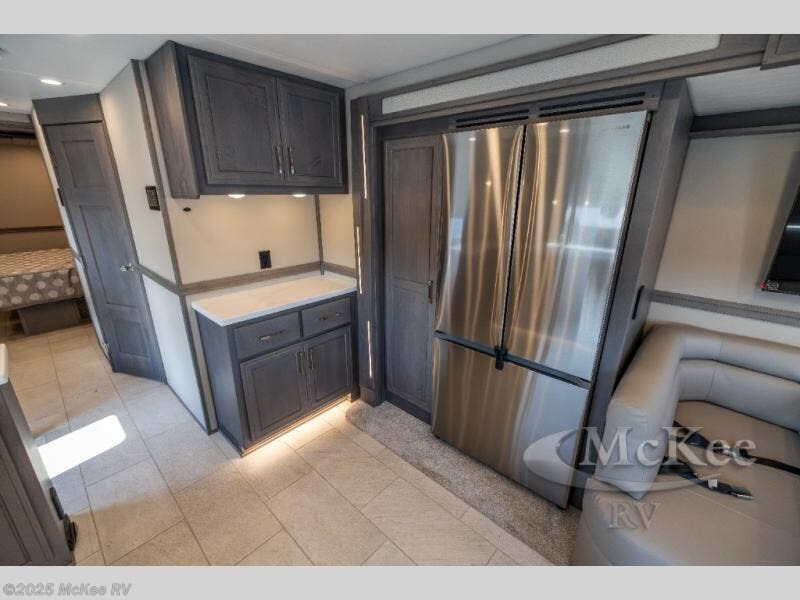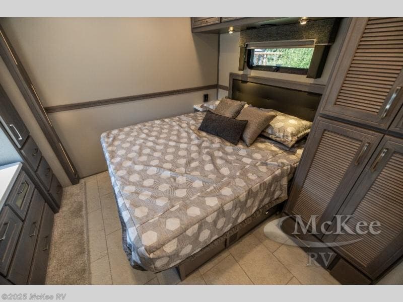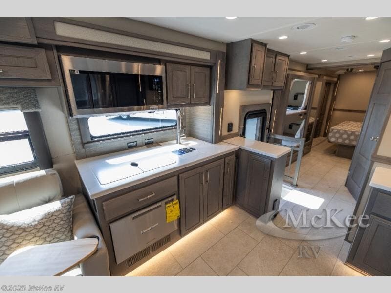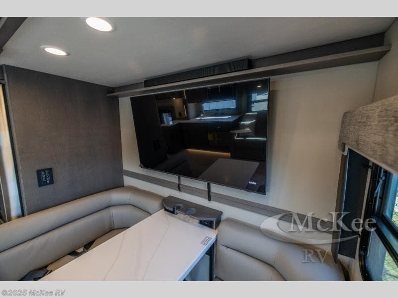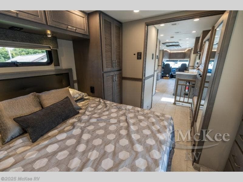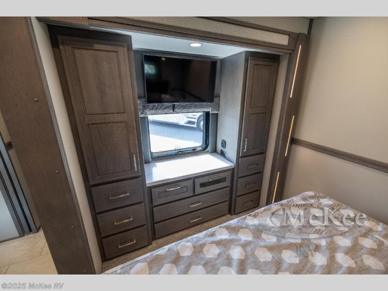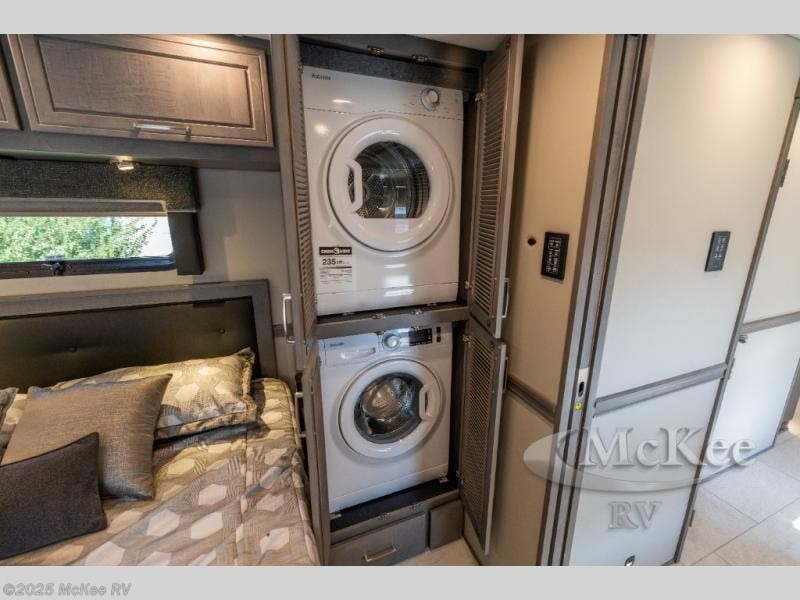 Designed for sophisticated travelers who demand the best, this motorhome is a safe bet! The rear bedroom is a serene sanctuary, featuring a majestic king-sized bed, a whisper-quiet ceiling fan, and a beautifully crafted dresser base. A stunning LED TV provides entertainment, and the area is prepped for a high-end washer and dryer. The full bathroom is equipped with premium fixtures and amenities, including a spacious linen closet for storing plush towels and essentials. The charming bunk beds provide a snug and inviting sleeping spot for kids, while generous overhead cabinets offer ample storage for clothes, toys, and personal items. The kitchen is a culinary haven, equipped with a high-capacity 18 cu. refrigerator, a precision-crafted microwave, and elegant storage solutions, including a stately hutch. The dinette provides a warm and welcoming spot for meals and snacks, and a brilliant LED TV entertains.