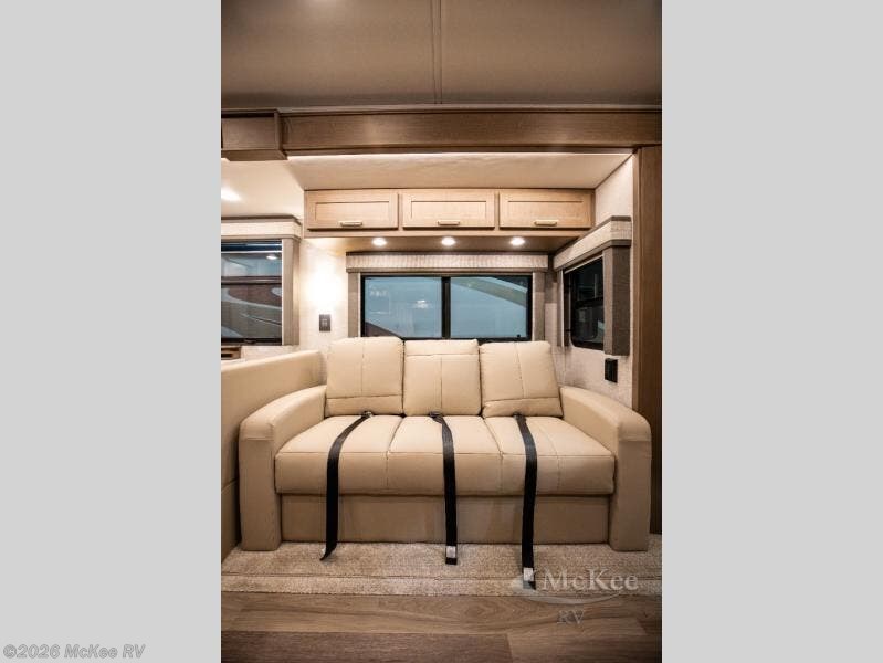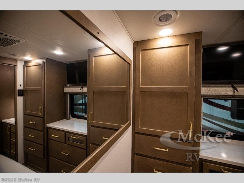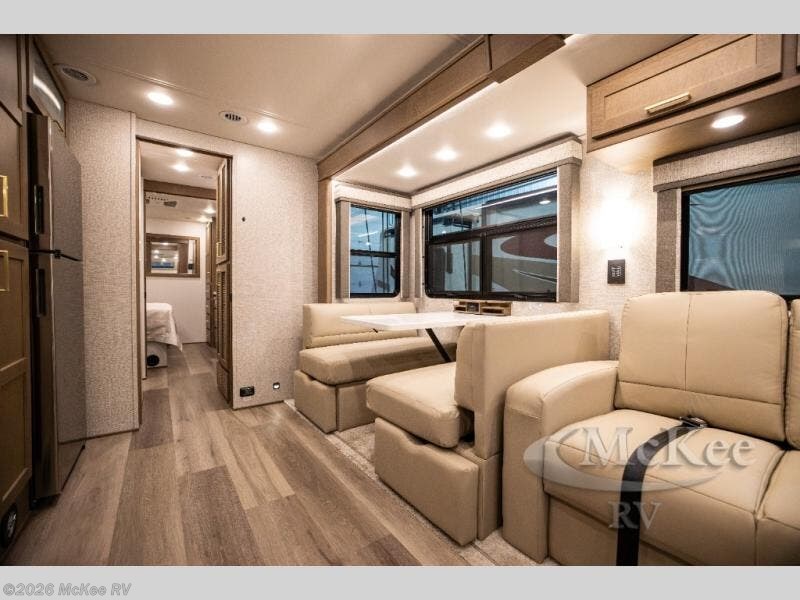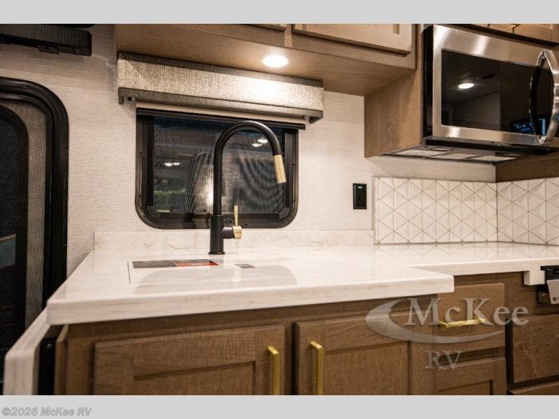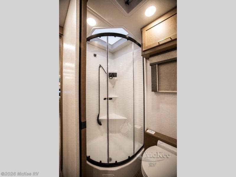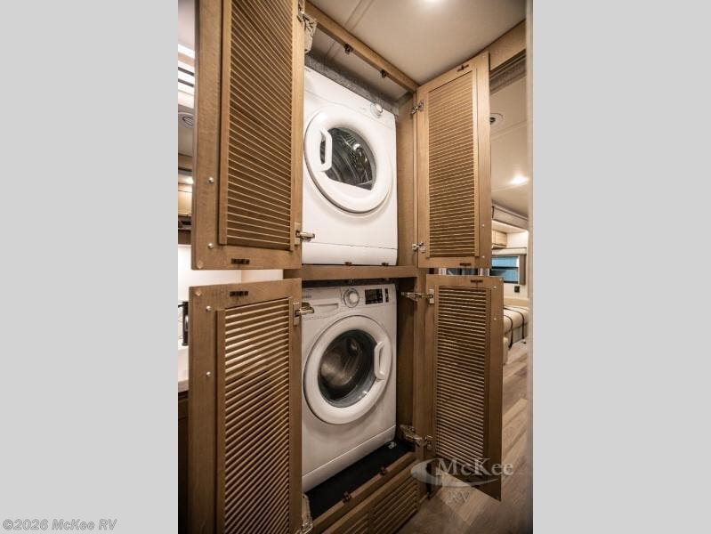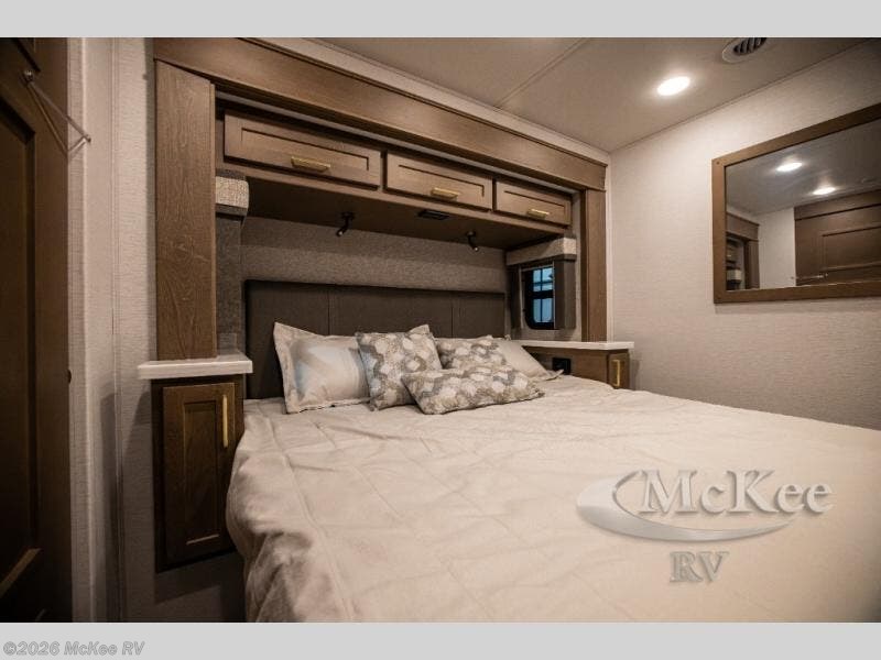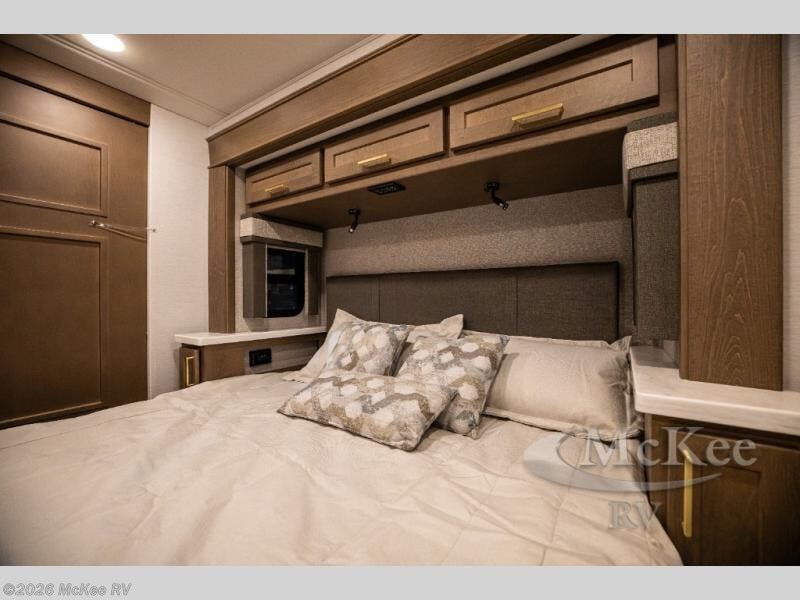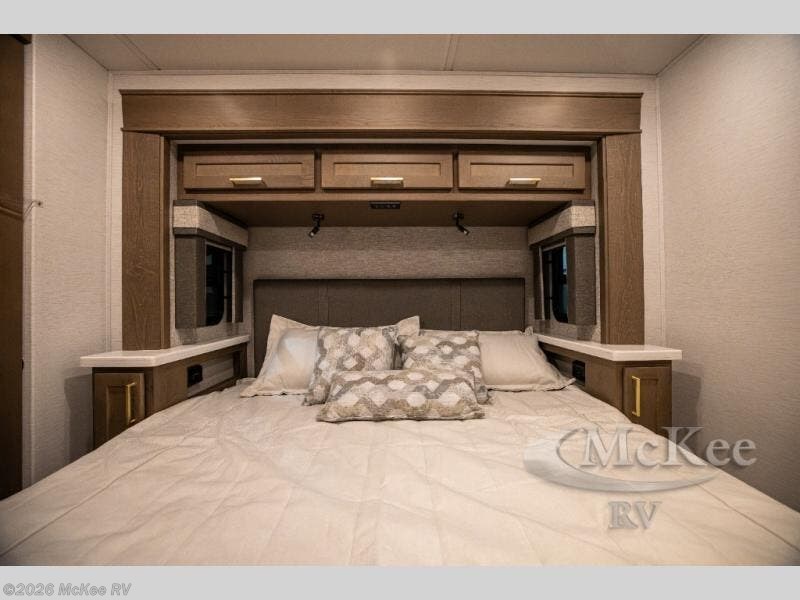 You will experience comfort and luxury with this motorhome! The rear private bedroom has a 66" x 74" mini-king bed across from a 32" Smart LED TV with a dresser below and closets on either side, plus it leads into the separated bathroom. The bathroom has a radius shower with a skylight above for natural lighting as you get ready and a closet that pre-wired and plumbed for an optional washer and dryer for clean clothes throughout your entire trip. The sofa sleeper and booth dinette offer a comfortable place to relax and convert to sleeping space. Grab a cold beverage from the 18 cu. ft. residential stainless steel refrigerator then head to the exterior entertainment center to watch the big game on the 32" Smart LED TV with a sound bar on a swivel and USB charging!