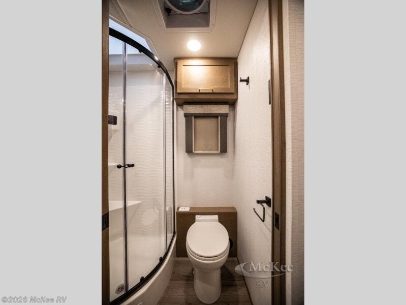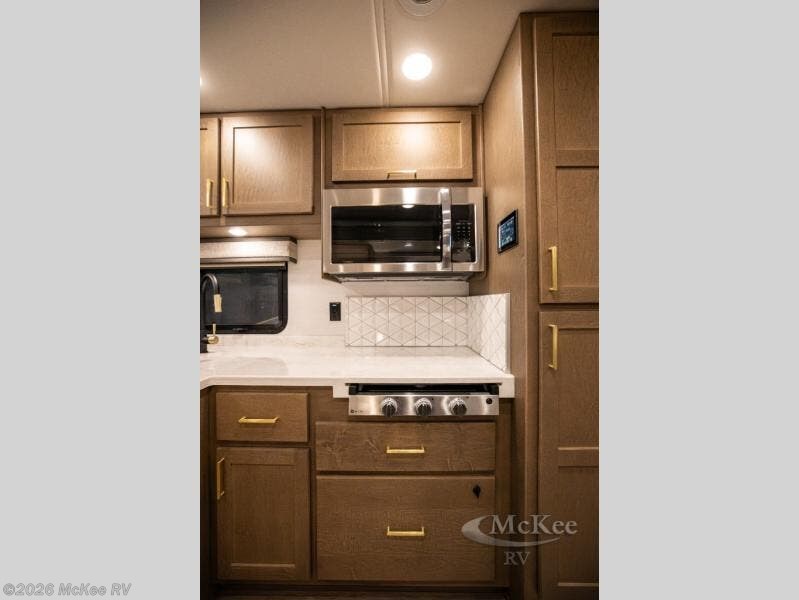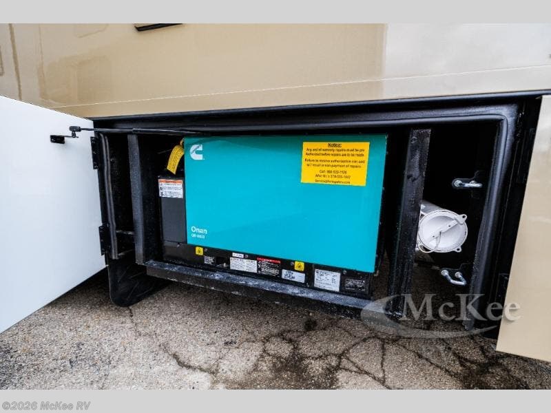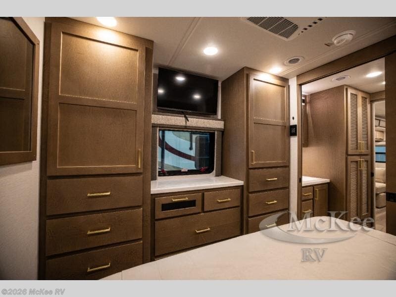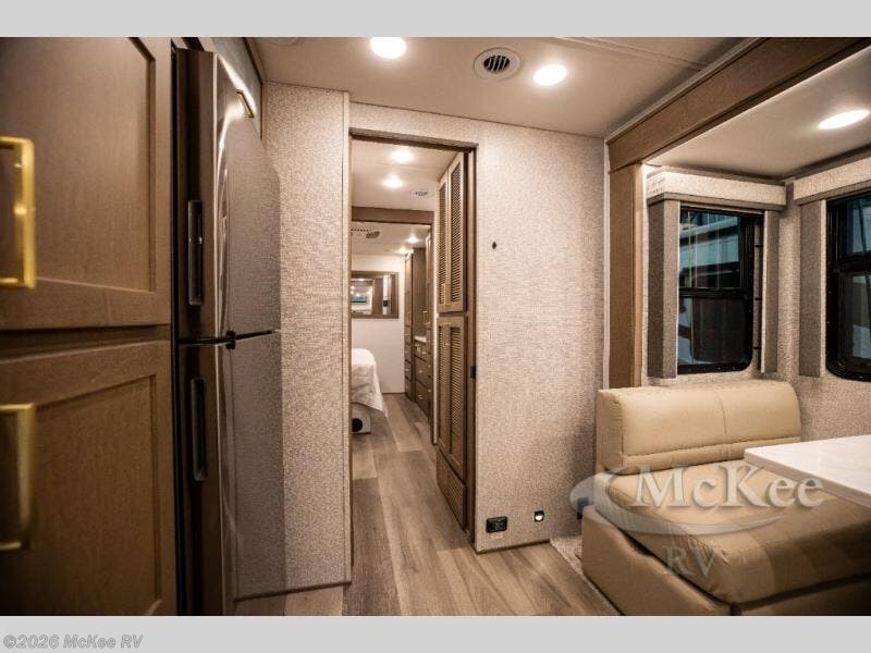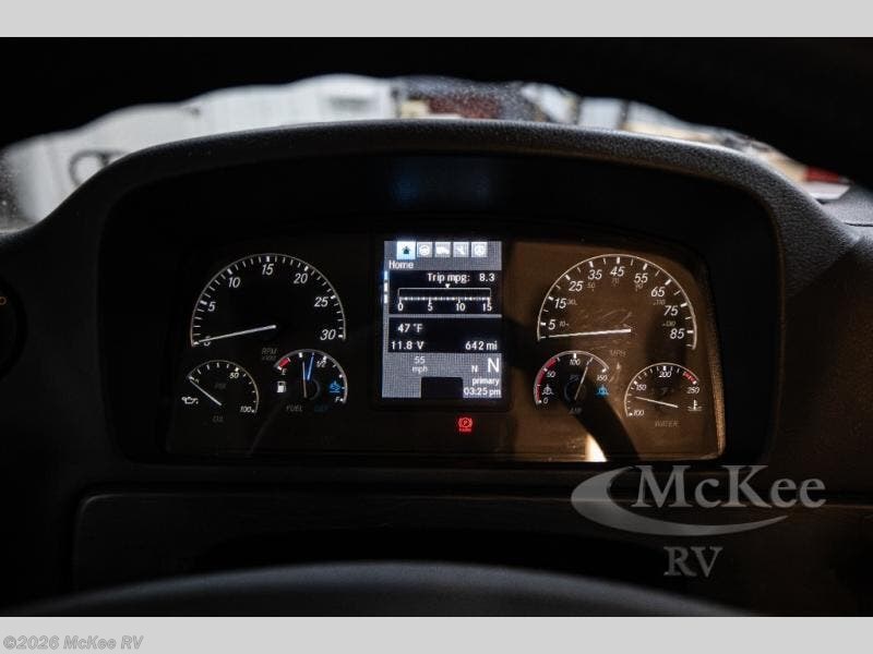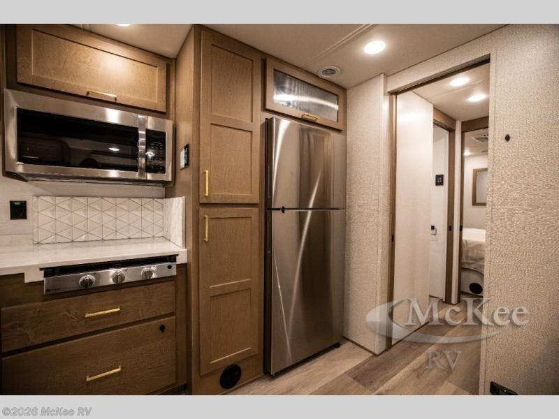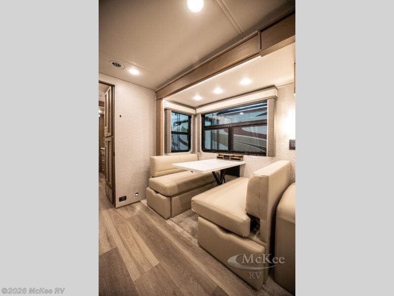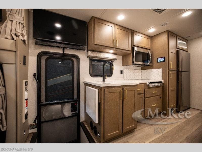 You will experience comfort and luxury with this motorhome! The rear private bedroom has a 66" x 74" mini-king bed across from a 32" Smart LED TV with a dresser below and closets on either side, plus it leads into the separated bathroom. The bathroom has a radius shower with a skylight above for natural lighting as you get ready and a closet that pre-wired and plumbed for an optional washer and dryer for clean clothes throughout your entire trip. The sofa sleeper and booth dinette offer a comfortable place to relax and convert to sleeping space. Grab a cold beverage from the 18 cu. ft. residential stainless steel refrigerator then head to the exterior entertainment center to watch the big game on the 32" Smart LED TV with a sound bar on a swivel and USB charging!