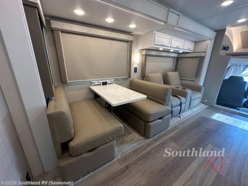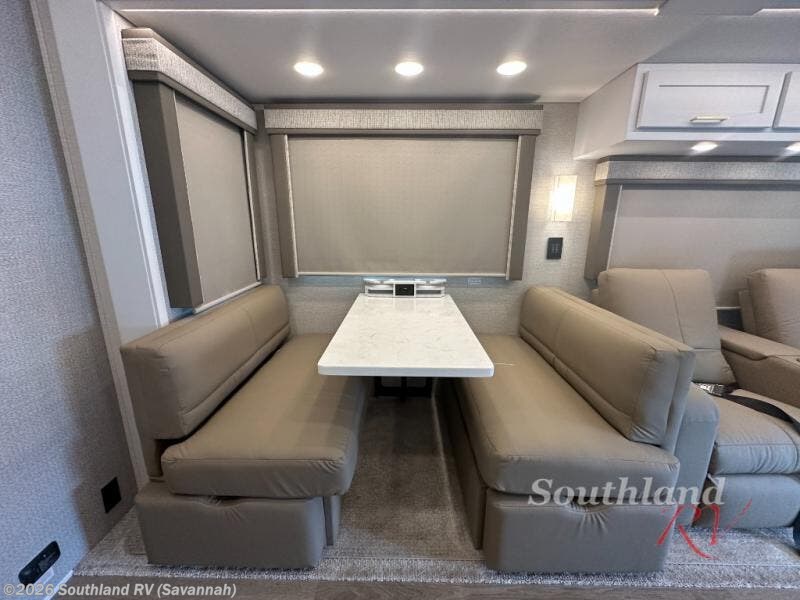 You will experience comfort and luxury with this motorhome! The rear private bedroom has a 66" x 74" mini-king bed across from a 32" Smart LED TV with a dresser below and closets on either side, plus it leads into the separated bathroom. The bathroom has a radius shower with a skylight above for natural lighting as you get ready and a closet that pre-wired and plumbed for an optional washer and dryer for clean clothes throughout your entire trip. The sofa sleeper and booth dinette offer a comfortable place to relax and convert to sleeping space. Grab a cold beverage from the 18 cu. ft. residential stainless steel refrigerator then head to the exterior entertainment center to watch the big game on the 32" Smart LED TV with a sound bar on a swivel and USB charging!
