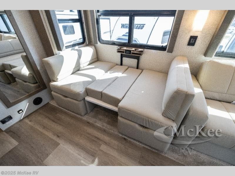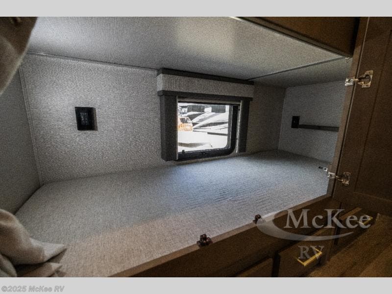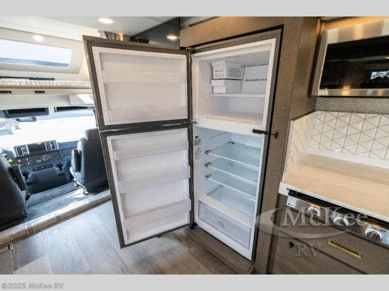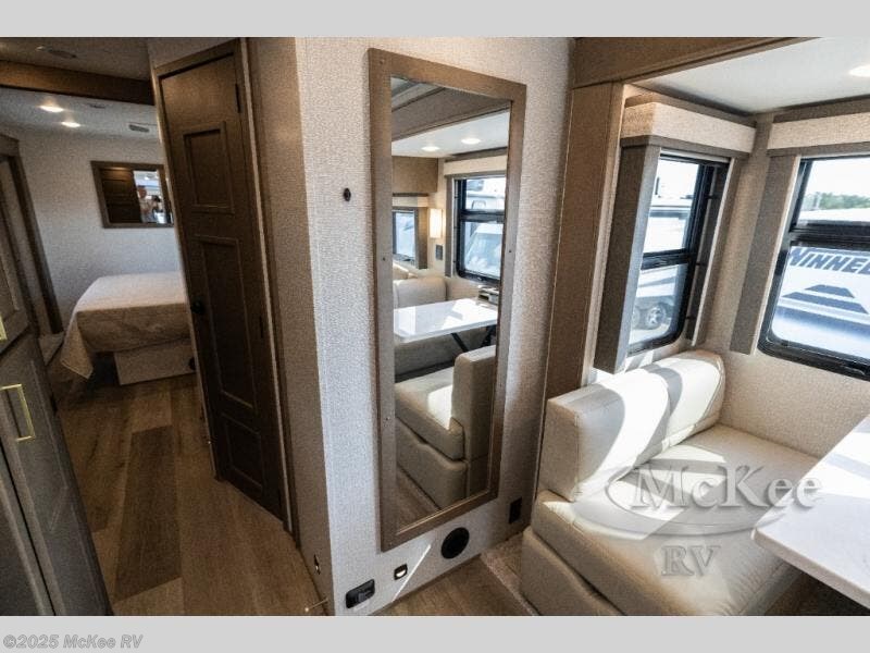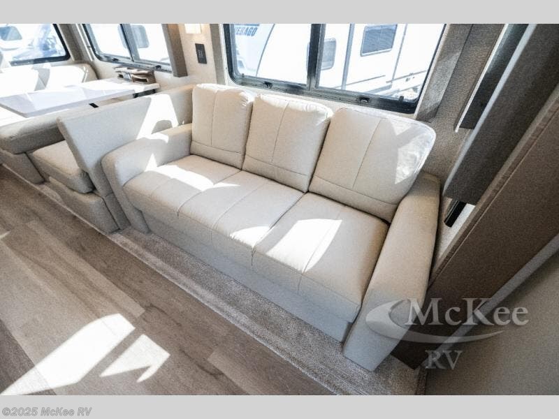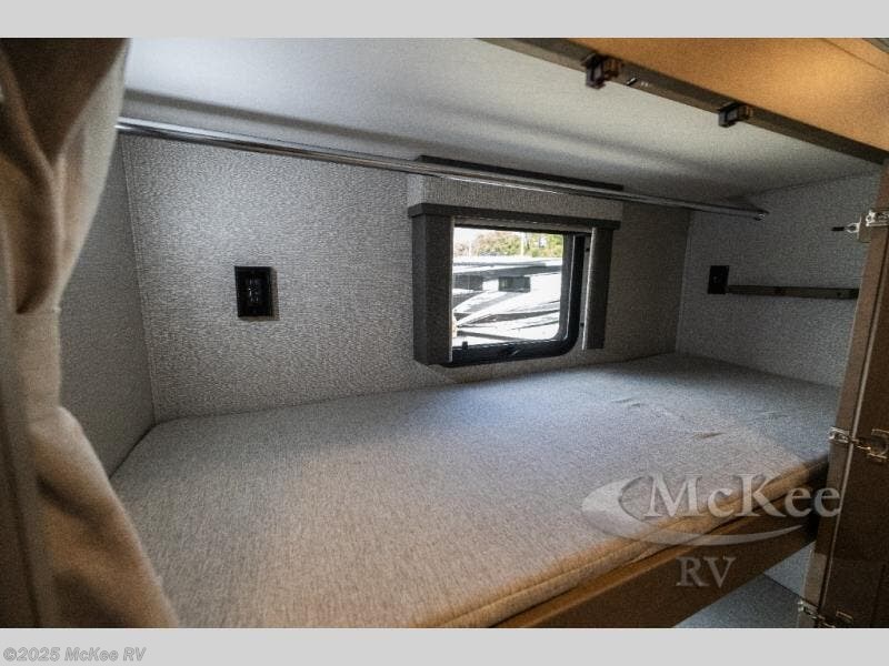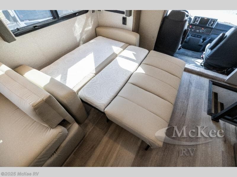 Pack your bags and load up this motorhome for a luxurious road trip! The rear private bedroom has a 66" x 74" mini-king bed to lay your head on at night, a dresser base with a 32" Smart LED TV above it, and closets on either side of it. Your kiddos or guests can sleep on the set of 30" x 76" bunk beds and the 54" x 78" bunk over cab. Or utilize the sofa sleeper and the booth dinette which convert to even more sleeping spaces. Create your best meals with the three burner cooktop and keep your perishables fresh with the 18 cu. ft. stainless steel residential refrigerator. And you will love having a mid bath for easy use!