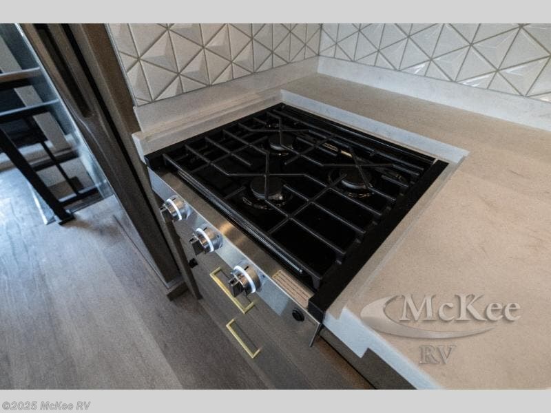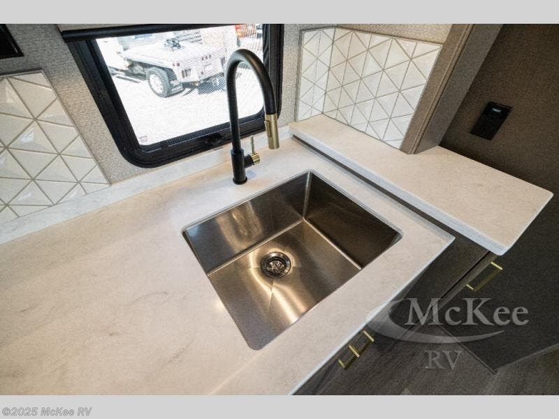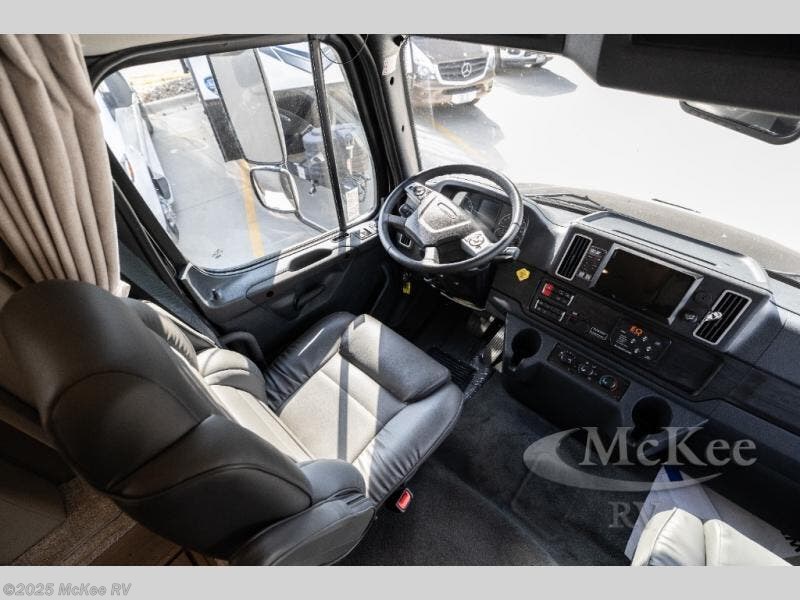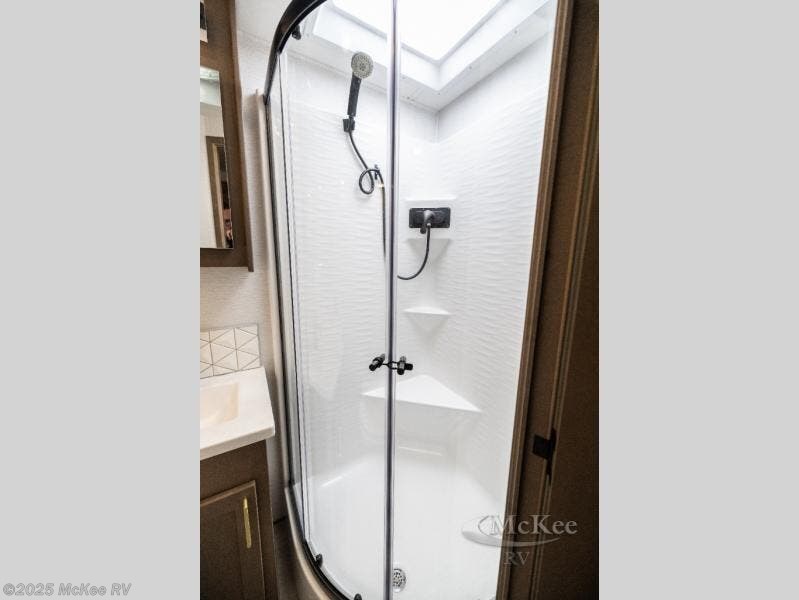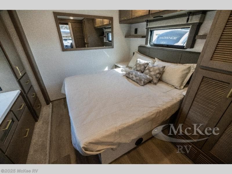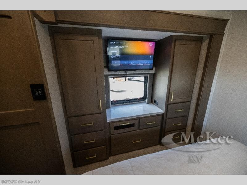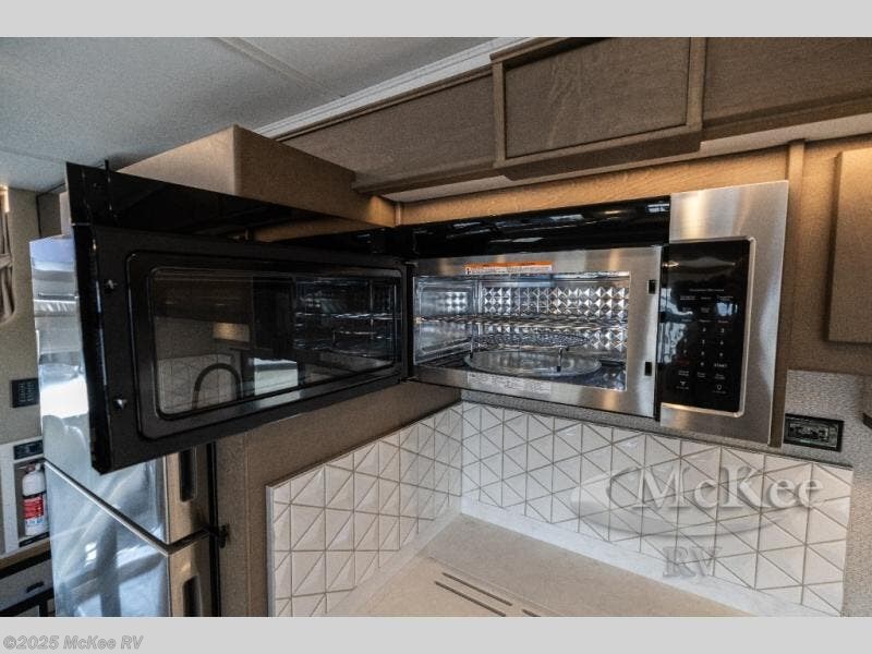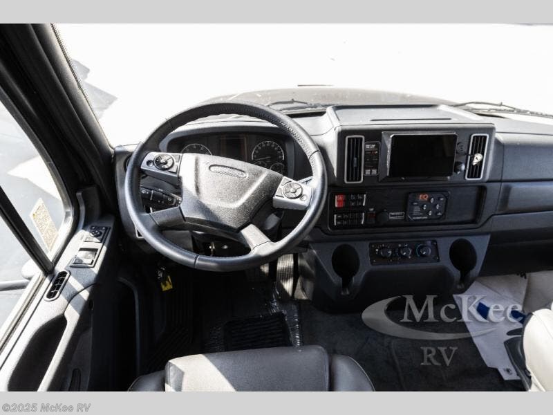 Pack your bags and load up this motorhome for a luxurious road trip! The rear private bedroom has a 66" x 74" mini-king bed to lay your head on at night, a dresser base with a 32" Smart LED TV above it, and closets on either side of it. Your kiddos or guests can sleep on the set of 30" x 76" bunk beds and the 54" x 78" bunk over cab. Or utilize the sofa sleeper and the booth dinette which convert to even more sleeping spaces. Create your best meals with the three burner cooktop and keep your perishables fresh with the 18 cu. ft. stainless steel residential refrigerator. And you will love having a mid bath for easy use!