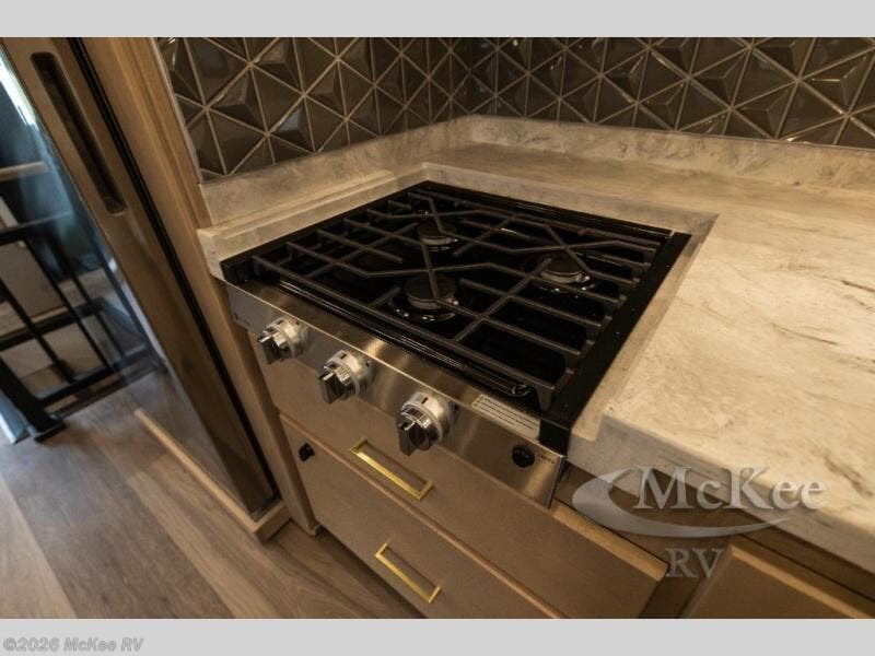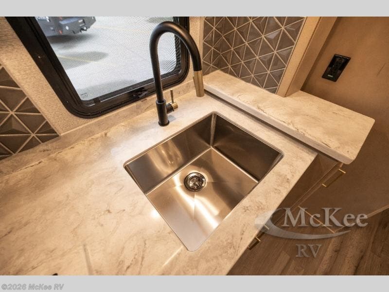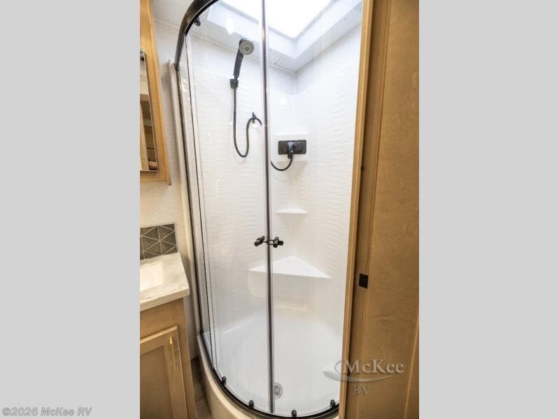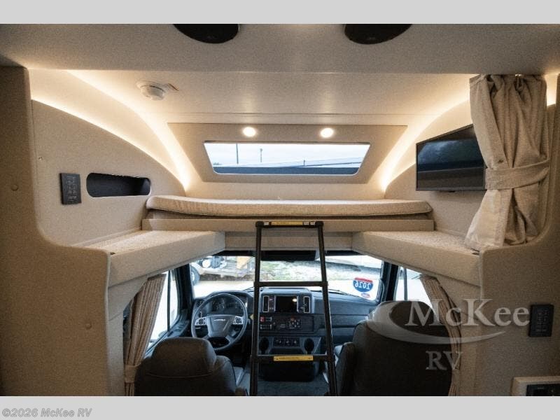 Pack your bags and load up this motorhome for a luxurious road trip! The rear private bedroom has a 66" x 74" mini-king bed to lay your head on at night, a dresser base with a 32" Smart LED TV above it, and closets on either side of it. Your kiddos or guests can sleep on the set of 30" x 76" bunk beds and the 54" x 78" bunk over cab. Or utilize the sofa sleeper and the booth dinette which convert to even more sleeping spaces. Create your best meals with the three burner cooktop and keep your perishables fresh with the 18 cu. ft. stainless steel residential refrigerator. And you will love having a mid bath for easy use!