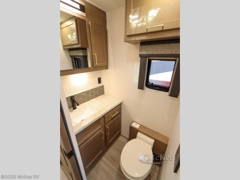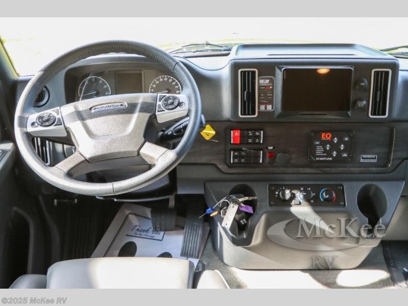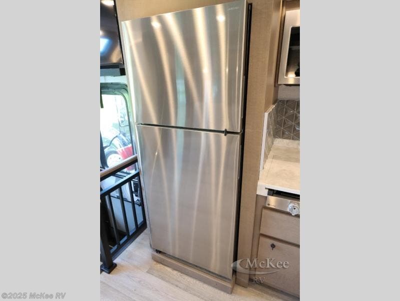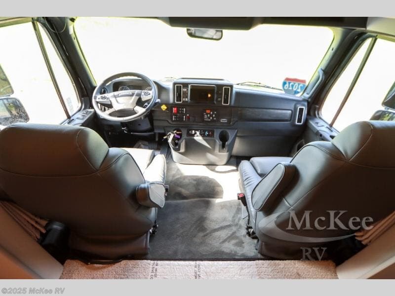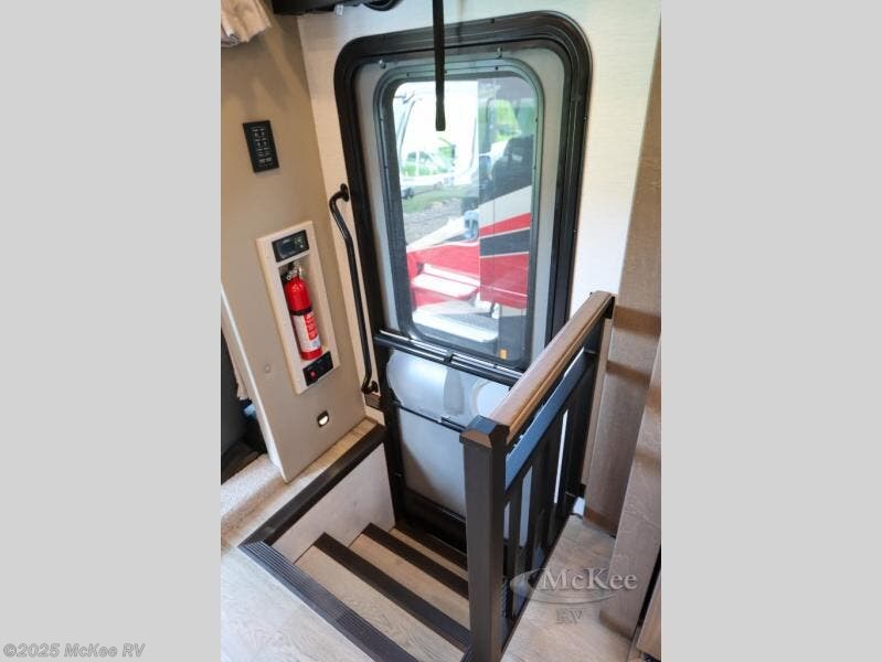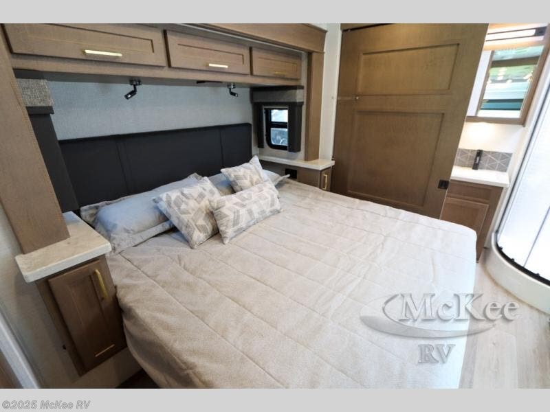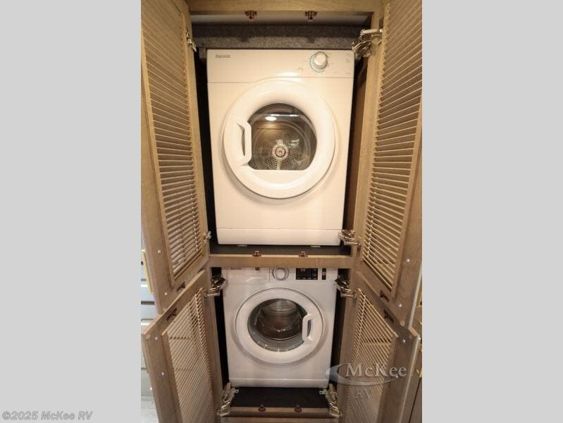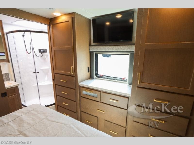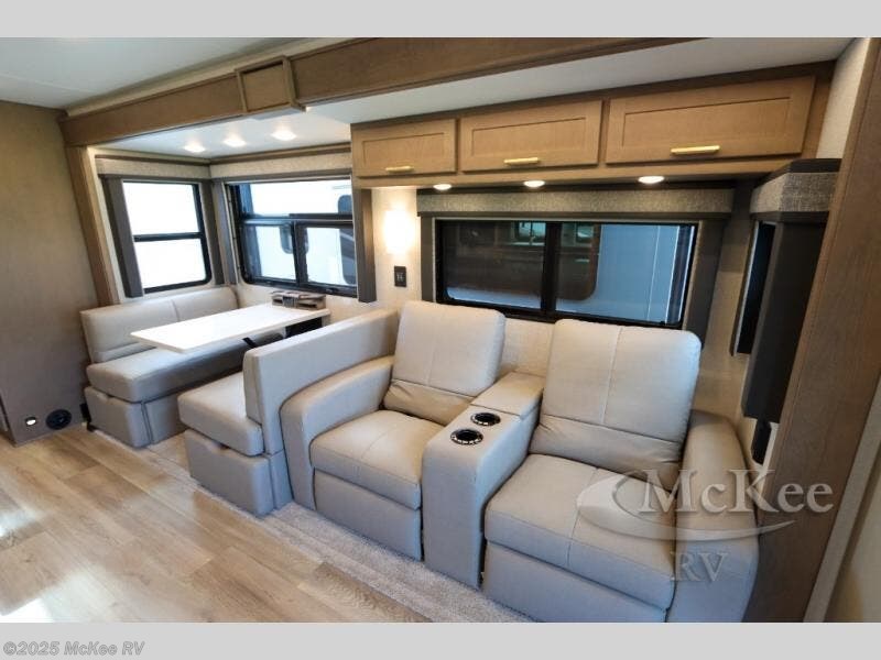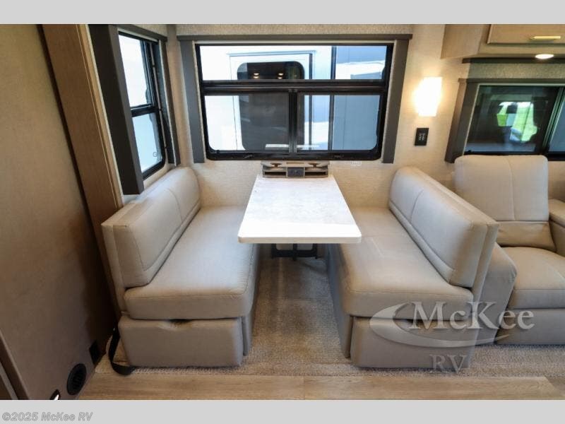 Start traveling the right way with this motorhome! There is plenty of entertainment throughout the inside and outside between the exterior entertainment center with a 32" Smart LED TV, a 42" Smart LED TV in the living area, and a 32" Smart LED TV in the private bedroom. Across from the half bathroom is an area pre-wired and plumbed for an optional washer and dryer so you can have clean clothes for your entire trip if you choose. The master suite has a 66" x 74" mini-king bed to lay your head on at night and access to the full rear bathroom which has a radius shower with a skylight above for natural lighting and overhead cabinets to store your toiletries. The sofa sleeper and booth dinette offer comfortable places to enjoy meals, socialize, and even transform into sleeping spaces!