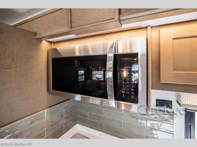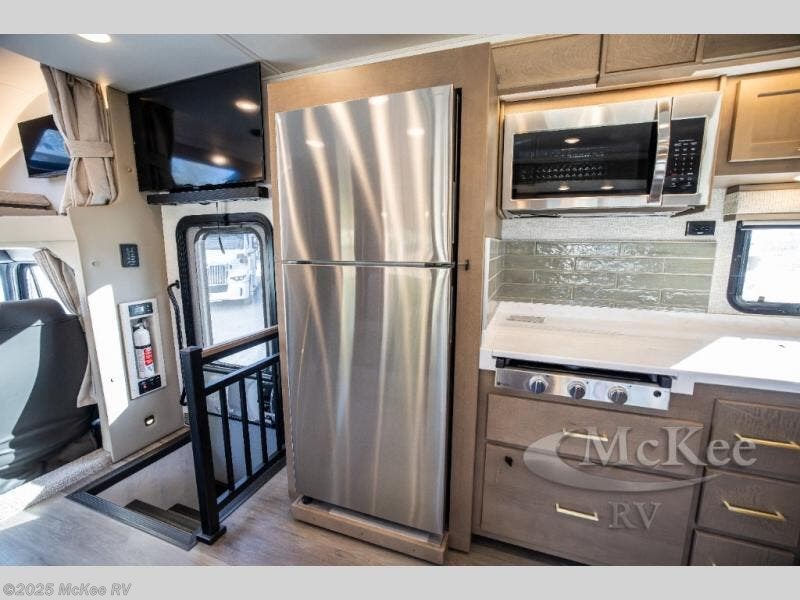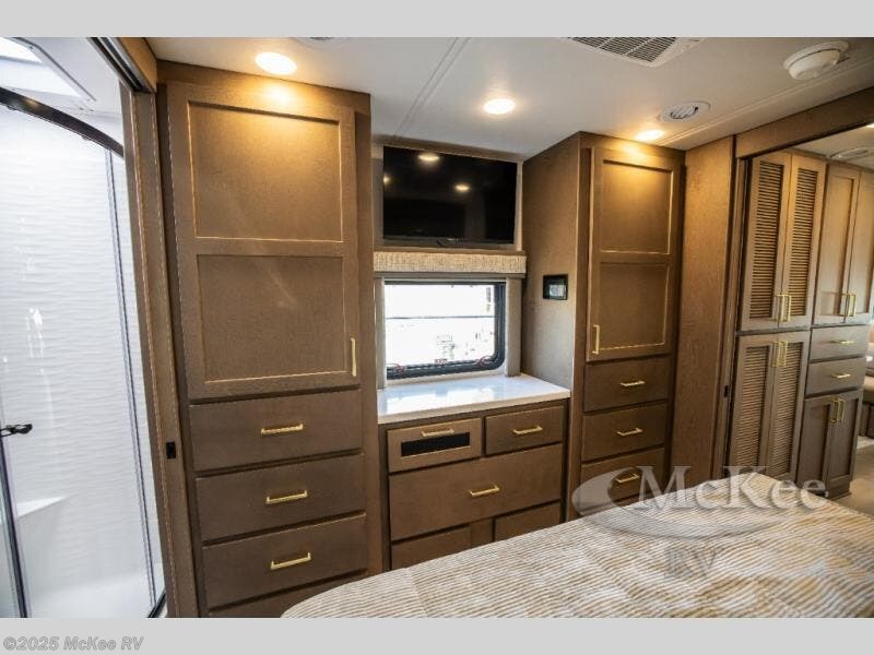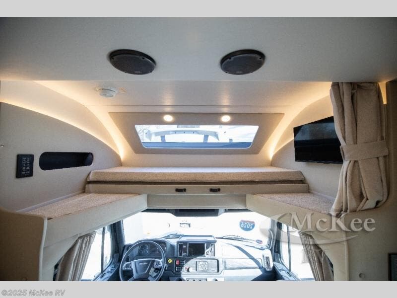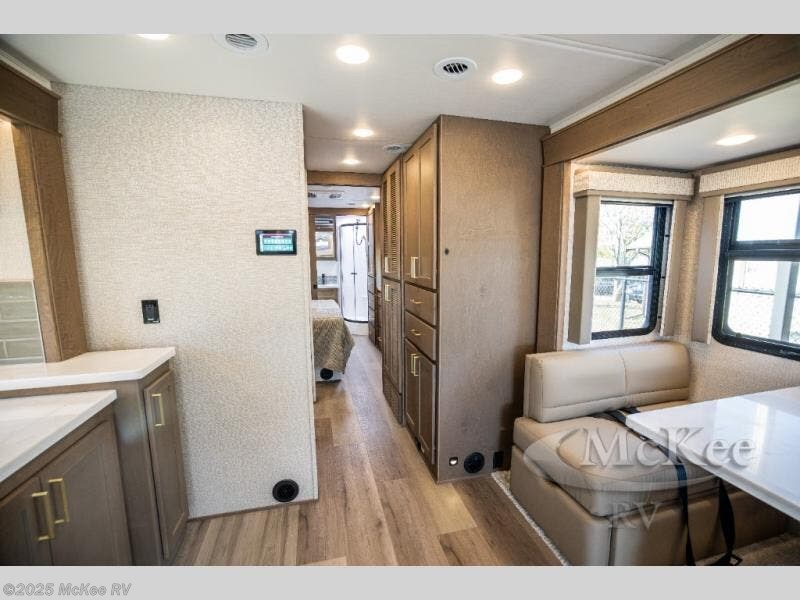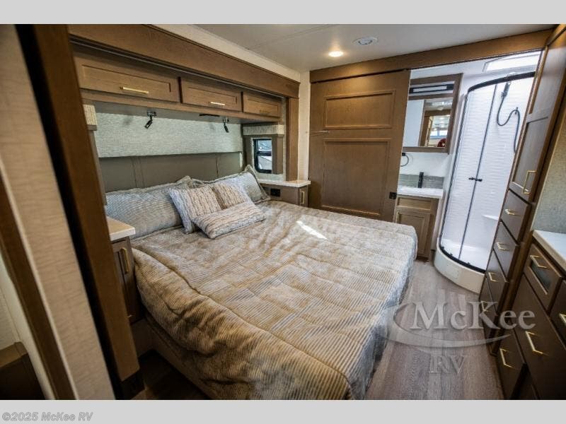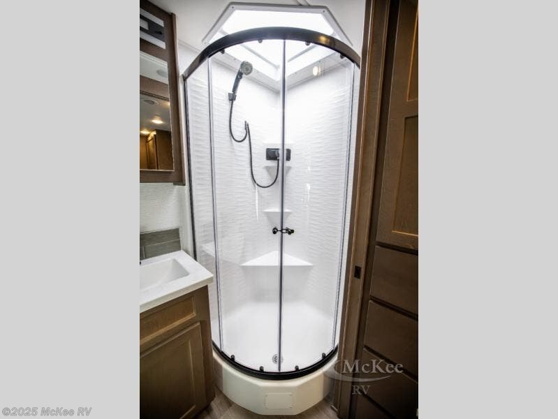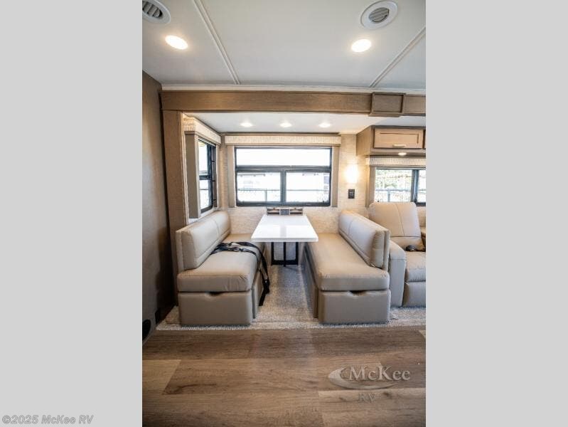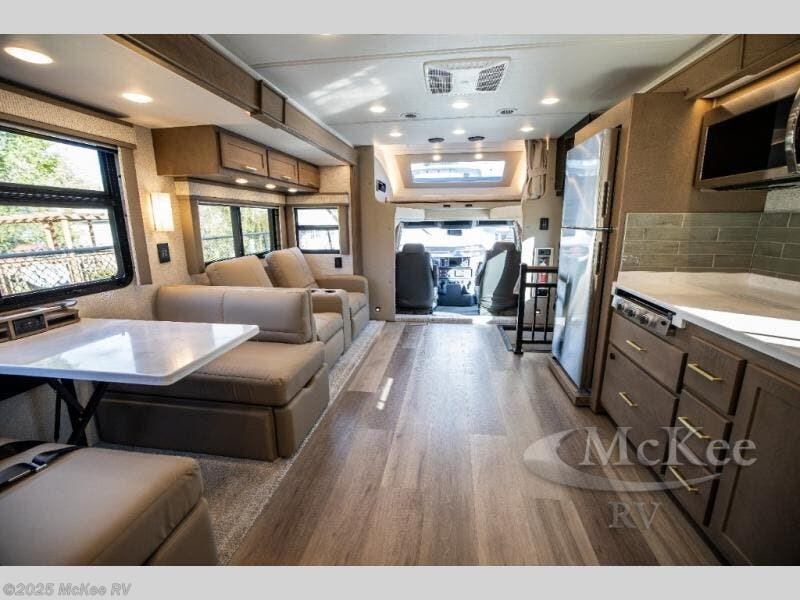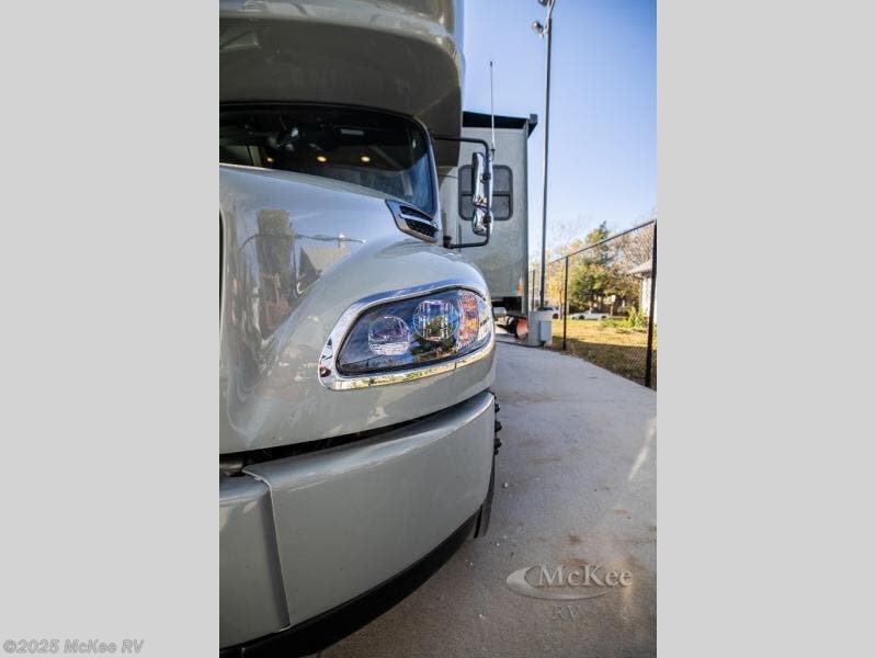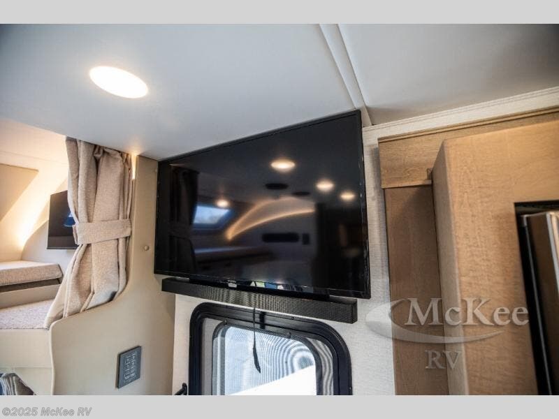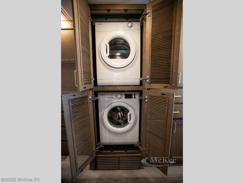 Start traveling the right way with this motorhome! There is plenty of entertainment throughout the inside and outside between the exterior entertainment center with a 32" Smart LED TV, a 42" Smart LED TV in the living area, and a 32" Smart LED TV in the private bedroom. Across from the half bathroom is an area pre-wired and plumbed for an optional washer and dryer so you can have clean clothes for your entire trip if you choose. The master suite has a 66" x 74" mini-king bed to lay your head on at night and access to the full rear bathroom which has a radius shower with a skylight above for natural lighting and overhead cabinets to store your toiletries. The sofa sleeper and booth dinette offer comfortable places to enjoy meals, socialize, and even transform into sleeping spaces!