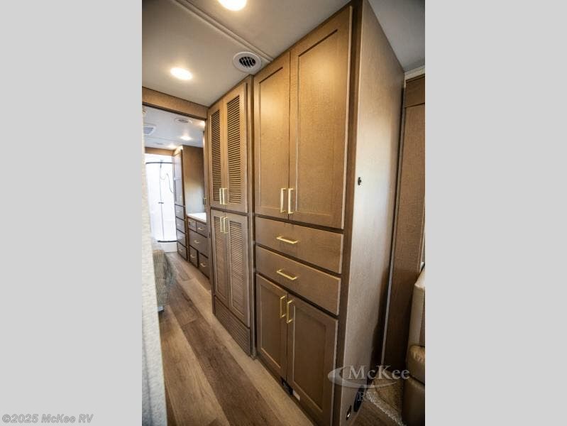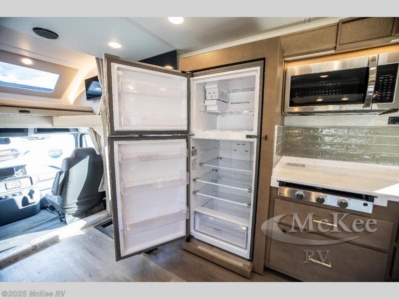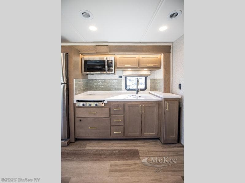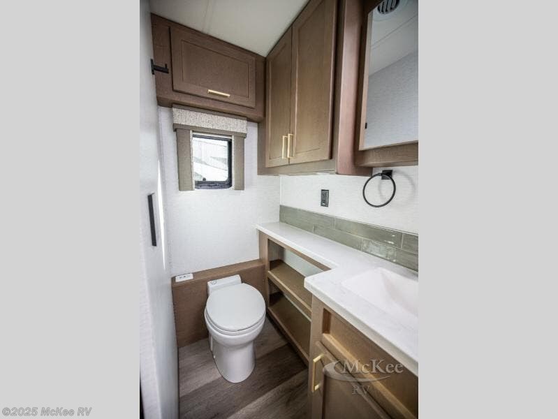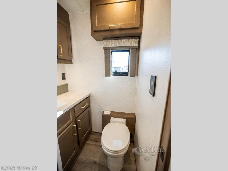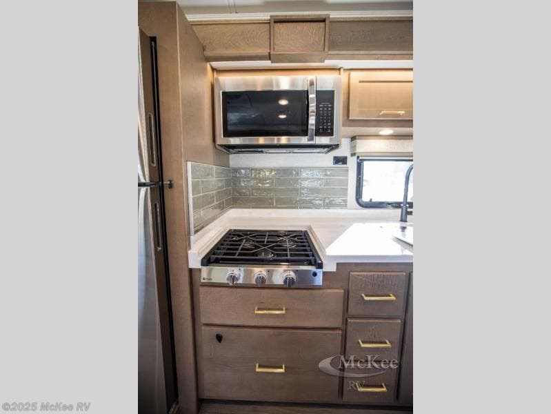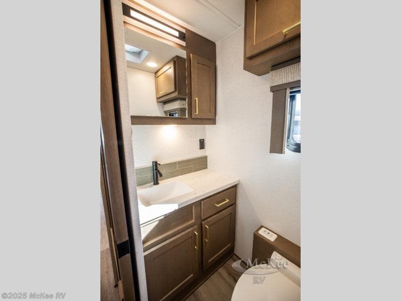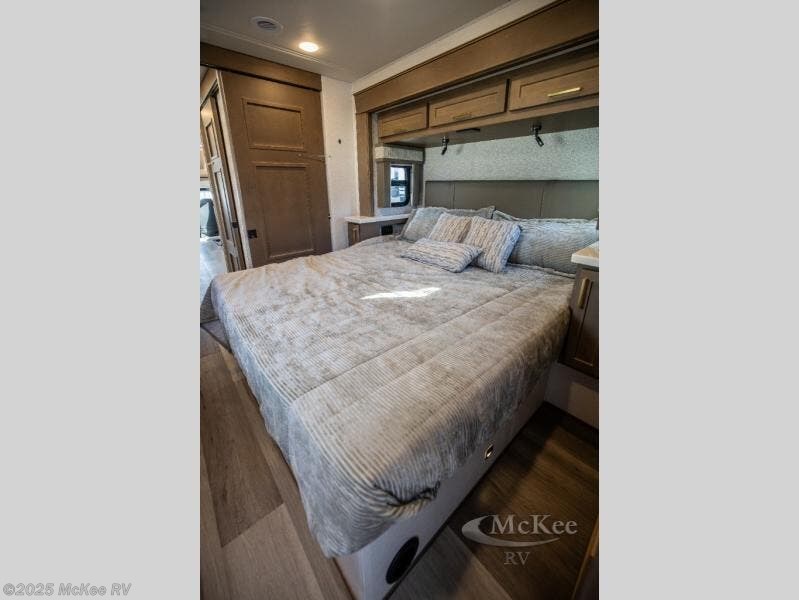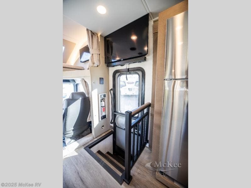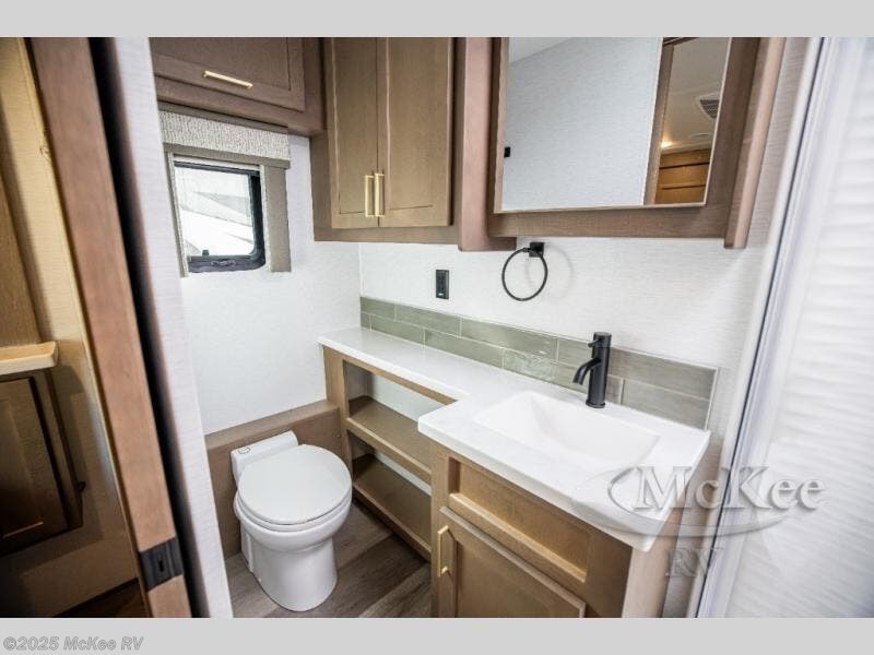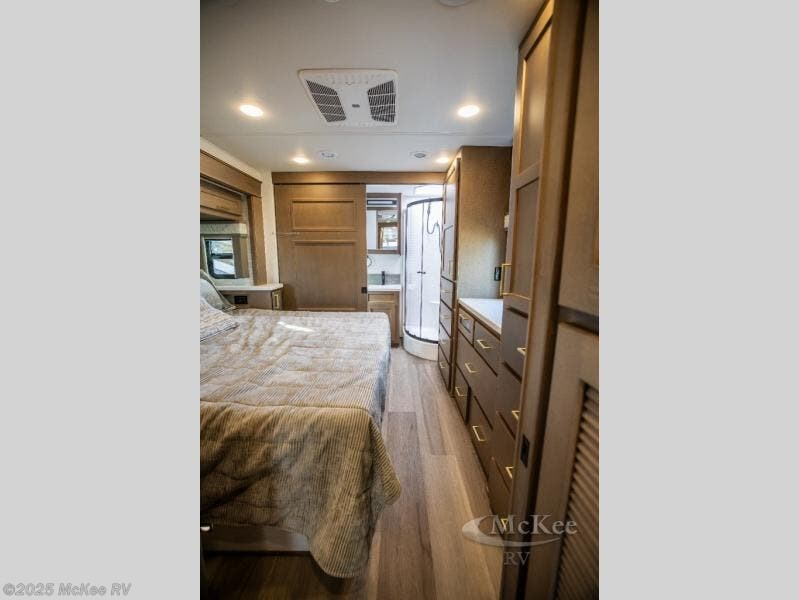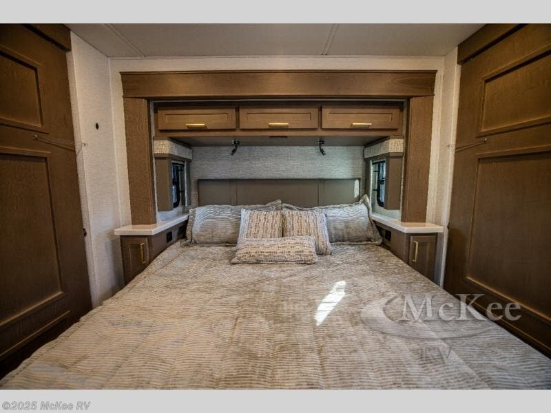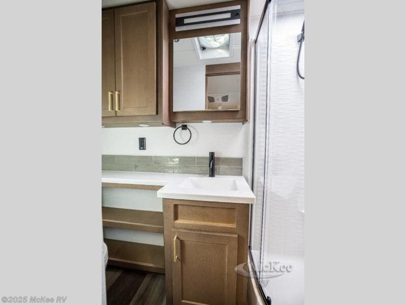 Start traveling the right way with this motorhome! There is plenty of entertainment throughout the inside and outside between the exterior entertainment center with a 32" Smart LED TV, a 42" Smart LED TV in the living area, and a 32" Smart LED TV in the private bedroom. Across from the half bathroom is an area pre-wired and plumbed for an optional washer and dryer so you can have clean clothes for your entire trip if you choose. The master suite has a 66" x 74" mini-king bed to lay your head on at night and access to the full rear bathroom which has a radius shower with a skylight above for natural lighting and overhead cabinets to store your toiletries. The sofa sleeper and booth dinette offer comfortable places to enjoy meals, socialize, and even transform into sleeping spaces!