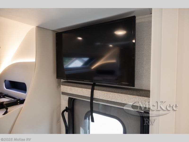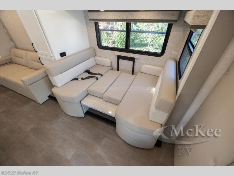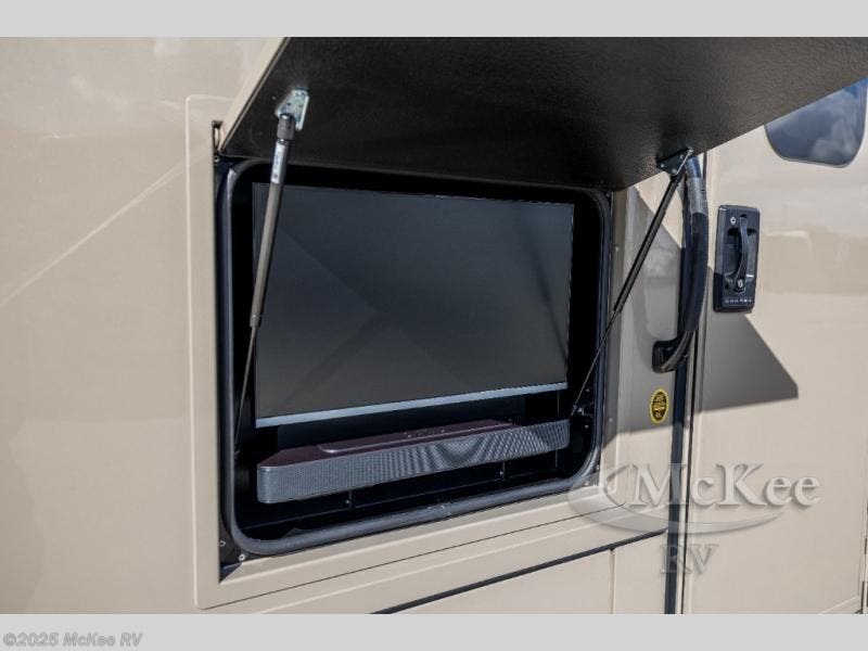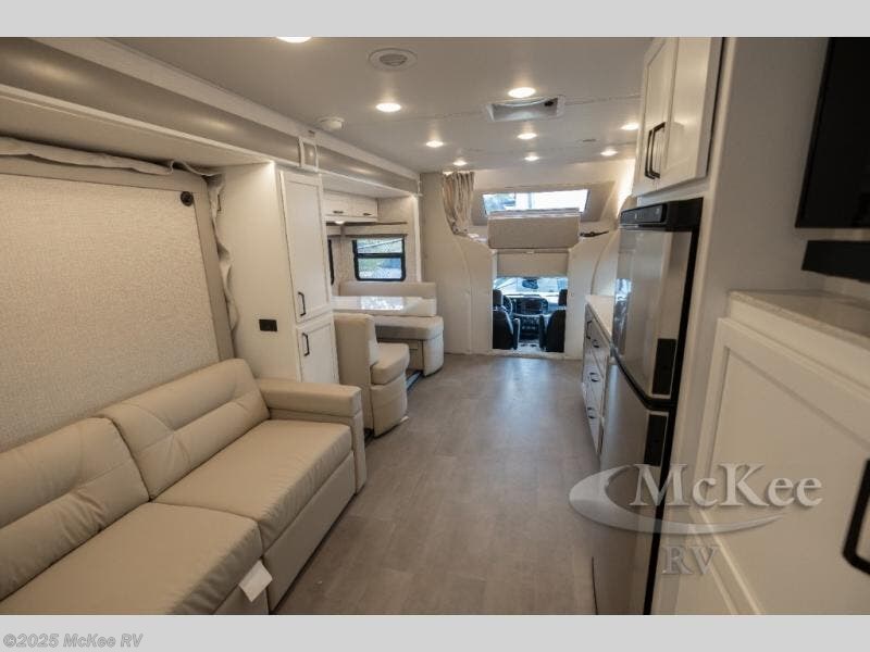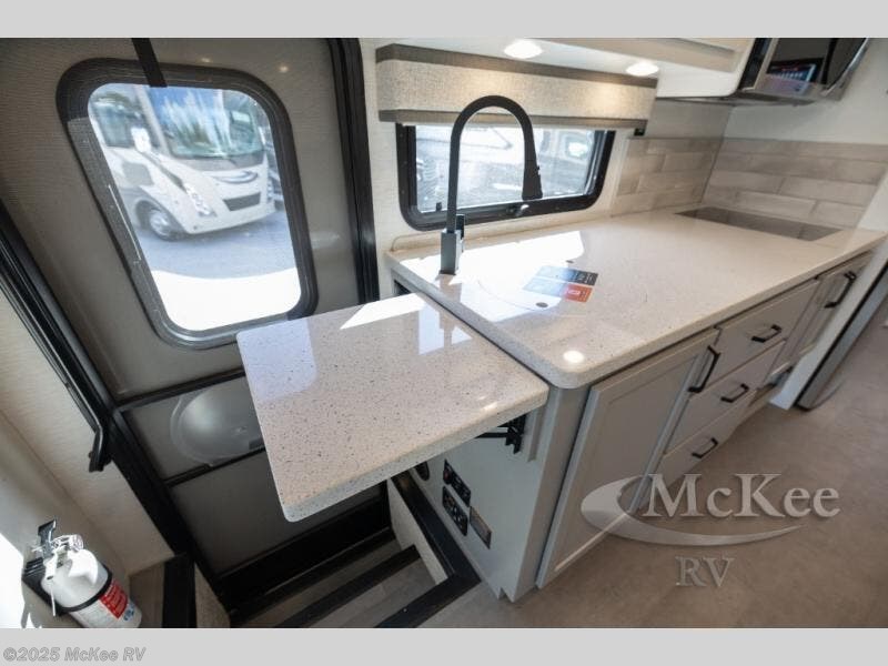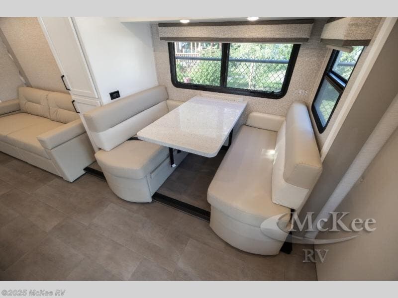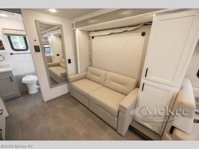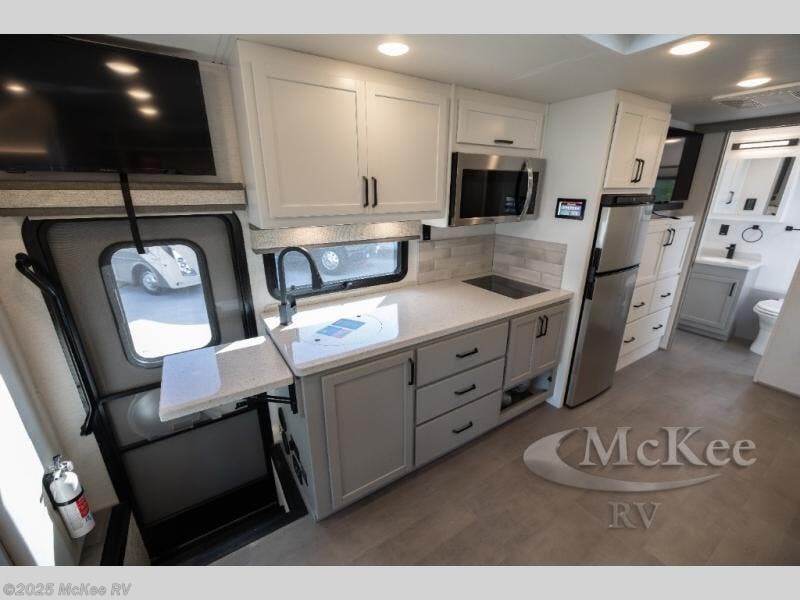 Travel the countryside with the ones you love in this motorhome! It features a full rear bathroom to freshen up in each morning and a wardrobe to keep your linens close. There is versatility when it comes to sleeping spaces between the Murphy bed with a 65" x 72" mattress to sleep on and a jiffy sofa to sit on during the day, the dinette, and the bunk over cab. The kitchen has been beautifully redesigned with maple hardwood cabinets, solid surface countertops, extra space provided by the bed and dinette slide, and storage above the sink, as well as storage behind the 39" Smart LED TV, a pantry, and a 10 cu. ft. refrigerator to keep your perishables fresh. You'll also find a second TV about the entry for even more entertainment!