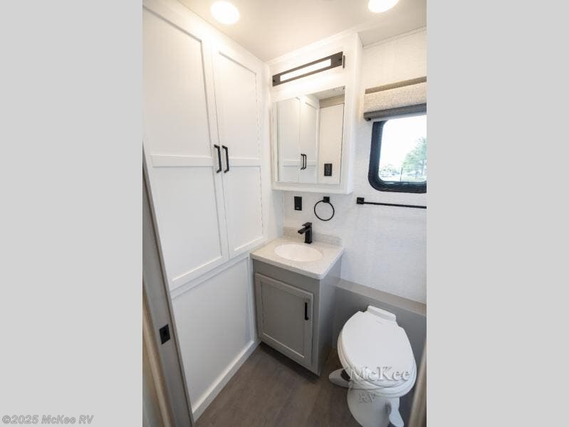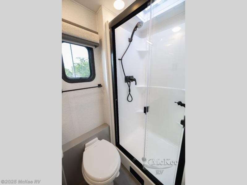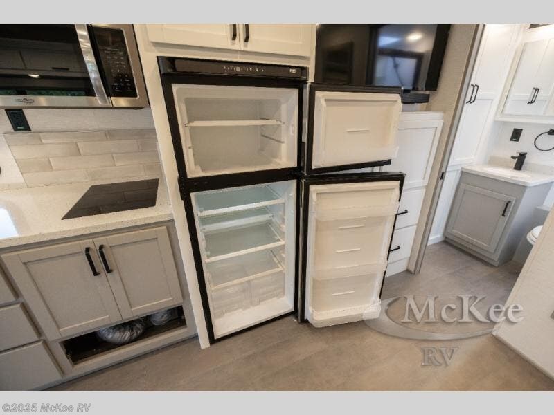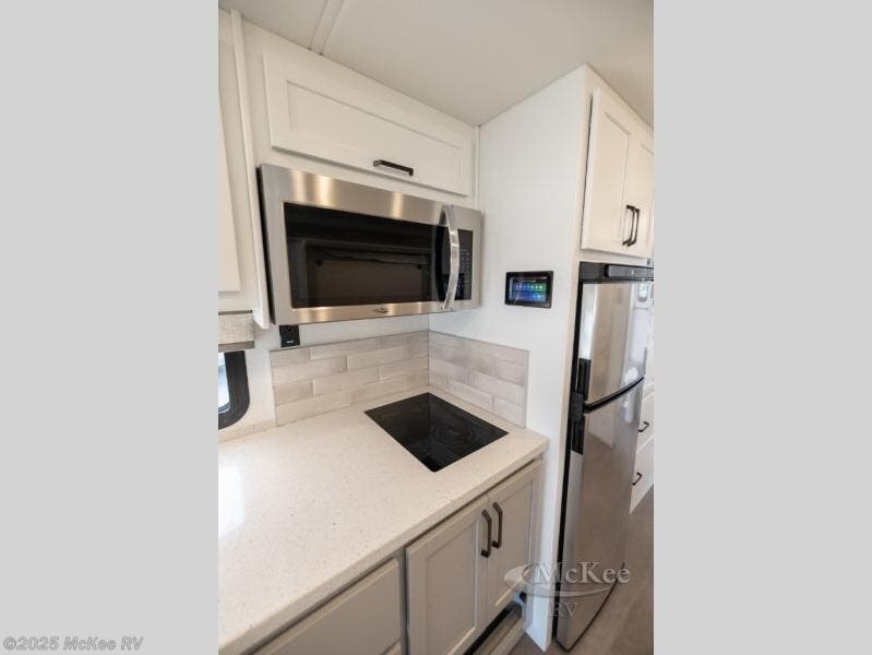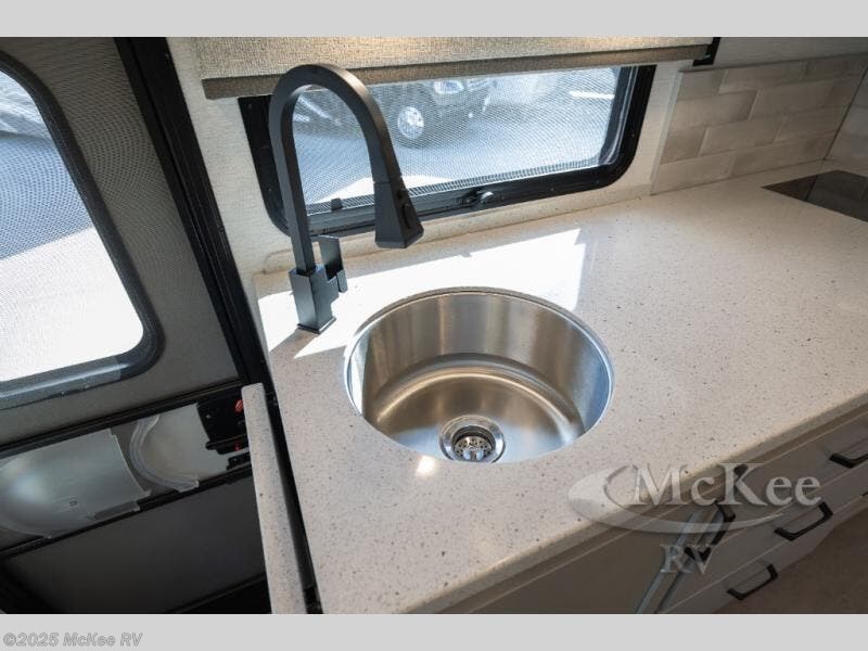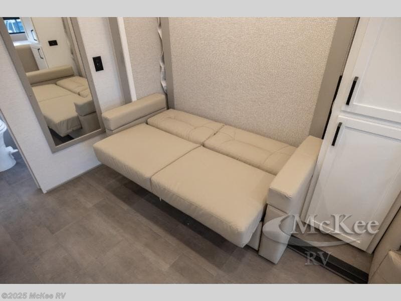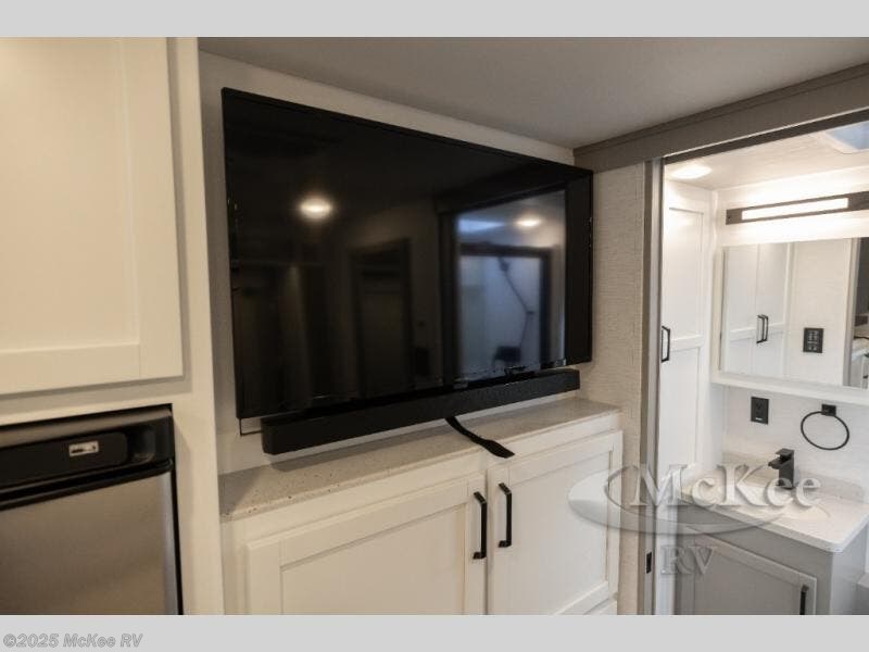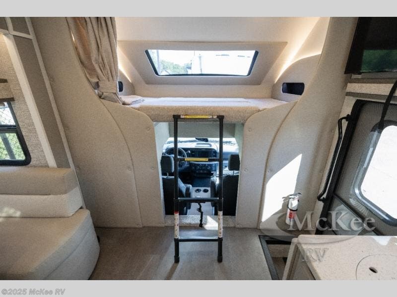 Travel the countryside with the ones you love in this motorhome! It features a full rear bathroom to freshen up in each morning and a wardrobe to keep your linens close. There is versatility when it comes to sleeping spaces between the Murphy bed with a 65" x 72" mattress to sleep on and a jiffy sofa to sit on during the day, the dinette, and the bunk over cab. The kitchen has been beautifully redesigned with maple hardwood cabinets, solid surface countertops, extra space provided by the bed and dinette slide, and storage above the sink, as well as storage behind the 39" Smart LED TV, a pantry, and a 10 cu. ft. refrigerator to keep your perishables fresh. You'll also find a second TV about the entry for even more entertainment!