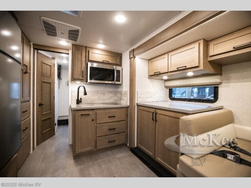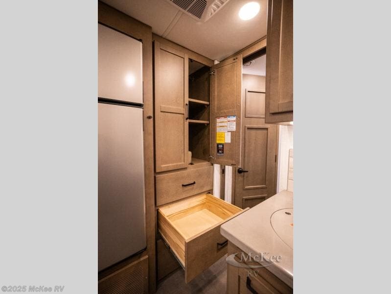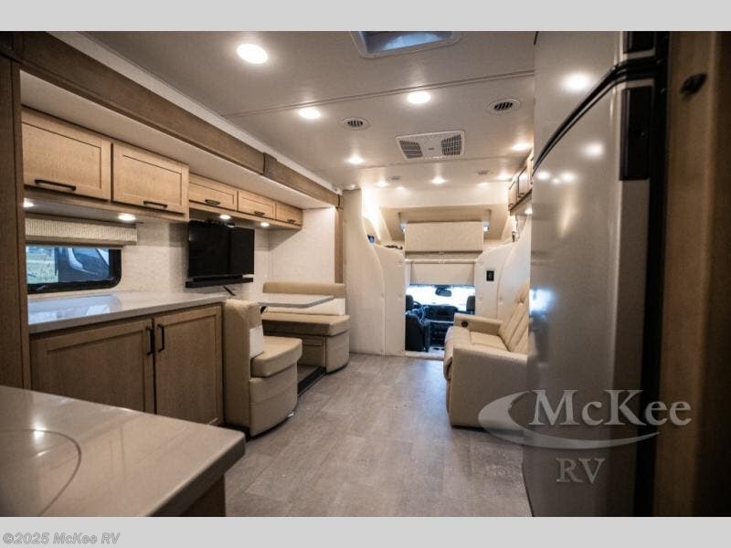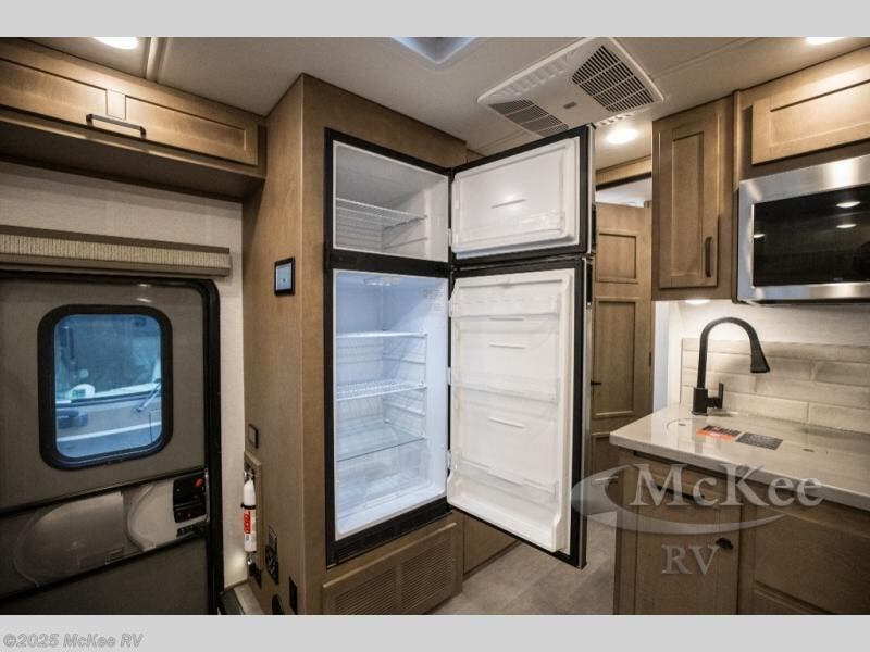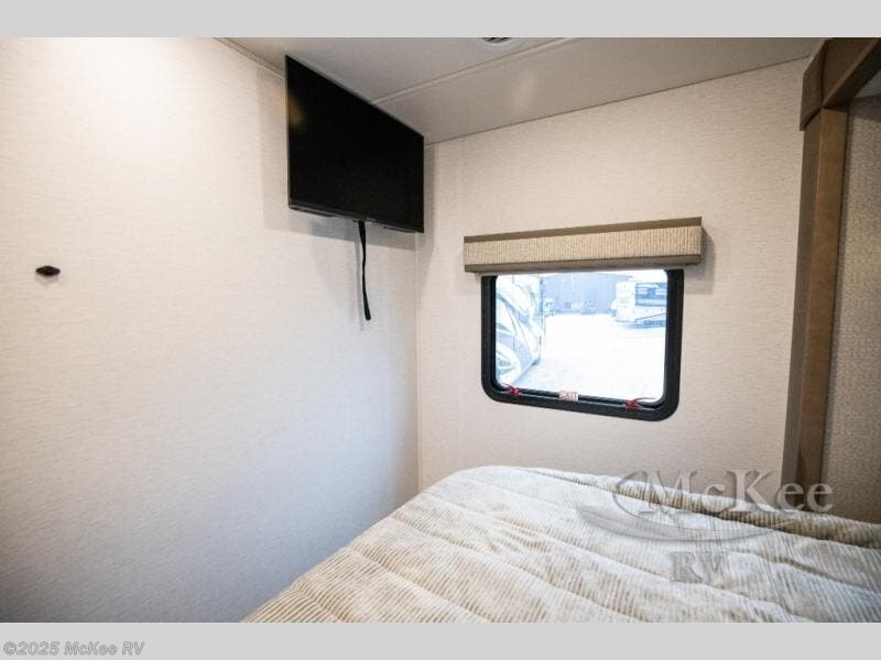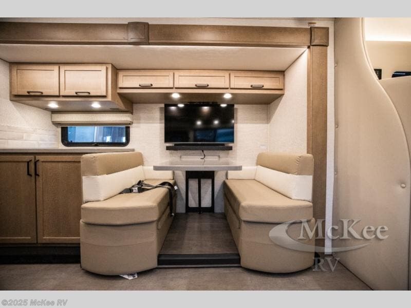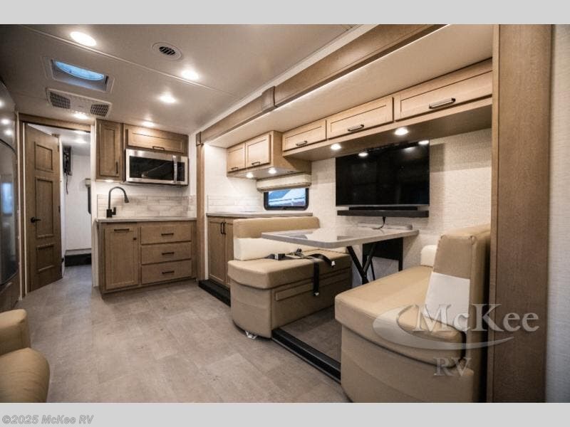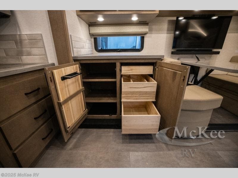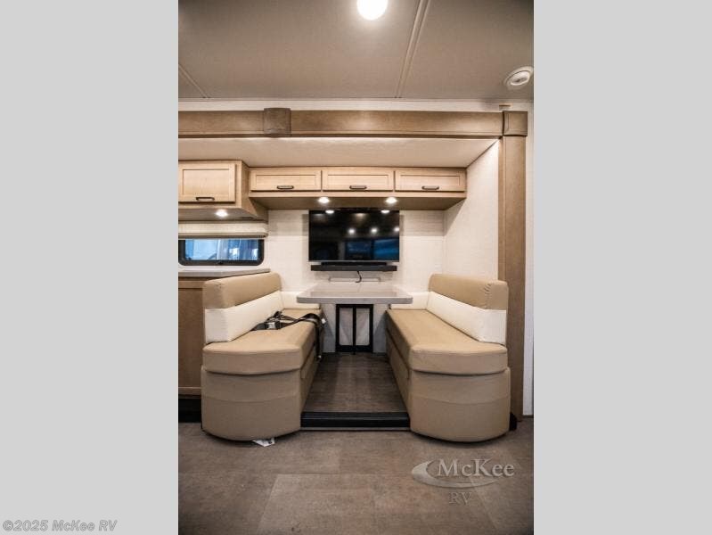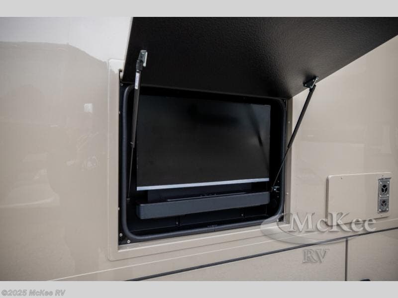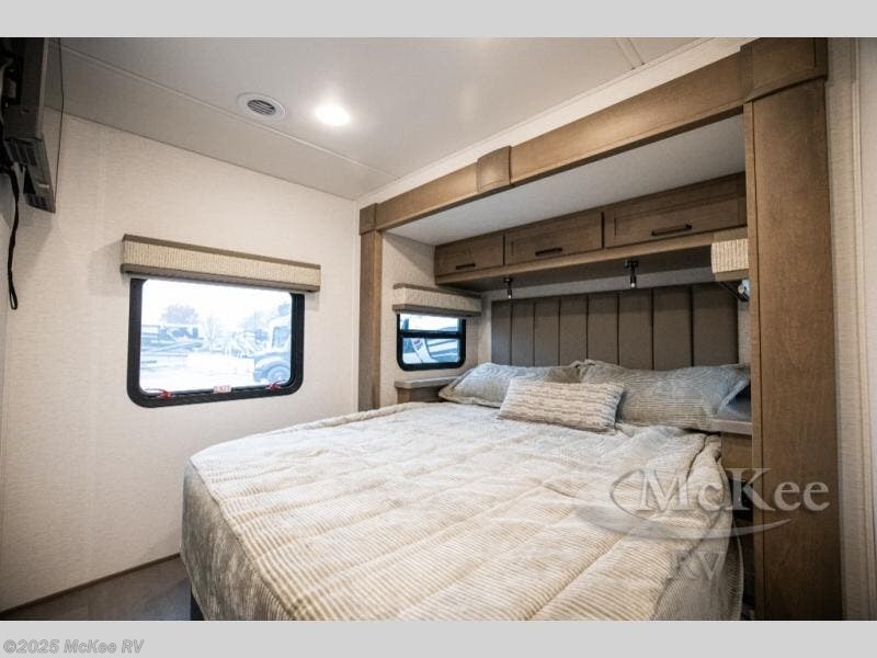 Experience ultimate luxury on wheels in this motor home bedroom. A 65 x 75 queen bed comfort with 32” LED TV entertainment and a full bathroom convenience with ample storage. The kitchen is fitted with spacious closet organization, 10 cu. stainless steel refrigerator, microwave, two-burner cooktop, overhead cabinets, and a pantry storage ideal for storing different stuff. In the living room, you will find a 42” LED TV, overhead cabinets, sofa sleeper flexibility, dinette dining, and a cab-over bed for extra sleep. This unit is also equipped with outdoor entertainment, perfect for socializing and outdoor fun, allowing you to experience extended trips with family during vacations, ideal for those who are adventure-seekers. Unforgettable adventures await! Experience the freedom of luxury motorhome living.