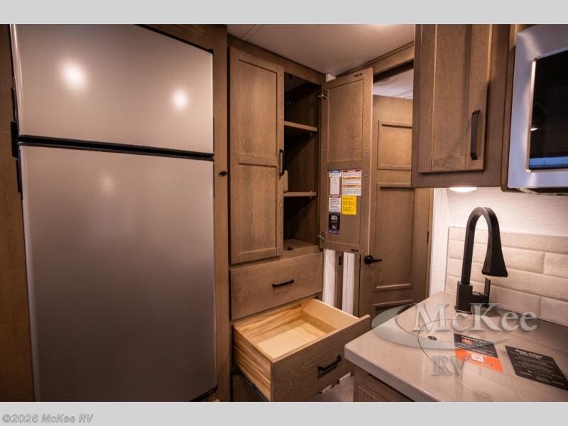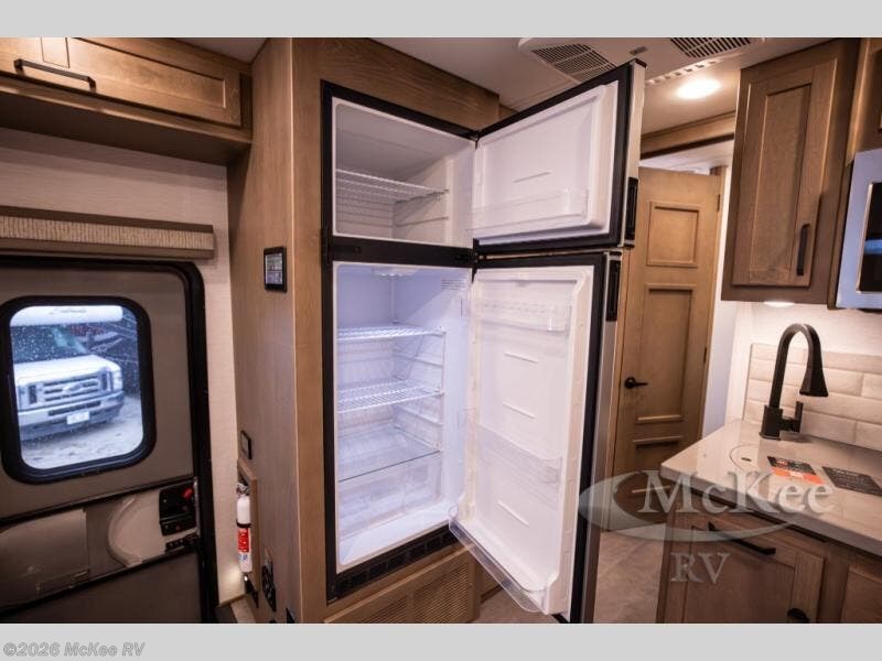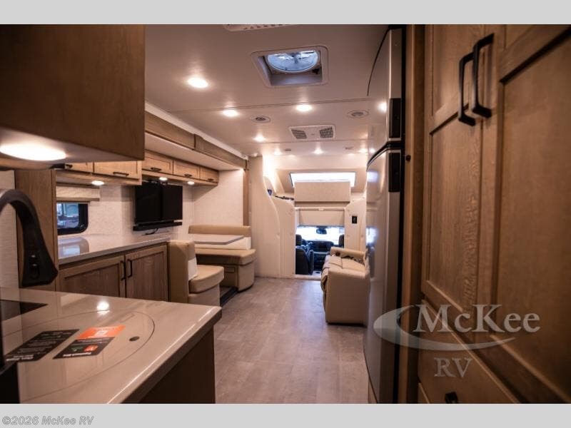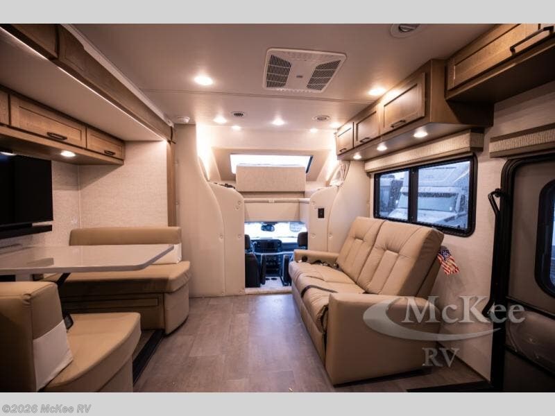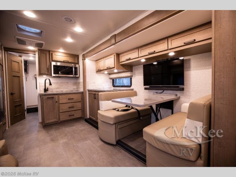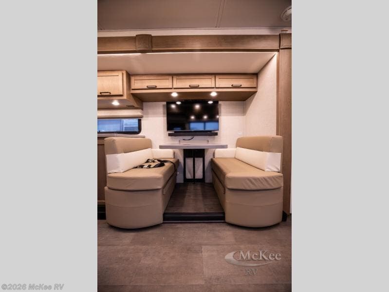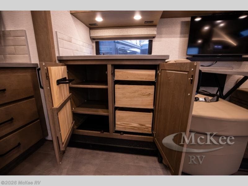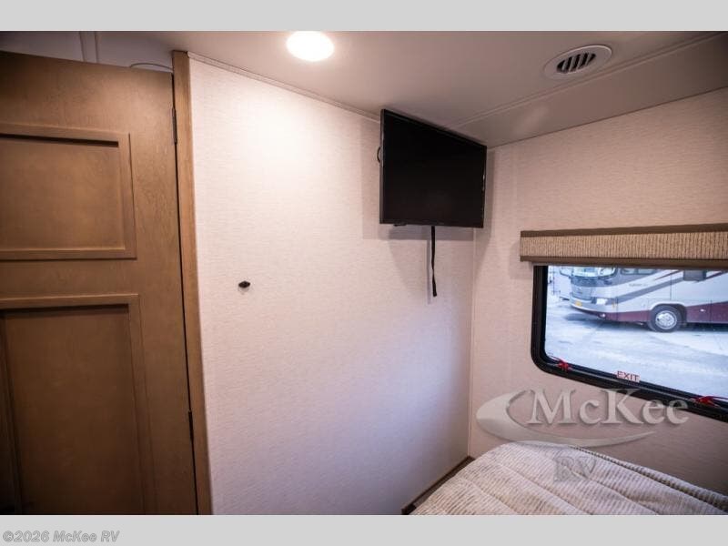 Experience ultimate luxury on wheels in this motor home bedroom. A 65 x 75 queen bed comfort with 32” LED TV entertainment and a full bathroom convenience with ample storage. The kitchen is fitted with spacious closet organization, 10 cu. stainless steel refrigerator, microwave, two-burner cooktop, overhead cabinets, and a pantry storage ideal for storing different stuff. In the living room, you will find a 42” LED TV, overhead cabinets, sofa sleeper flexibility, dinette dining, and a cab-over bed for extra sleep. This unit is also equipped with outdoor entertainment, perfect for socializing and outdoor fun, allowing you to experience extended trips with family during vacations, ideal for those who are adventure-seekers. Unforgettable adventures await! Experience the freedom of luxury motorhome living.