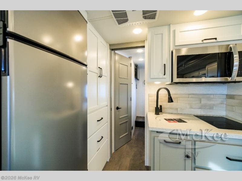 Experience ultimate luxury on wheels in this motor home bedroom. A 65 x 75 queen bed comfort with 32” LED TV entertainment and a full bathroom convenience with ample storage. The kitchen is fitted with spacious closet organization, 10 cu. stainless steel refrigerator, microwave, two-burner cooktop, overhead cabinets, and a pantry storage ideal for storing different stuff. In the living room, you will find a 42” LED TV, overhead cabinets, sofa sleeper flexibility, dinette dining, and a cab-over bed for extra sleep. This unit is also equipped with outdoor entertainment, perfect for socializing and outdoor fun, allowing you to experience extended trips with family during vacations, ideal for those who are adventure-seekers. Unforgettable adventures await! Experience the freedom of luxury motorhome living.