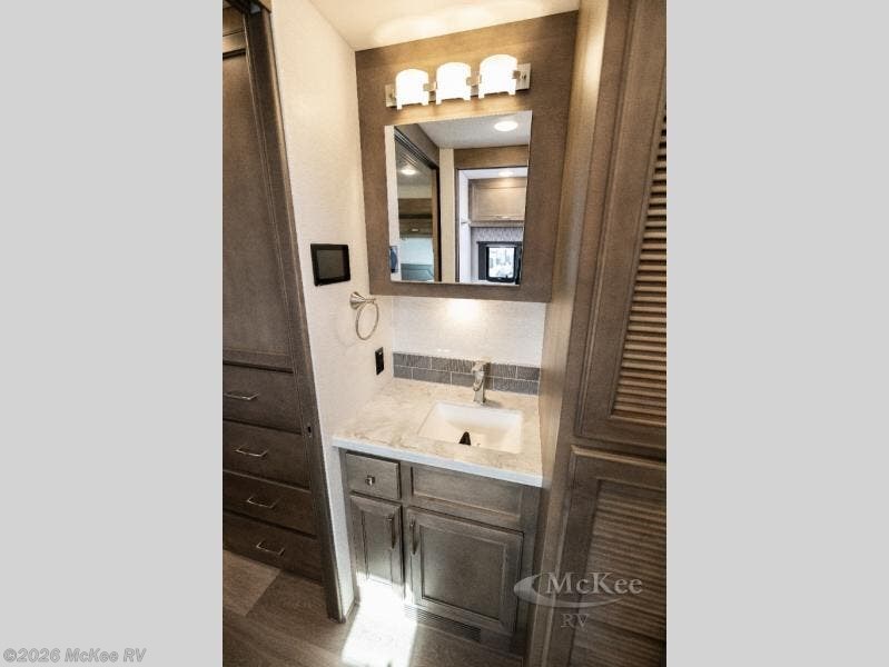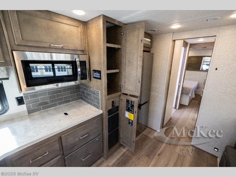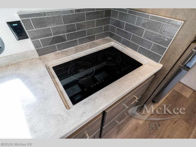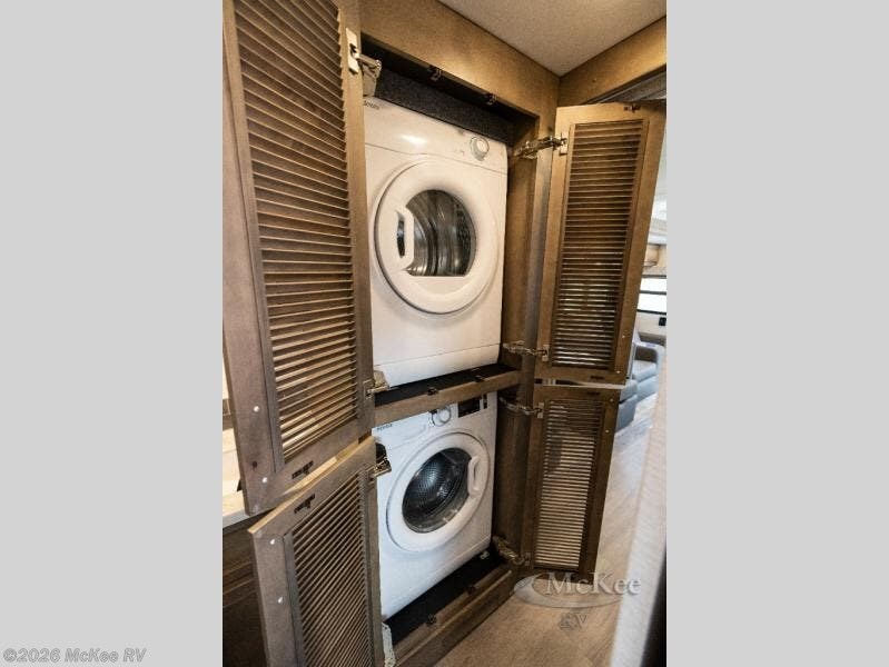 Whether you travel while you work or enjoy long-trips in your RV, this coach provides all the luxury, flexibility and comfort you could want! The main living and kitchen area is spacious with a furniture slide which includes a booth dinette and a slide-a-bed sofa which both offer sleeping space when needed for guests. The cook will love using the stainless steel convection microwave oven and the induction cooktop when making meals, and the French door residential refrigerator will hold lots of cold food. The separated bathroom allows two people to get ready at once, and the mini-king bed slide gives you more floor space in the bedroom to get to the closets and dresser. You will find a 32" 4K Smart LED TV in the bedroom to watch before bedtime, and the exterior offers a 32" LED TV to watch the big game while relaxing under the electric awning with LED lights. And you might like to add the washer/dryer option to the prepped closet to keep everything clean while on the road.