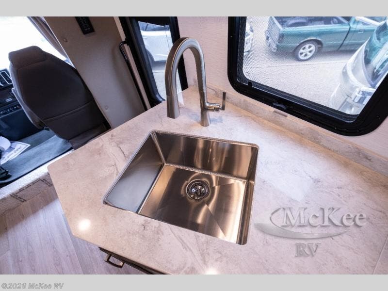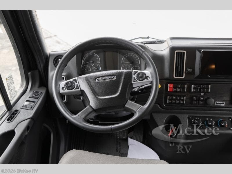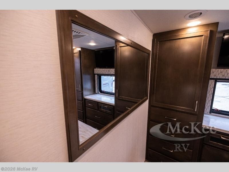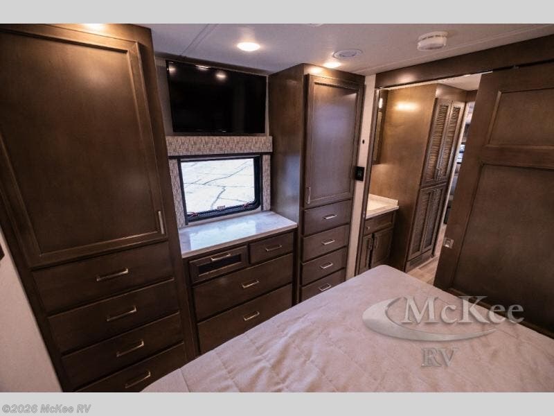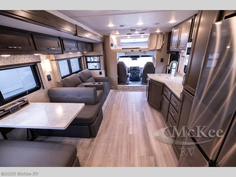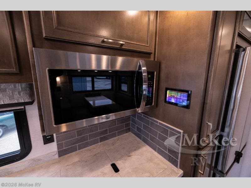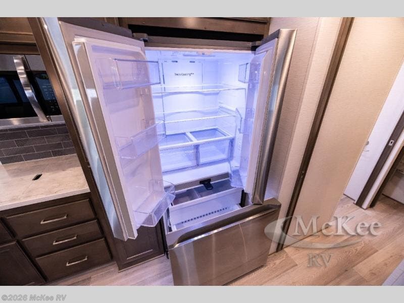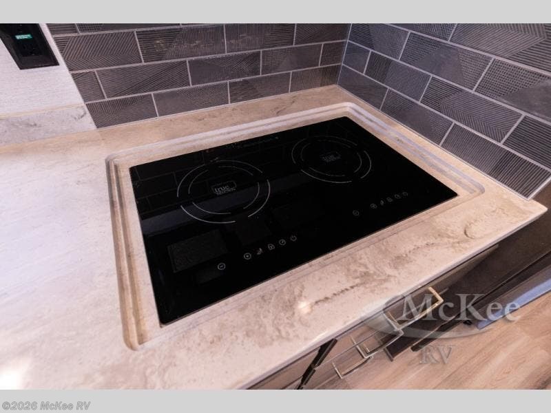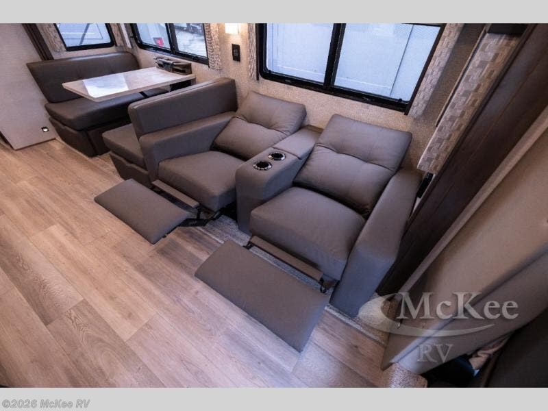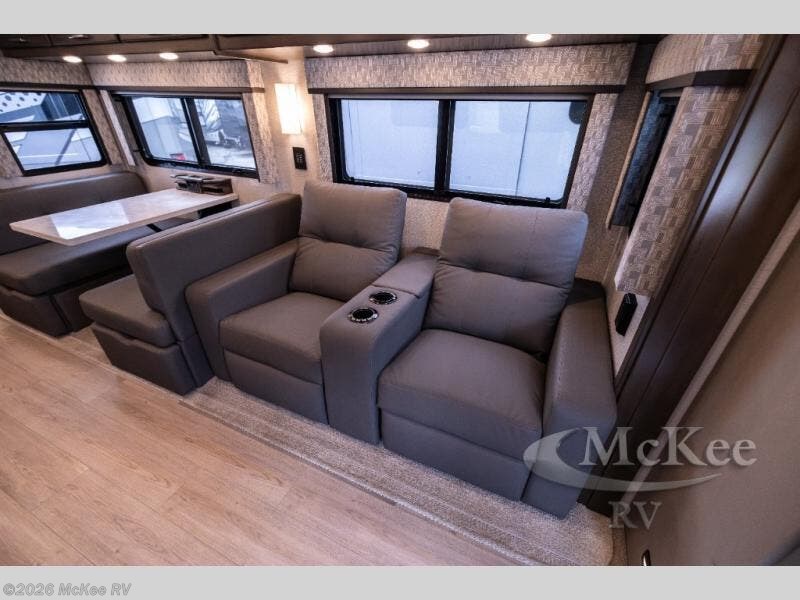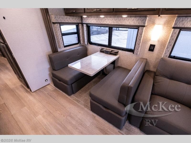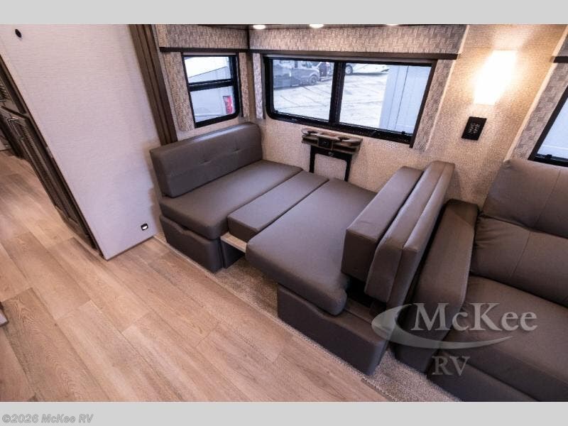 Whether you travel while you work or enjoy long-trips in your RV, this coach provides all the luxury, flexibility and comfort you could want! The main living and kitchen area is spacious with a furniture slide which includes a booth dinette and a slide-a-bed sofa which both offer sleeping space when needed for guests. The cook will love using the stainless steel convection microwave oven and the induction cooktop when making meals, and the French door residential refrigerator will hold lots of cold food. The separated bathroom allows two people to get ready at once, and the mini-king bed slide gives you more floor space in the bedroom to get to the closets and dresser. You will find a 32" 4K Smart LED TV in the bedroom to watch before bedtime, and the exterior offers a 32" LED TV to watch the big game while relaxing under the electric awning with LED lights. And you might like to add the washer/dryer option to the prepped closet to keep everything clean while on the road.