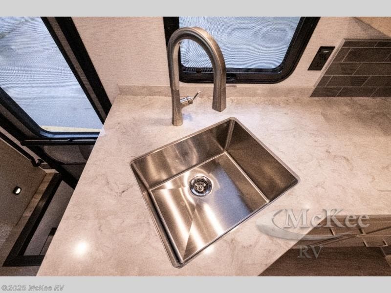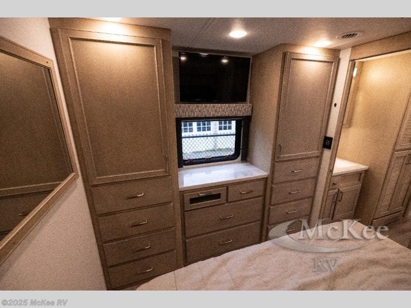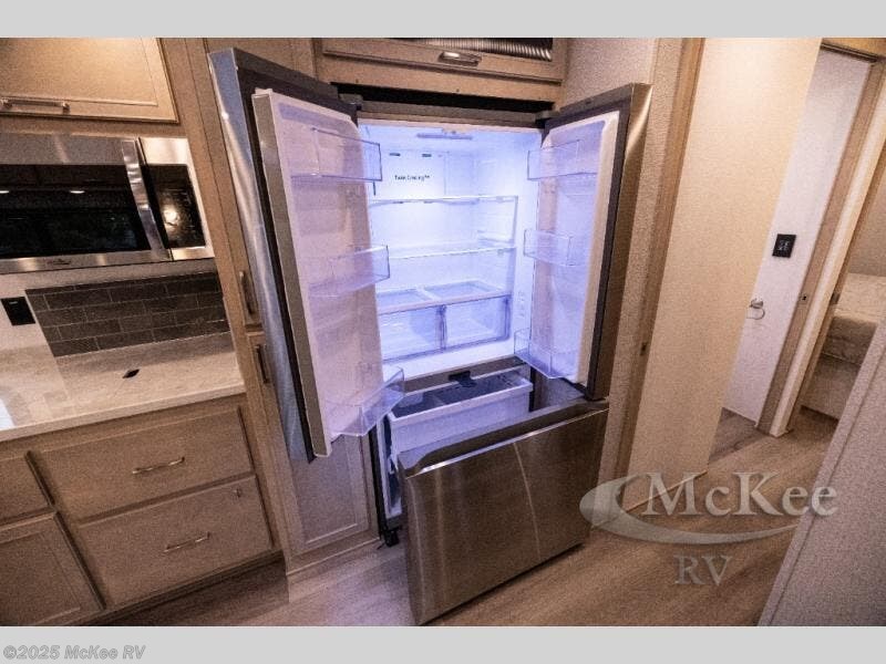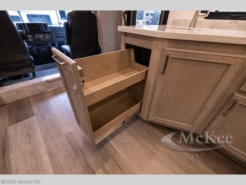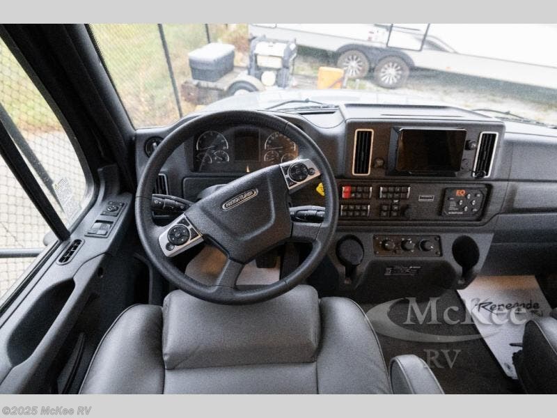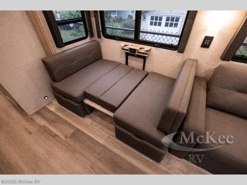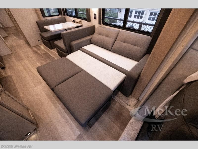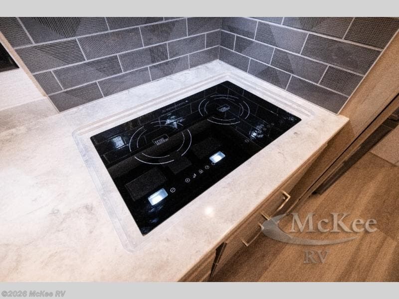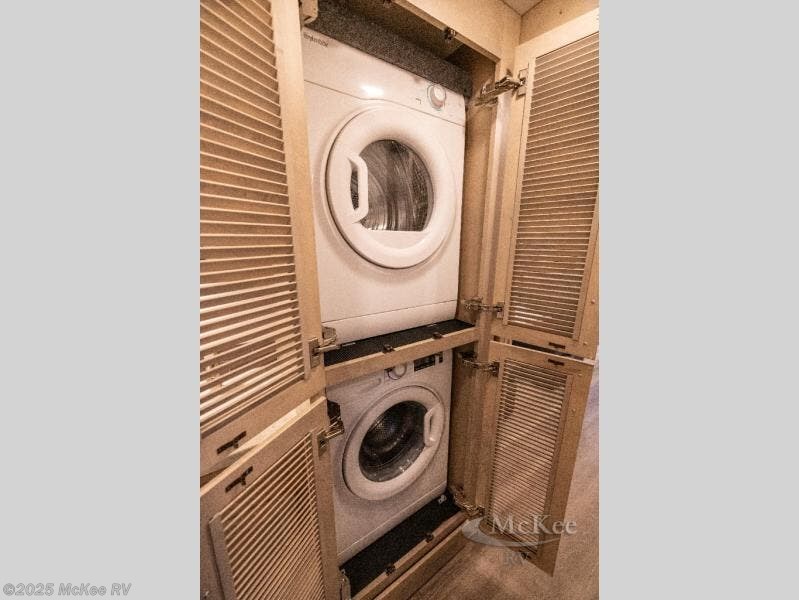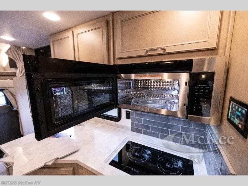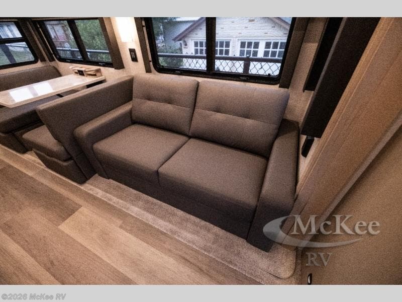 Whether you travel while you work or enjoy long-trips in your RV, this coach provides all the luxury, flexibility and comfort you could want! The main living and kitchen area is spacious with a furniture slide which includes a booth dinette and a slide-a-bed sofa which both offer sleeping space when needed for guests. The cook will love using the stainless steel convection microwave oven and the induction cooktop when making meals, and the French door residential refrigerator will hold lots of cold food. The separated bathroom allows two people to get ready at once, and the mini-king bed slide gives you more floor space in the bedroom to get to the closets and dresser. You will find a 32" 4K Smart LED TV in the bedroom to watch before bedtime, and the exterior offers a 32" LED TV to watch the big game while relaxing under the electric awning with LED lights. And you might like to add the washer/dryer option to the prepped closet to keep everything clean while on the road.