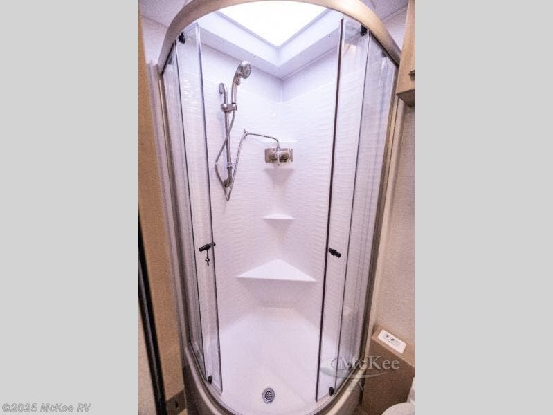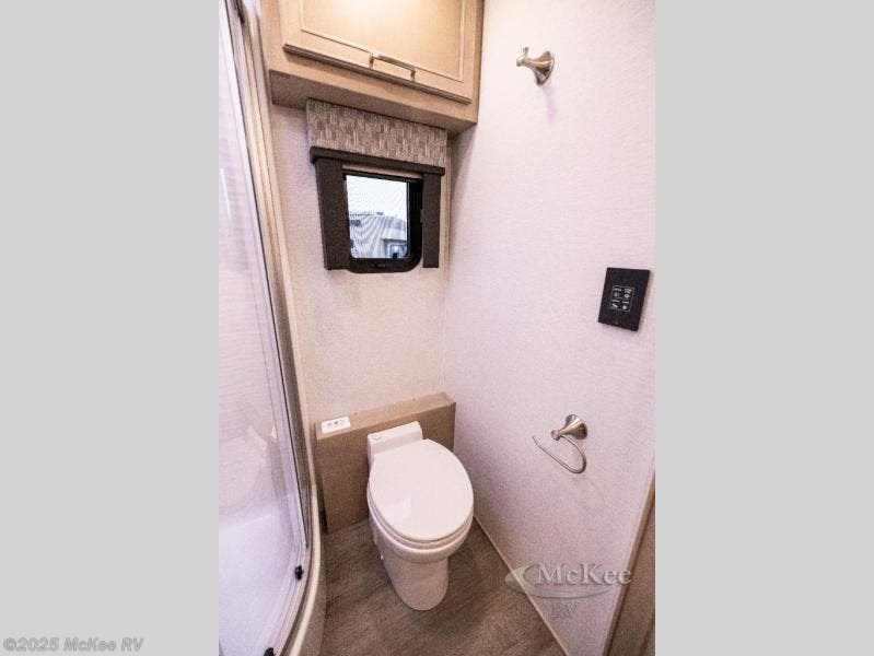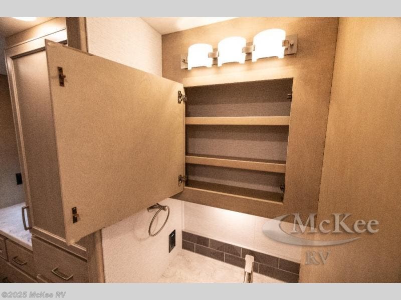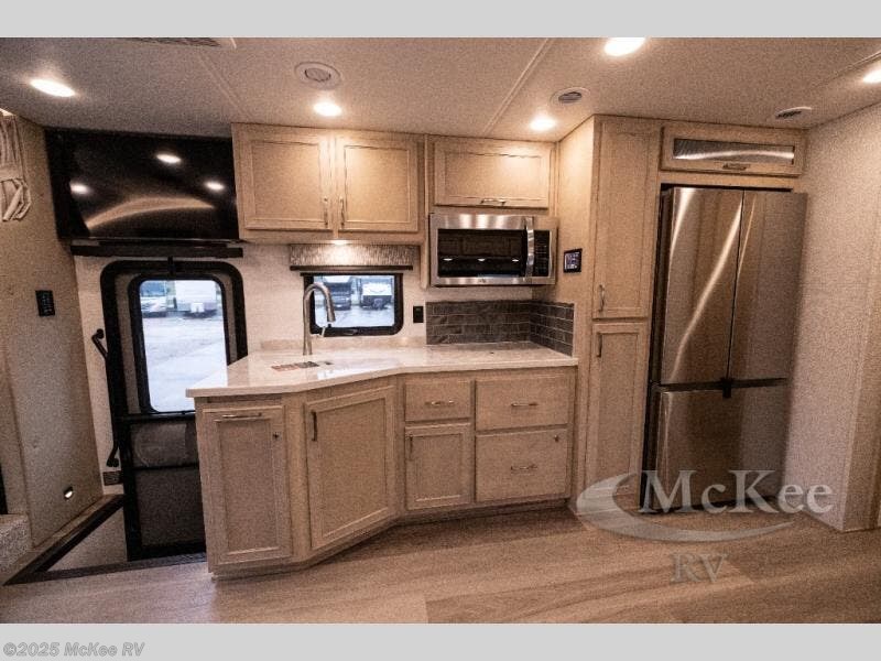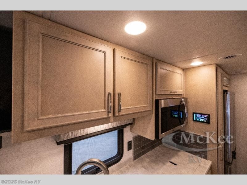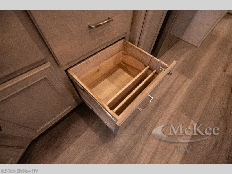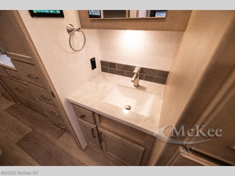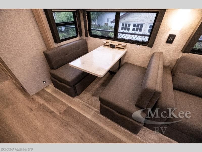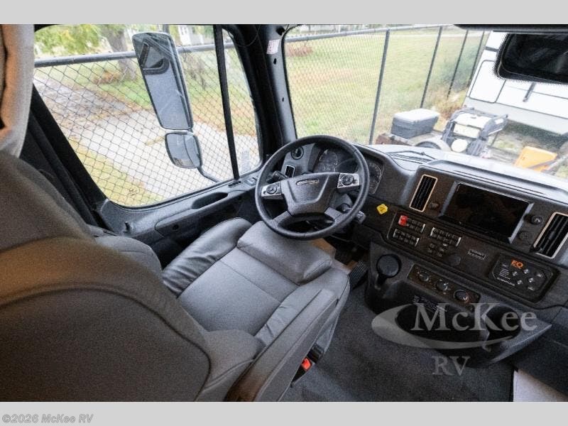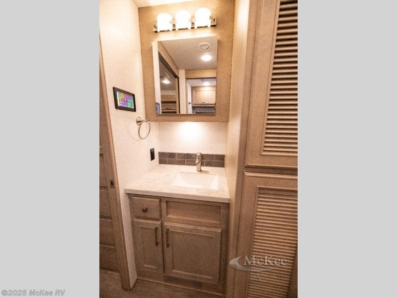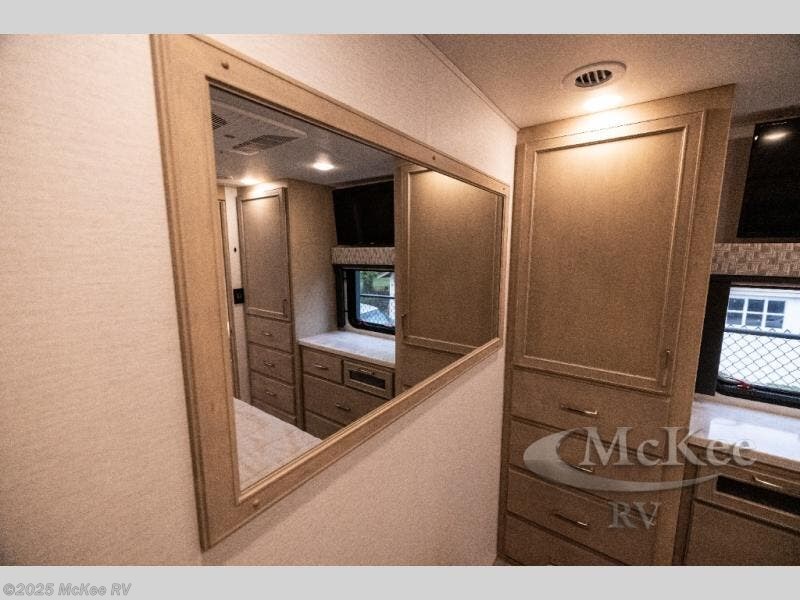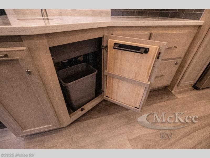 Whether you travel while you work or enjoy long-trips in your RV, this coach provides all the luxury, flexibility and comfort you could want! The main living and kitchen area is spacious with a furniture slide which includes a booth dinette and a slide-a-bed sofa which both offer sleeping space when needed for guests. The cook will love using the stainless steel convection microwave oven and the induction cooktop when making meals, and the French door residential refrigerator will hold lots of cold food. The separated bathroom allows two people to get ready at once, and the mini-king bed slide gives you more floor space in the bedroom to get to the closets and dresser. You will find a 32" 4K Smart LED TV in the bedroom to watch before bedtime, and the exterior offers a 32" LED TV to watch the big game while relaxing under the electric awning with LED lights. And you might like to add the washer/dryer option to the prepped closet to keep everything clean while on the road.