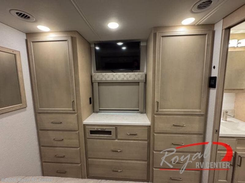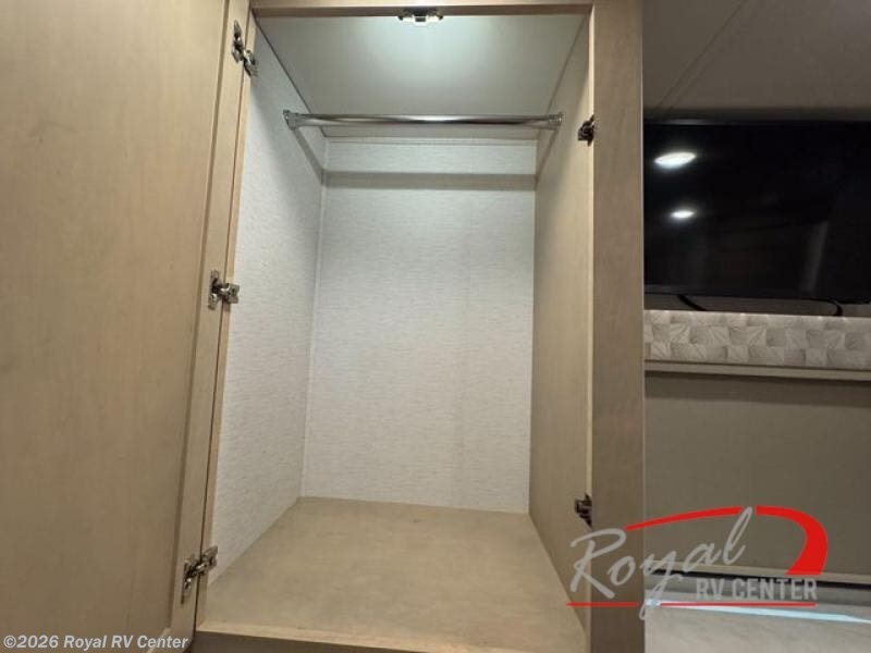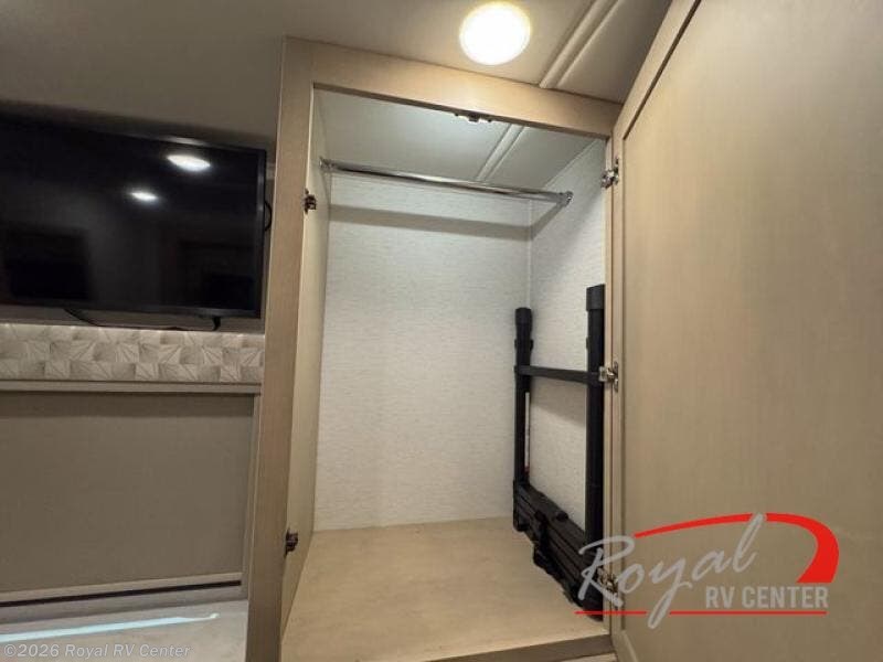 At the rear of the coach, the bedroom provides a comfortable retreat with a mini-king bed slide-out that increases floor space for easy access to closets and the dresser. A 32" 4K Smart LED TV lets you relax with your favorite shows before bedtime. A closet is also prepped for an optional washer and dryer, making long trips even more convenient.