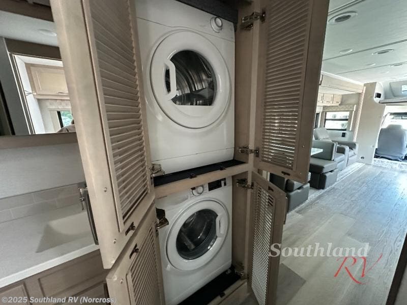 You will feel right at home in this motorhome! With a separated bathroom, one person can freshen up in the radius shower while another uses the sink or maybe put a load of laundry in the optional washer and dryer. There are plenty of places to sleep between the 66" x 74" mini-king bed in the rear private bedroom, the convertible booth dinette, and thesofa sleeper. You can prepare your best home cooked meals with the two burner induction cooktop in the fully equipped kitchen. Crank up the tunes with the Samsung soundbar with Bluetooth, wireless subwoofer, and JBL speakers. The Garmin infotainment with RV maps will ensure you stay on track!
