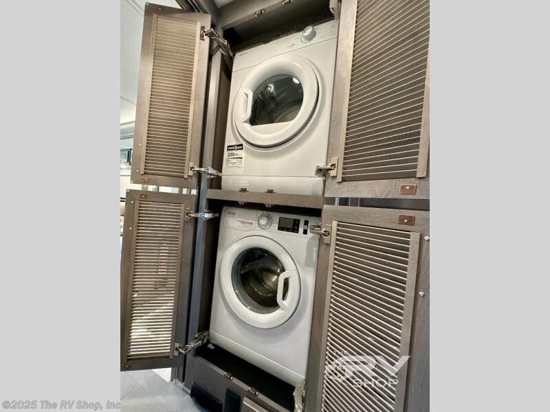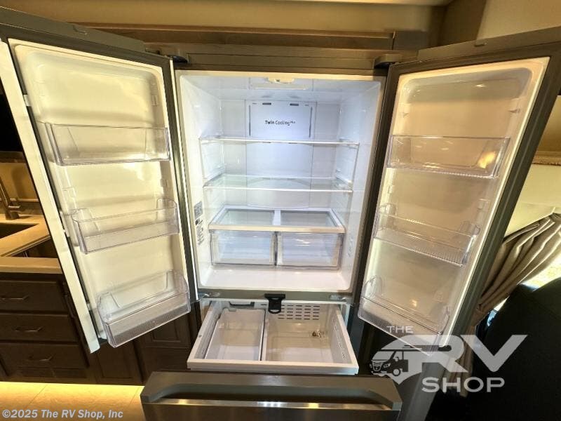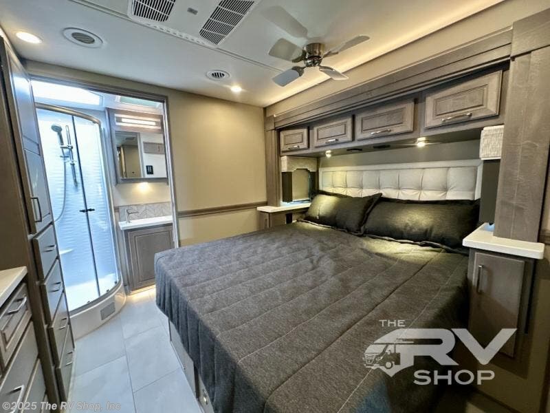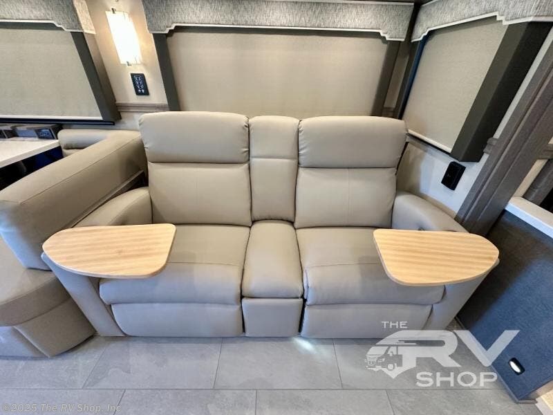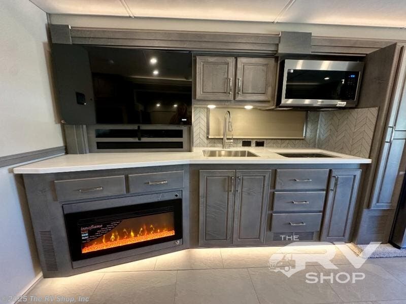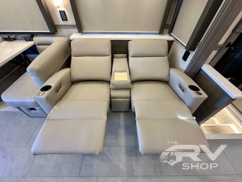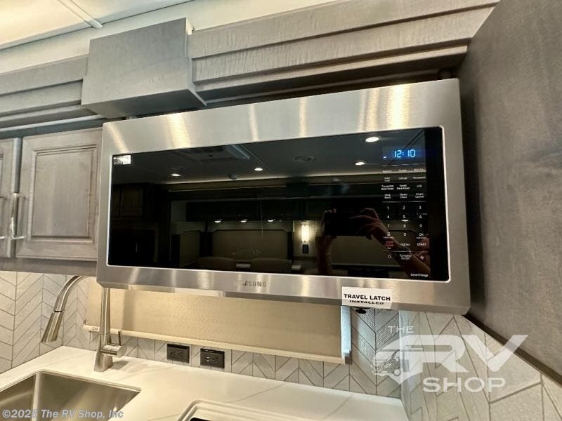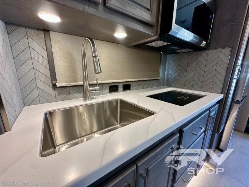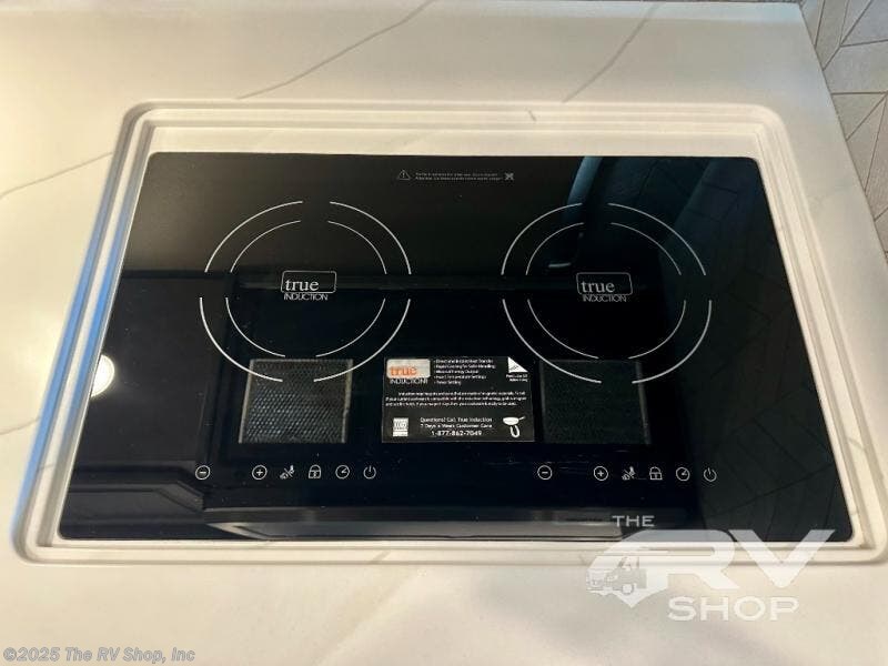 You and your spouse can dream about your next adventure while sleeping on your own memory foam mattress in the master suite with a full bathroom including a radius shower and linen storage. If you have overnight guests, they can sleep on the sofa sleeper plus the dinette once converted for bedtime. And the mid-coach half bath will be all theirs. The chef-inspired kitchen offers a convection microwave, a recessed two burner induction cooktop and a French door residential refrigerator, plus more! You can entertain inside while watching the 50" 4K Smart LED TV or outside under the electric awning while enjoying the exterior 43" 4K LED TV with USB charging. There are so many more luxury and tech features to enjoy, plus a few options to add if you wish. Take a look at the list.