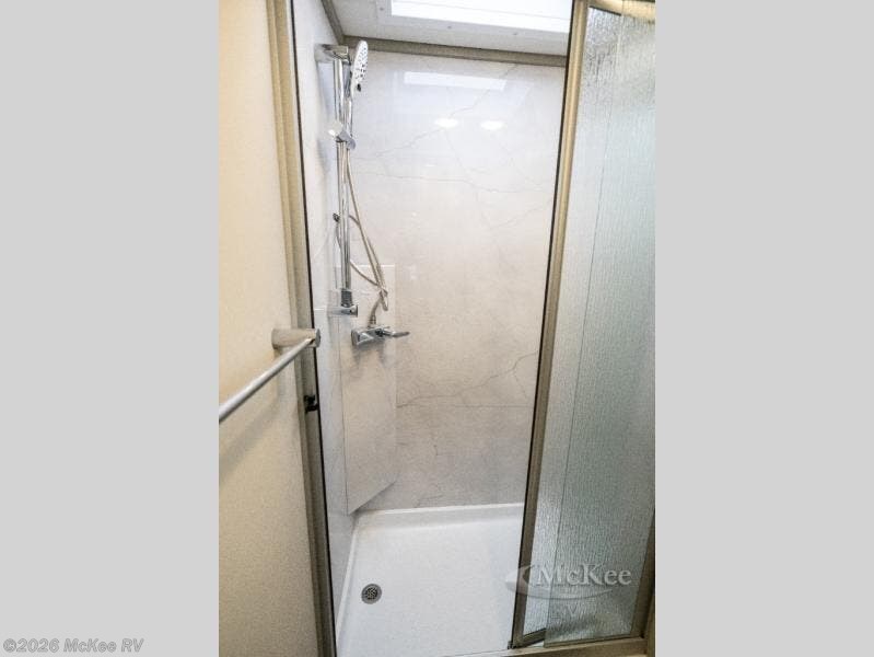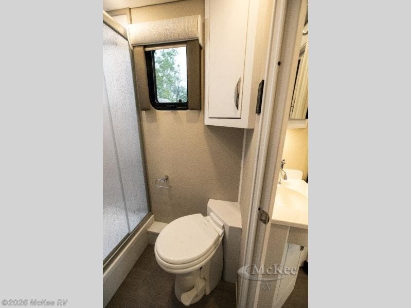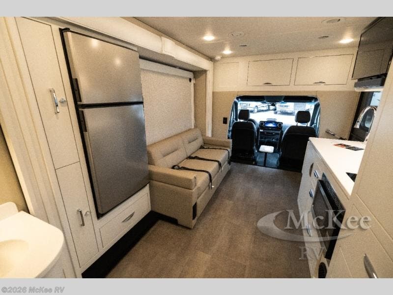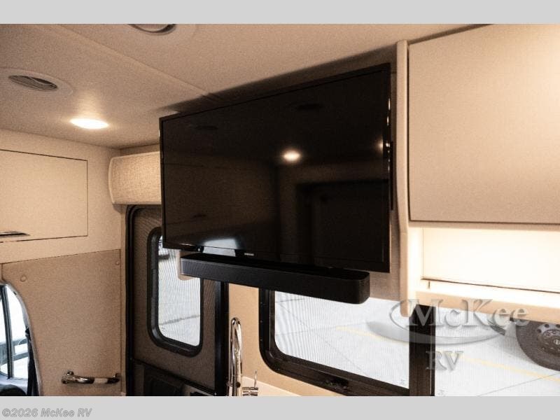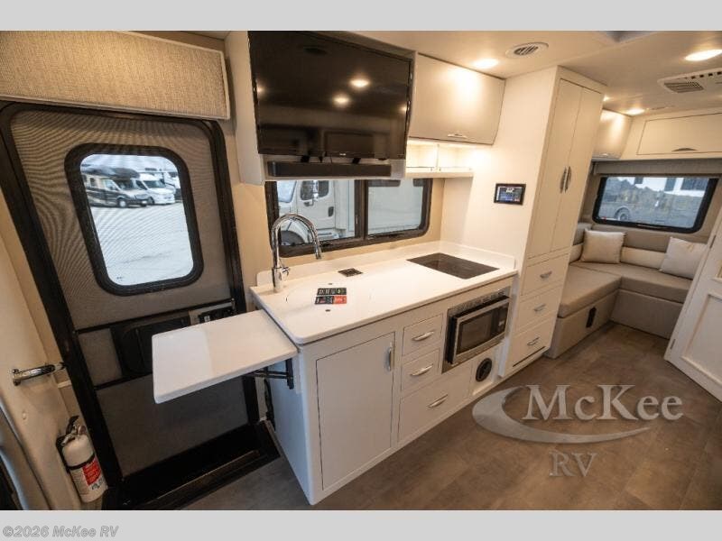This motorhome offers flexibility and comfort! An L-sofa with storage provides room to relax in the rear corner, or sit on the jiffy sofa towards the front. At night you will enjoy sleeping on the 65" x 72" Murphy bed. The rear corner bath includes a sink outside the door for flexible use. The kitchen features an 8 cu. ft. refrigerator, microwave, and pantry, plus a closet to store miscellaneous items. Step outside and enjoy the exterior entertainment center with a 27" TV, soundbar with Bluetooth streaming, and USB charging!