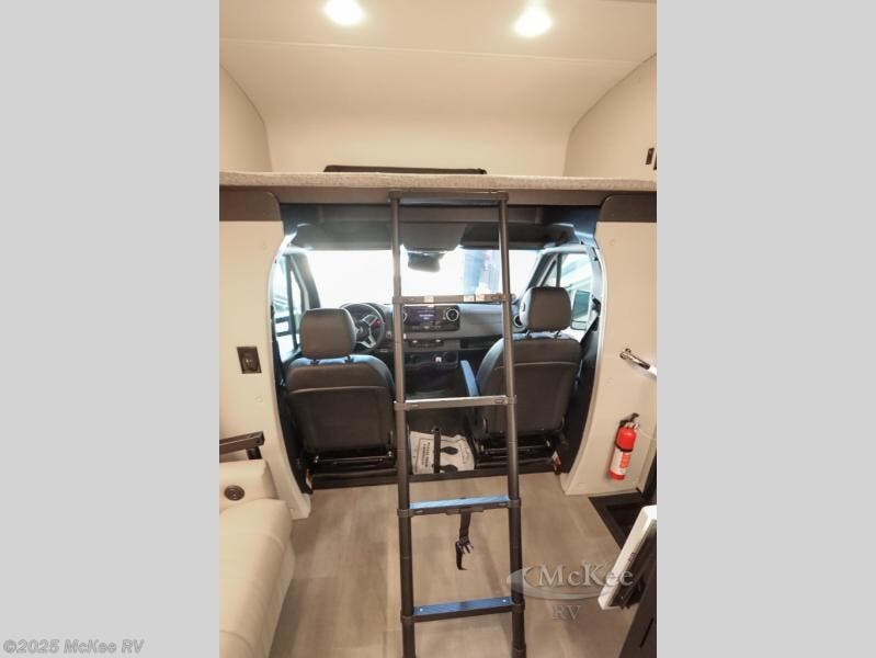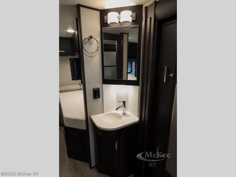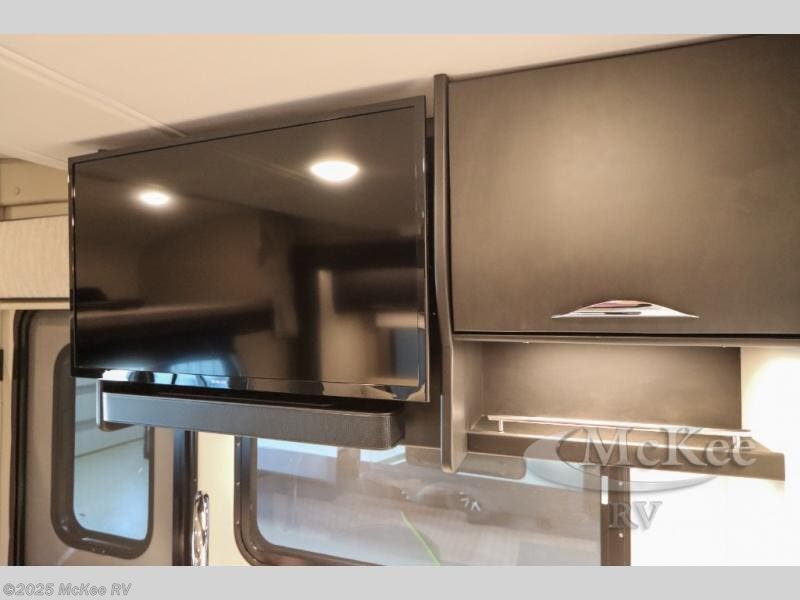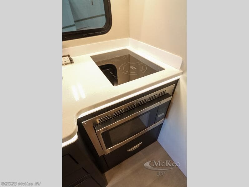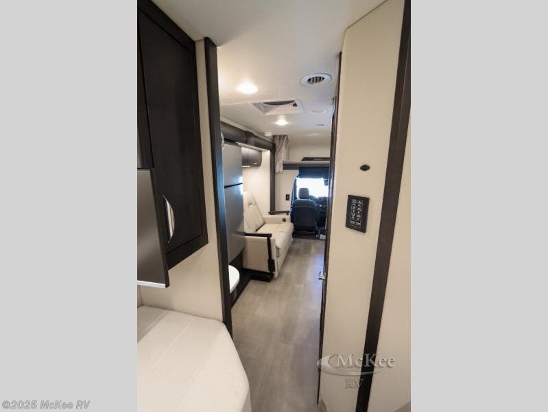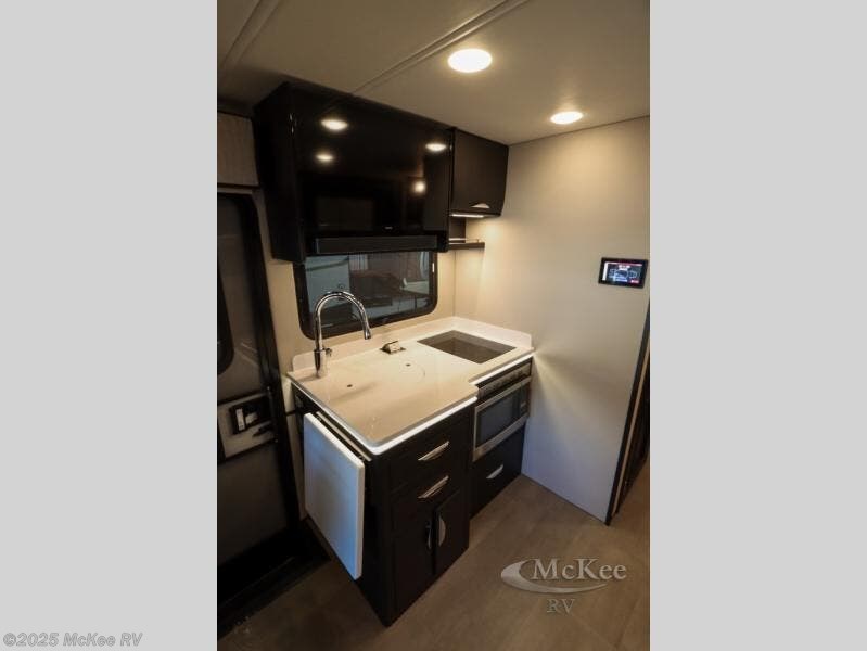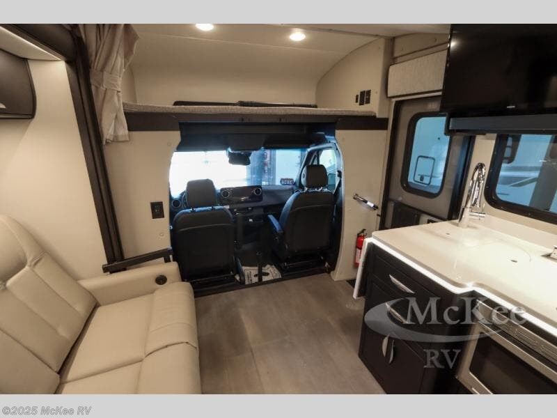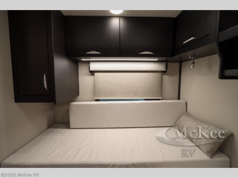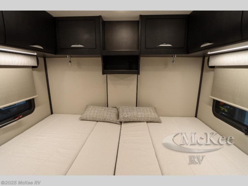 The perfect coach for two along with room for an added guest or little ones with the 46" x 80" over the cab bunk! You will appreciate the storage throughout for your belongings, so no worries about leaving anything behind. The single slide out along the driver's side adds more walking around space inside. Prepare light meals and snacks with ease while you travel with a two-burner cooktop and round sink for cleaning up. There is cupboard storage in the overhead areas for your dishes, and the refrigerator/pantry is located opposite within the sofa slide. The onboard bathroom features a private toilet and shower area with a separate sink just opposite the door. In the rear of the coach, there are two twin mattresses, a 24" TV and overhead storage along each side and rear of the coach, plus more storage can be found at the foot of each bed.