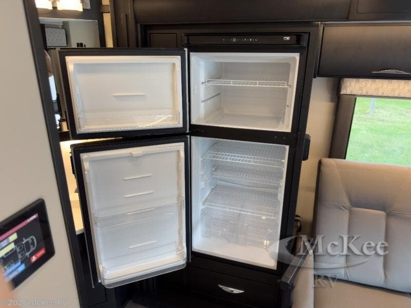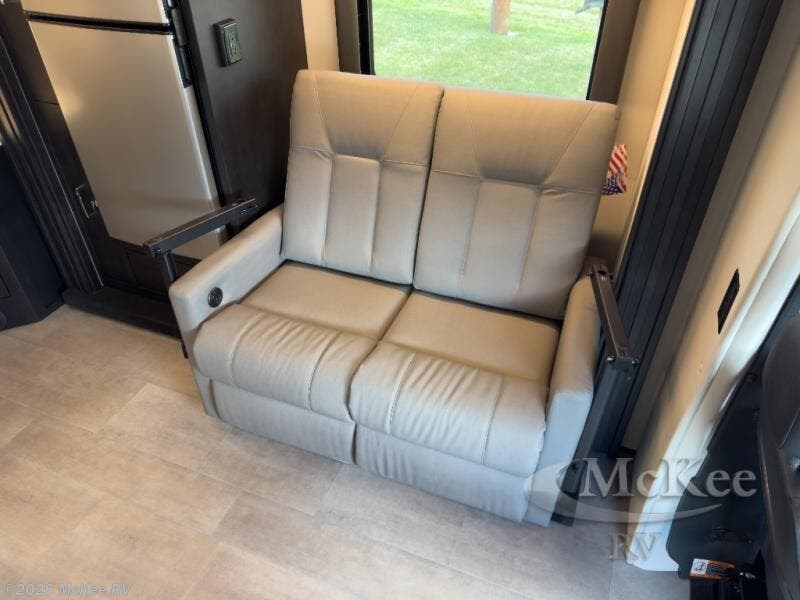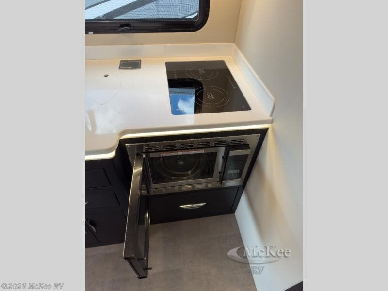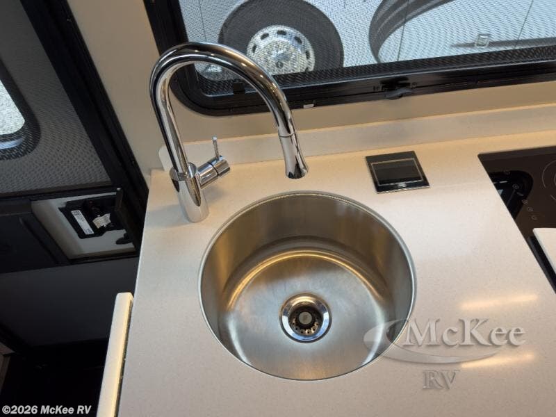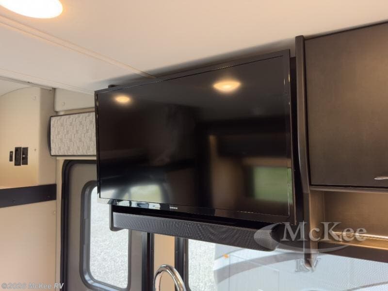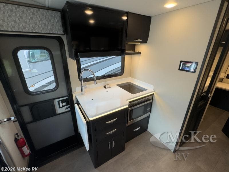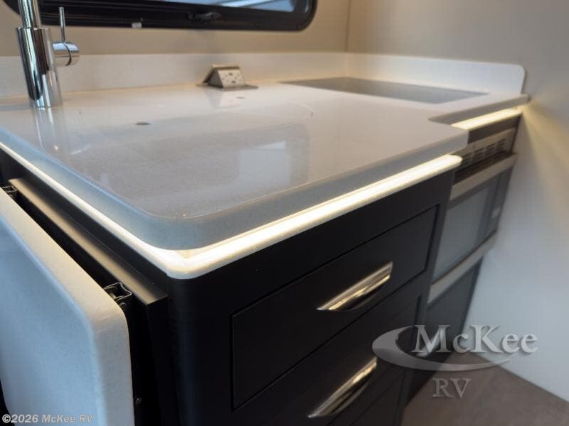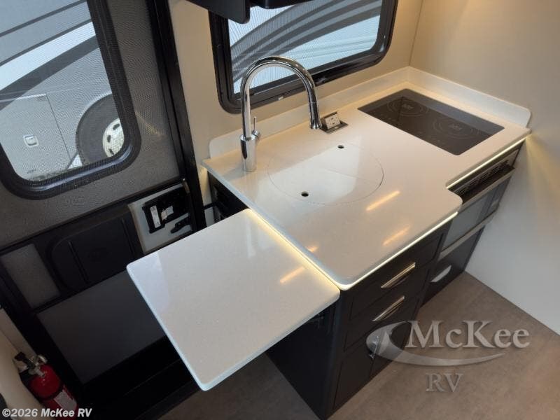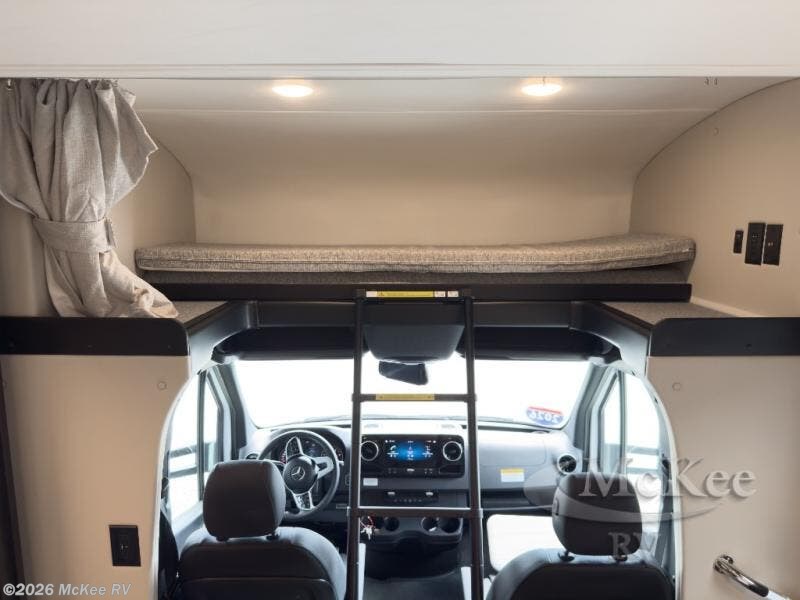 The perfect coach for two along with room for an added guest or little ones with the 46" x 80" over the cab bunk! You will appreciate the storage throughout for your belongings, so no worries about leaving anything behind. The single slide out along the driver's side adds more walking around space inside. Prepare light meals and snacks with ease while you travel with a two-burner cooktop and round sink for cleaning up. There is cupboard storage in the overhead areas for your dishes, and the refrigerator/pantry is located opposite within the sofa slide. The onboard bathroom features a private toilet and shower area with a separate sink just opposite the door. In the rear of the coach, there are two twin mattresses, a 24" TV and overhead storage along each side and rear of the coach, plus more storage can be found at the foot of each bed.