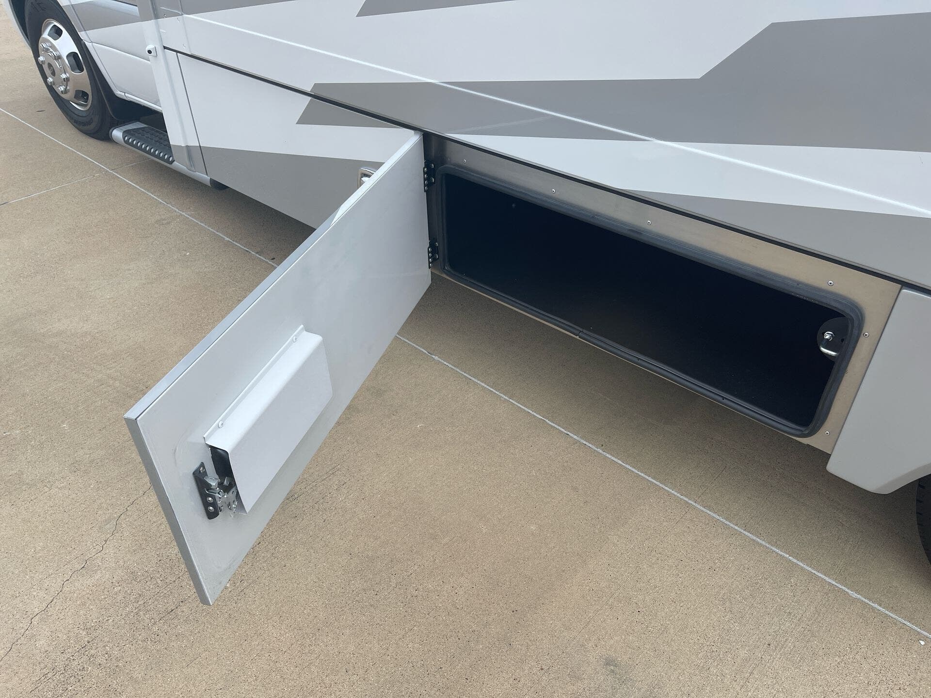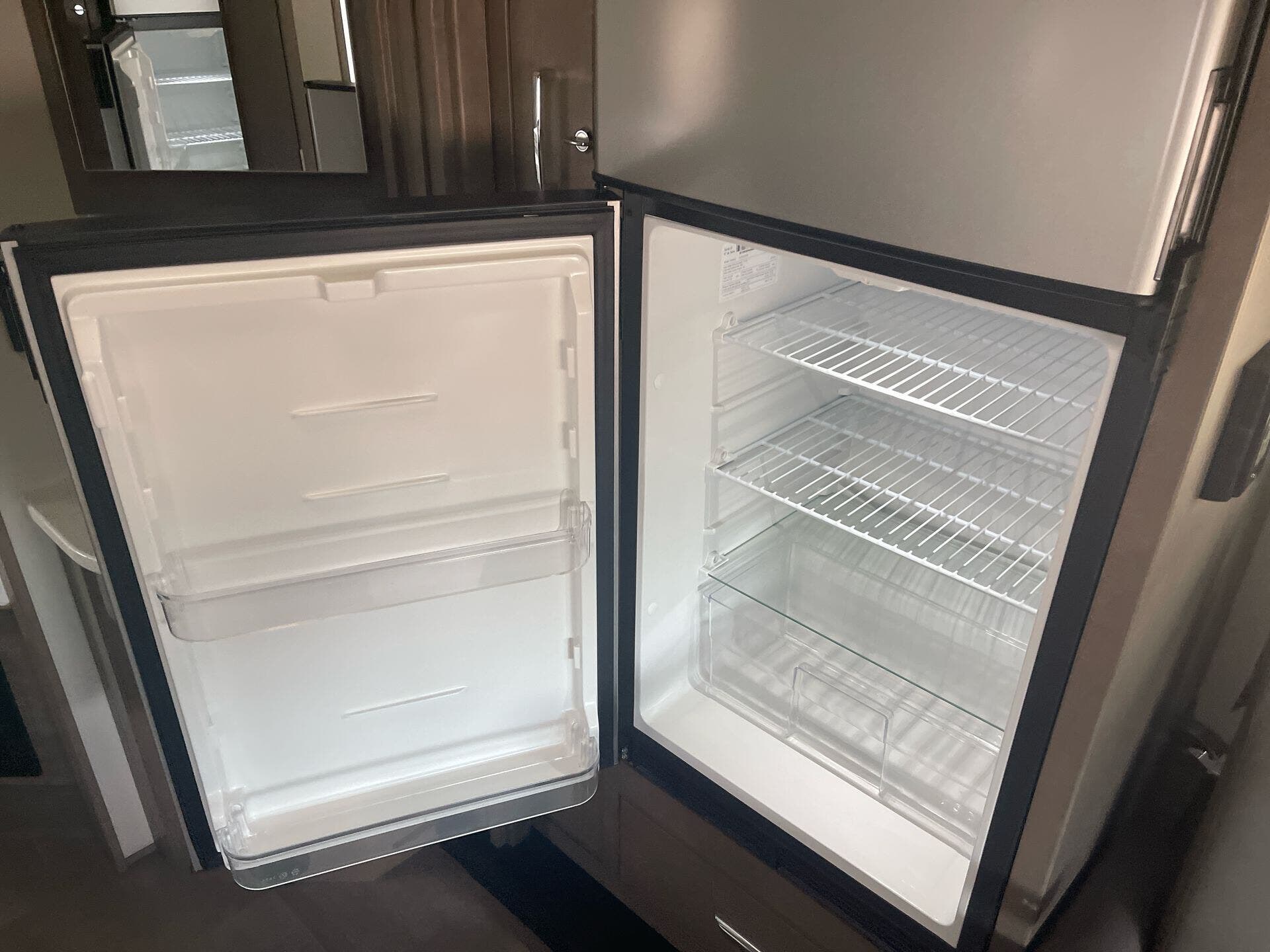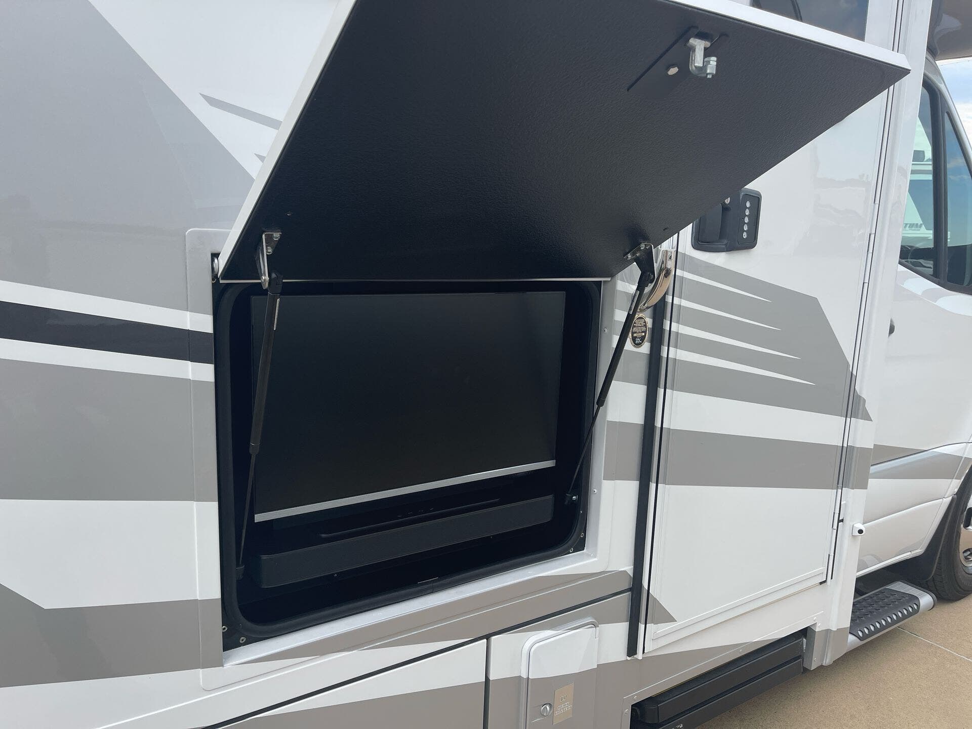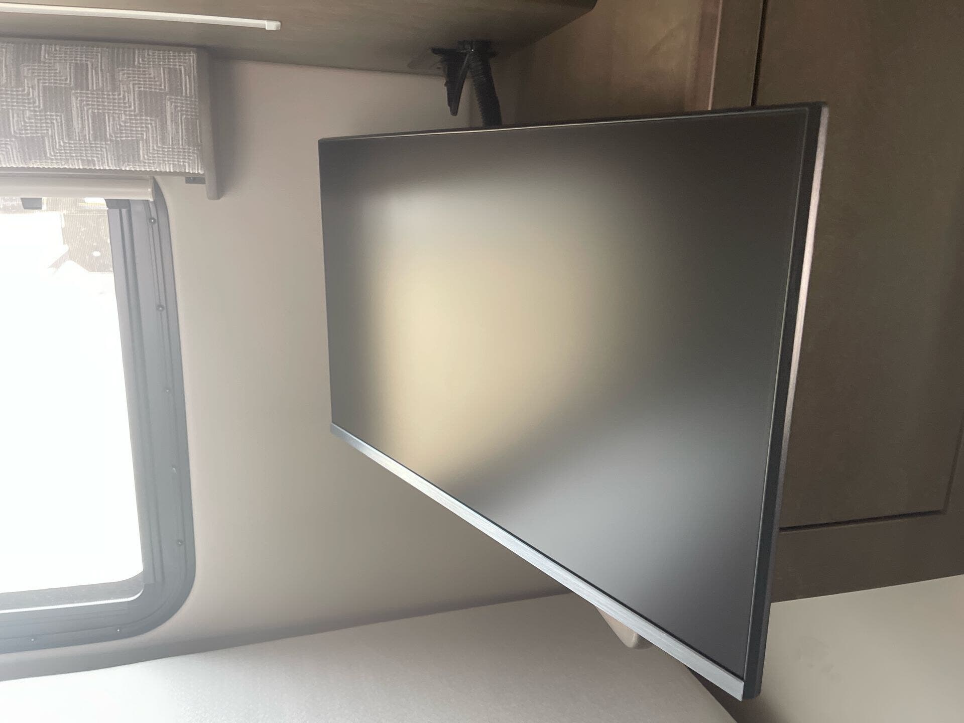 The galley is kitchen-ready with an induction or LP cooktop, 8?cu?ft 12?V compressor refrigerator, convection microwave, and ample storage. A 32″ Smart LED TV in the living area, 24″ TV in bedroom, and an exterior 27″ LED TV offer entertainment indoors and out.
