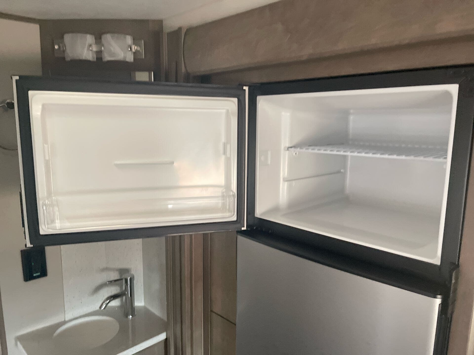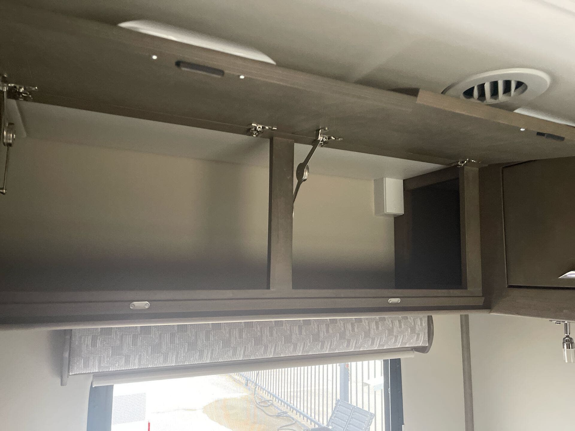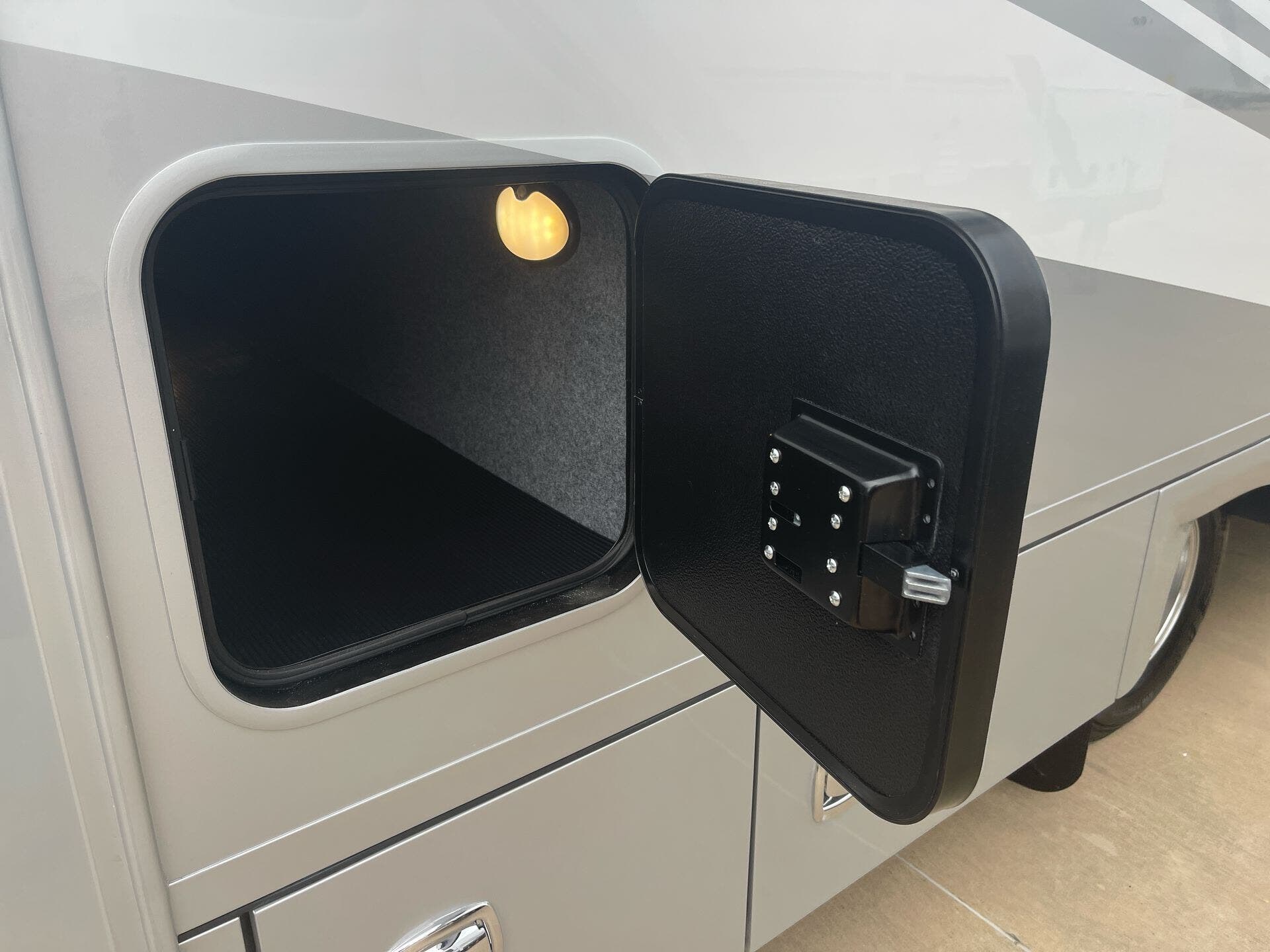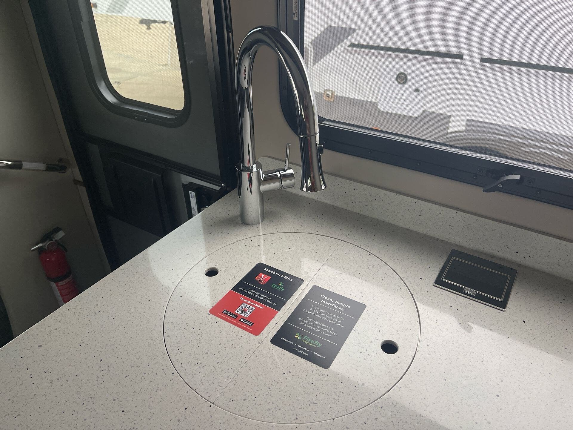 The galley is kitchen-ready with an induction or LP cooktop, 8?cu?ft 12?V compressor refrigerator, convection microwave, and ample storage. A 32″ Smart LED TV in the living area, 24″ TV in bedroom, and an exterior 27″ LED TV offer entertainment indoors and out.