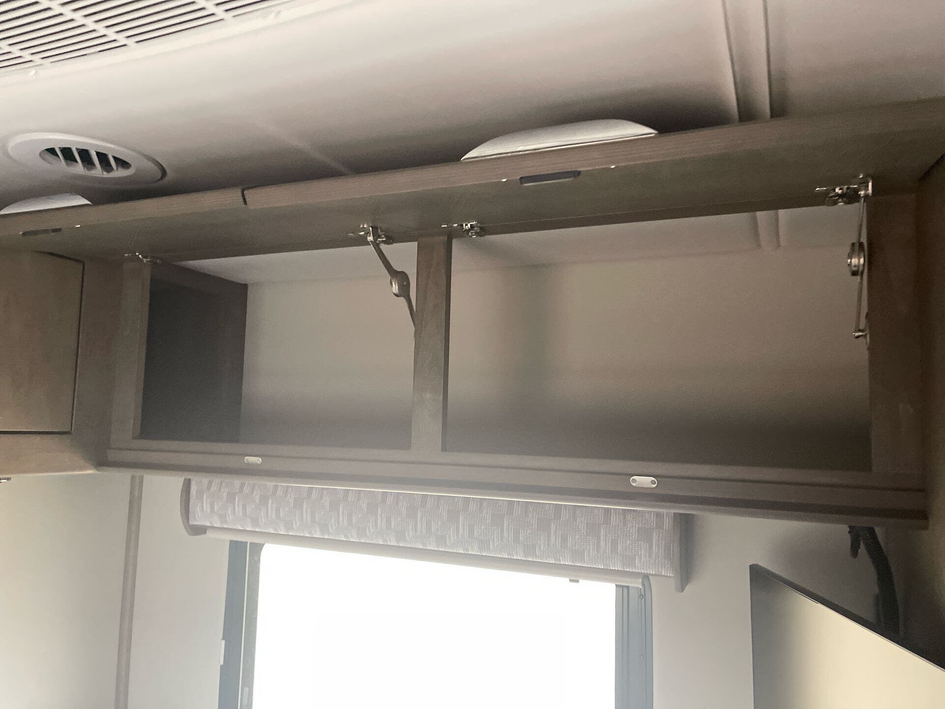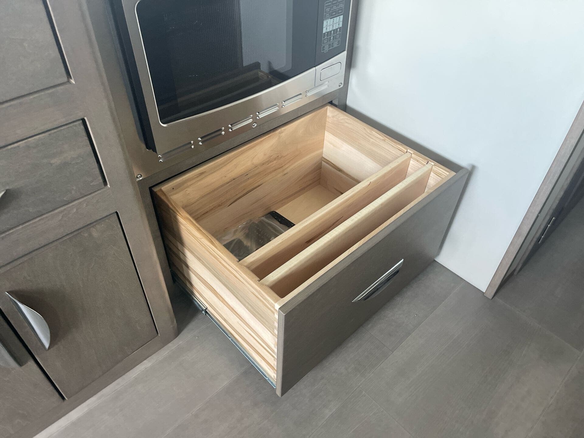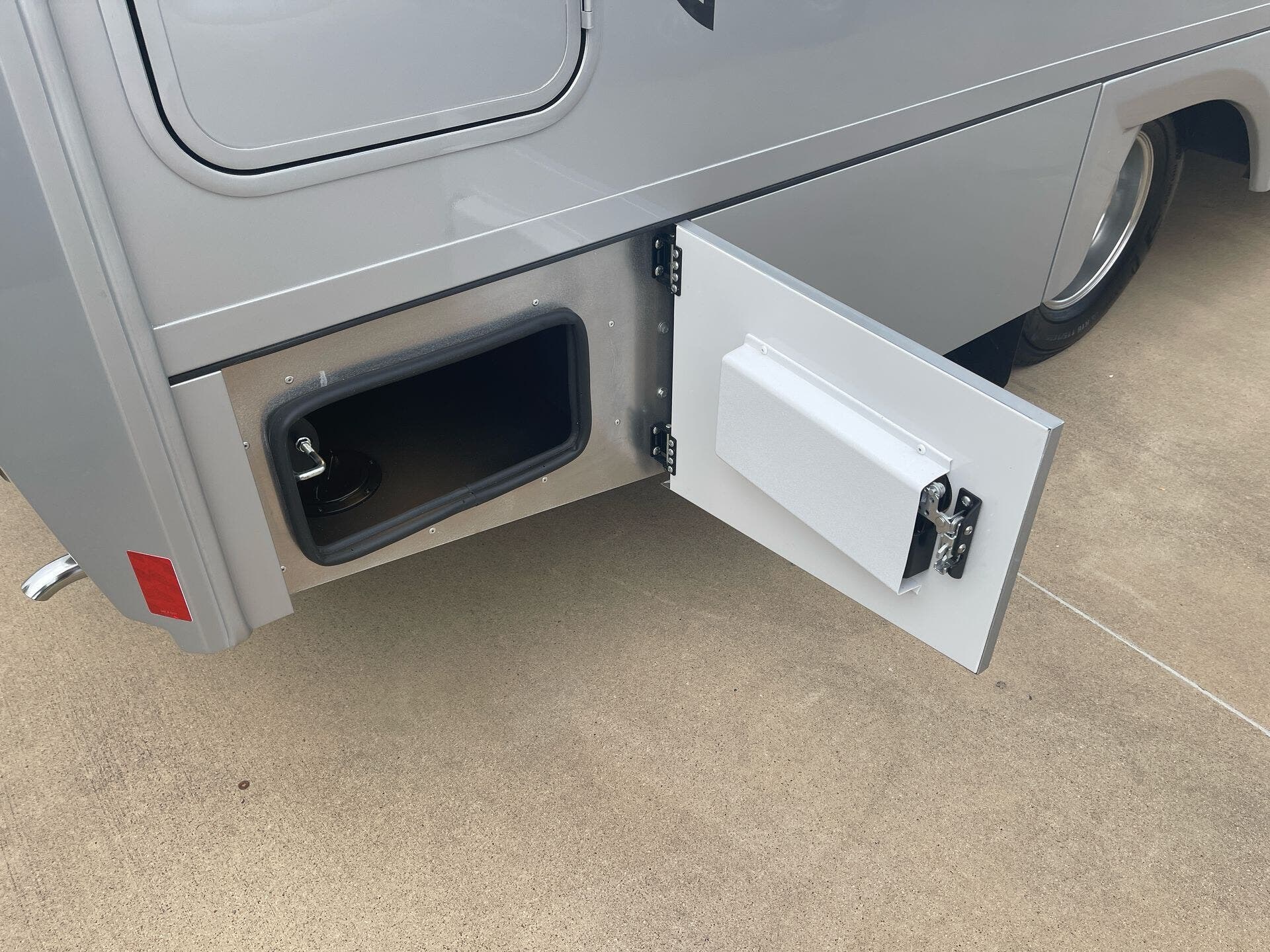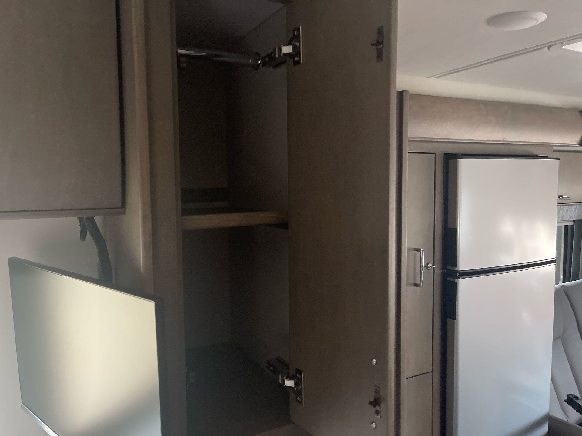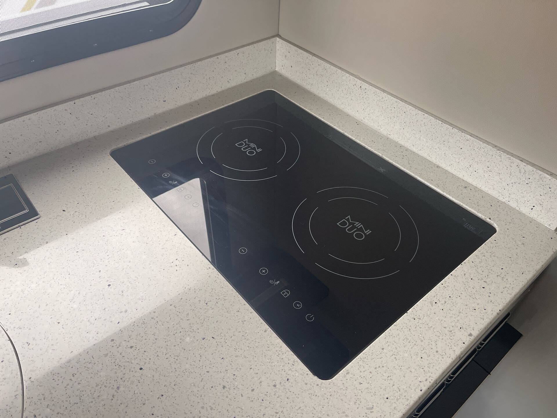 The galley is kitchen-ready with an induction or LP cooktop, 8?cu?ft 12?V compressor refrigerator, convection microwave, and ample storage. A 32″ Smart LED TV in the living area, 24″ TV in bedroom, and an exterior 27″ LED TV offer entertainment indoors and out.