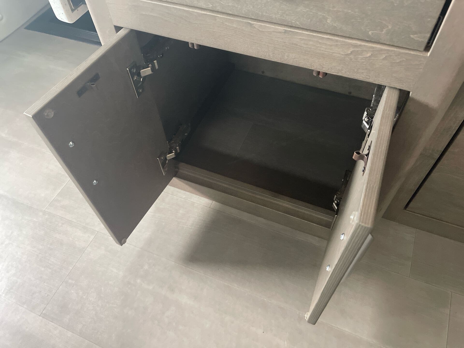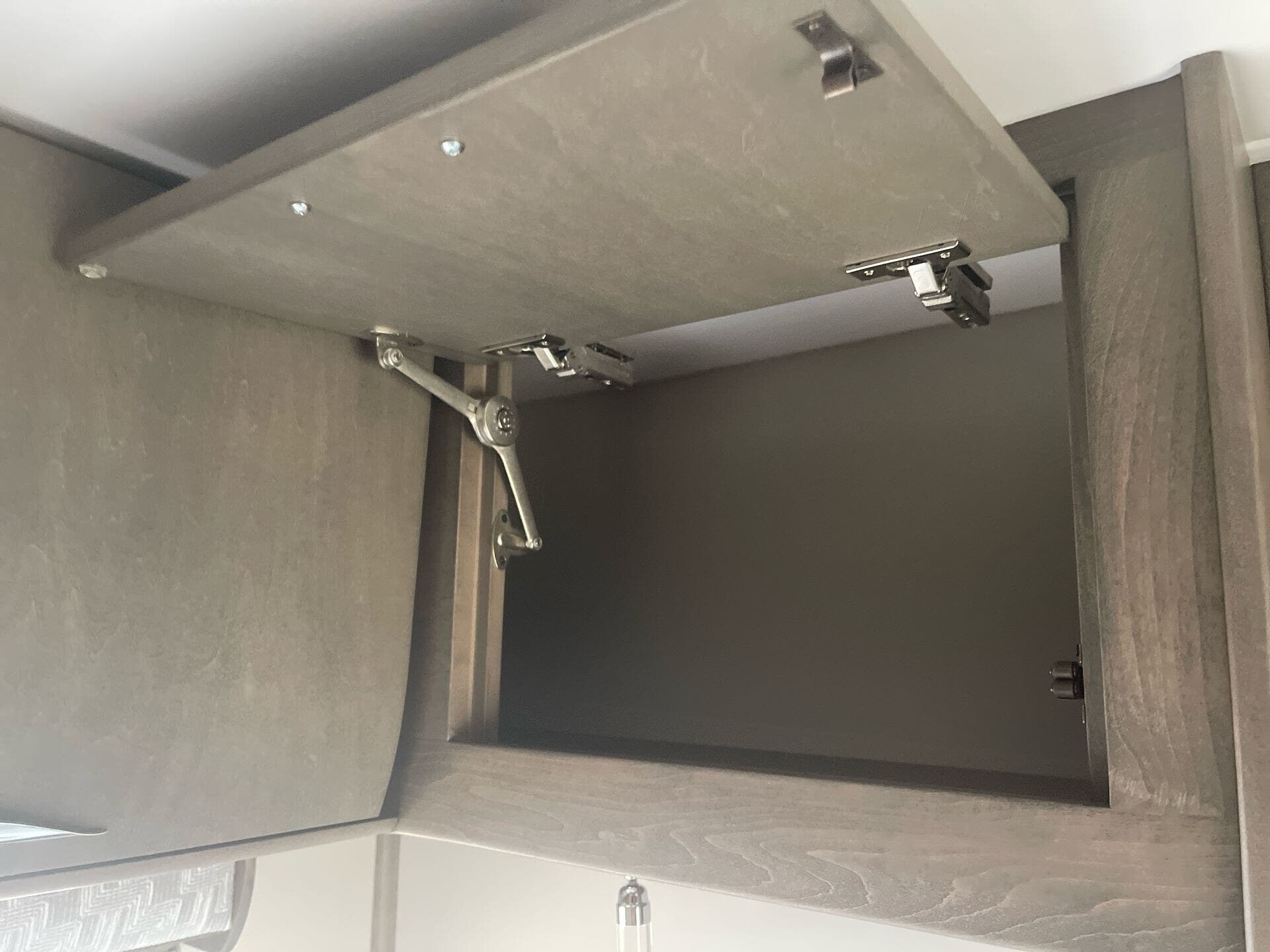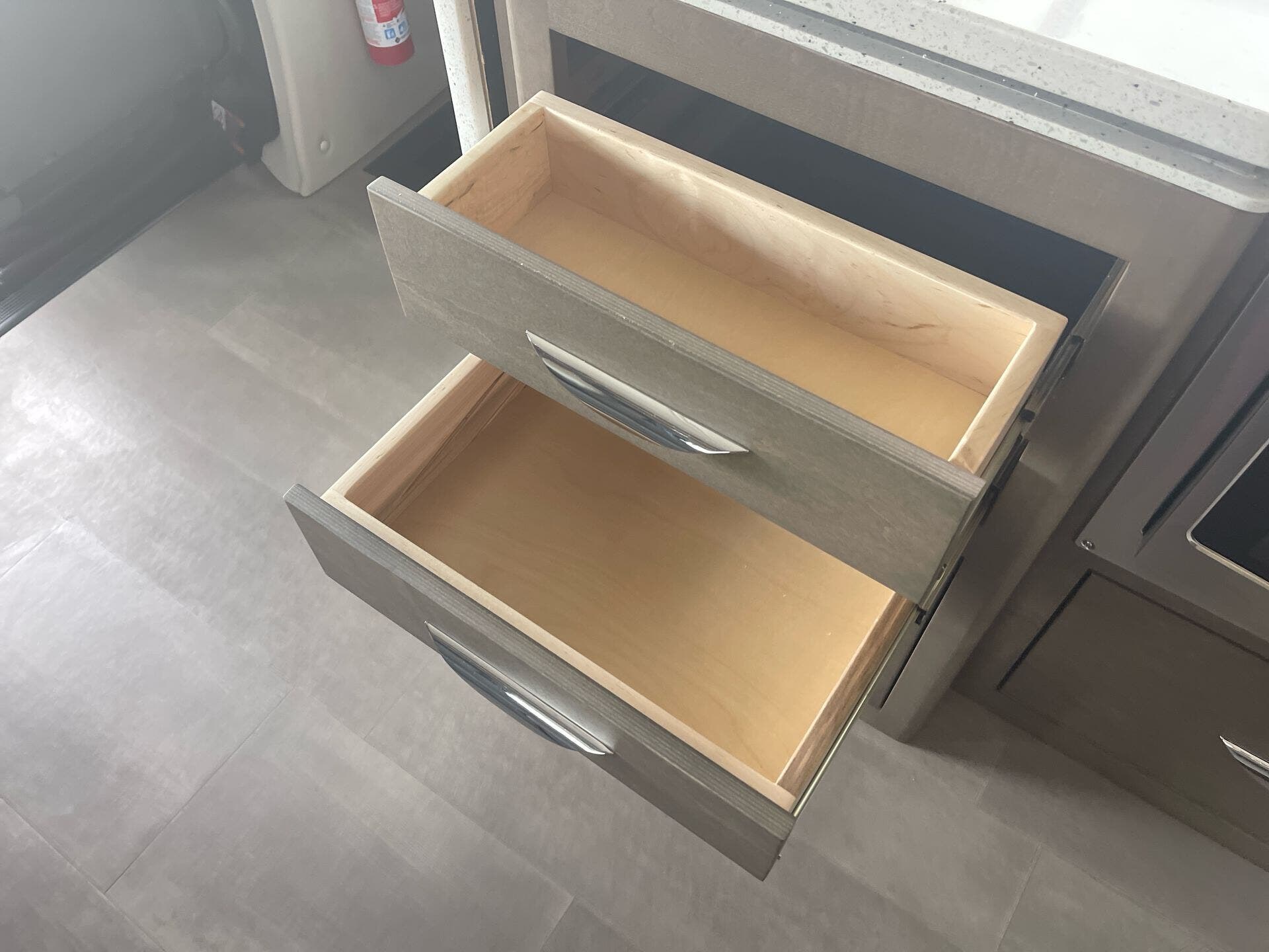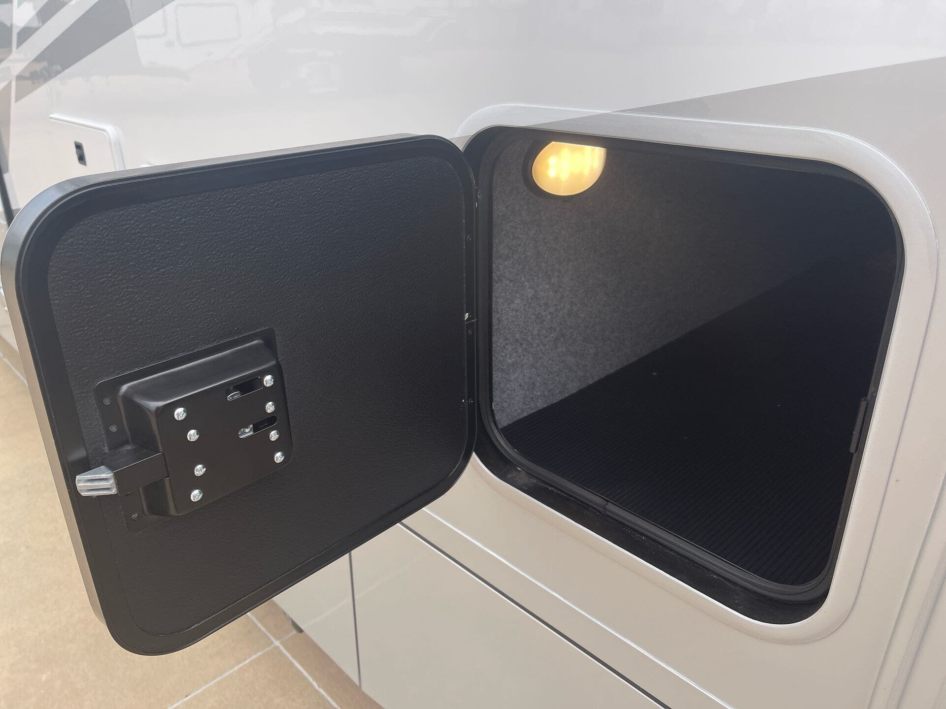 The galley is kitchen-ready with an induction or LP cooktop, 8?cu?ft 12?V compressor refrigerator, convection microwave, and ample storage. A 32″ Smart LED TV in the living area, 24″ TV in bedroom, and an exterior 27″ LED TV offer entertainment indoors and out.