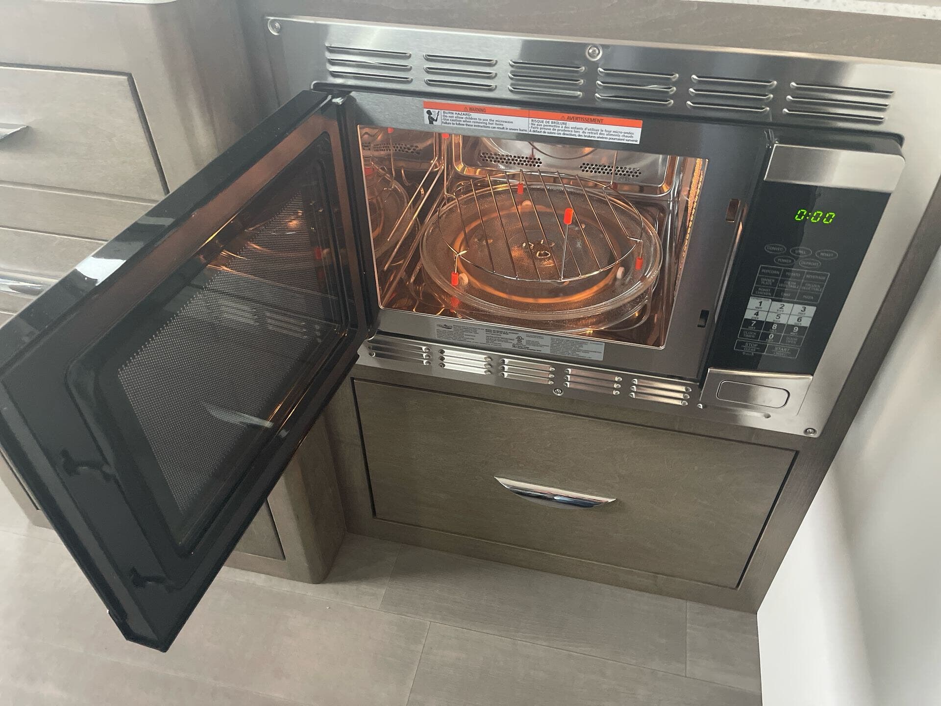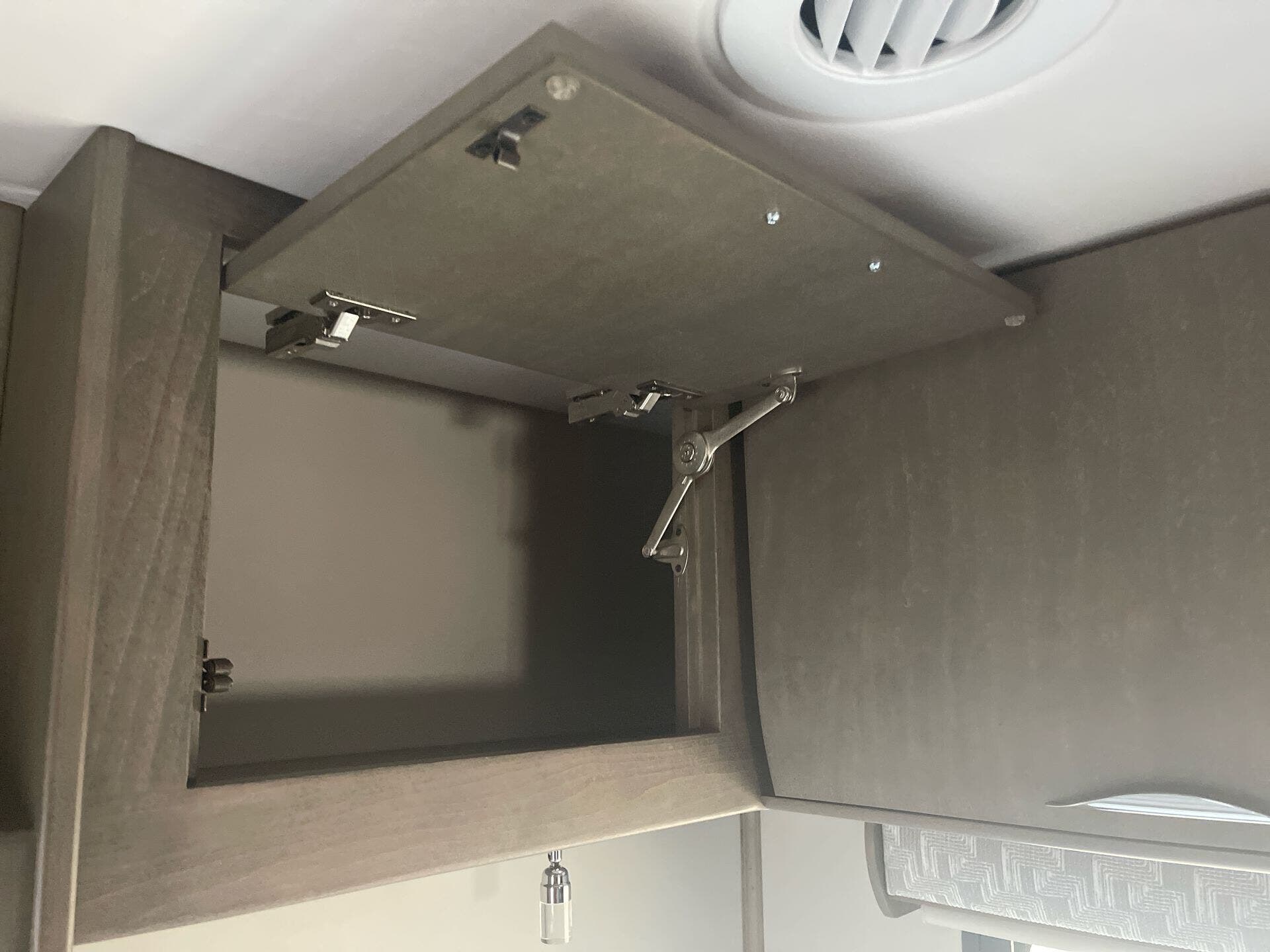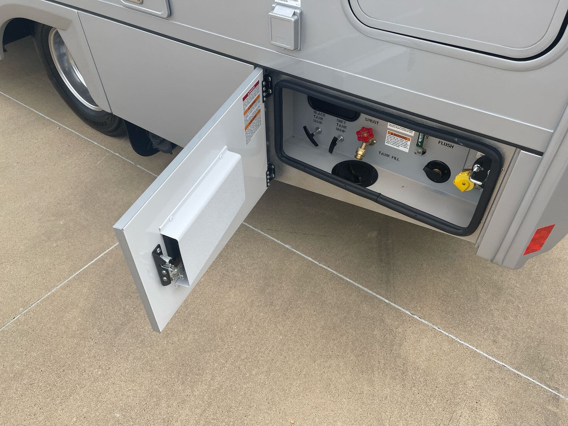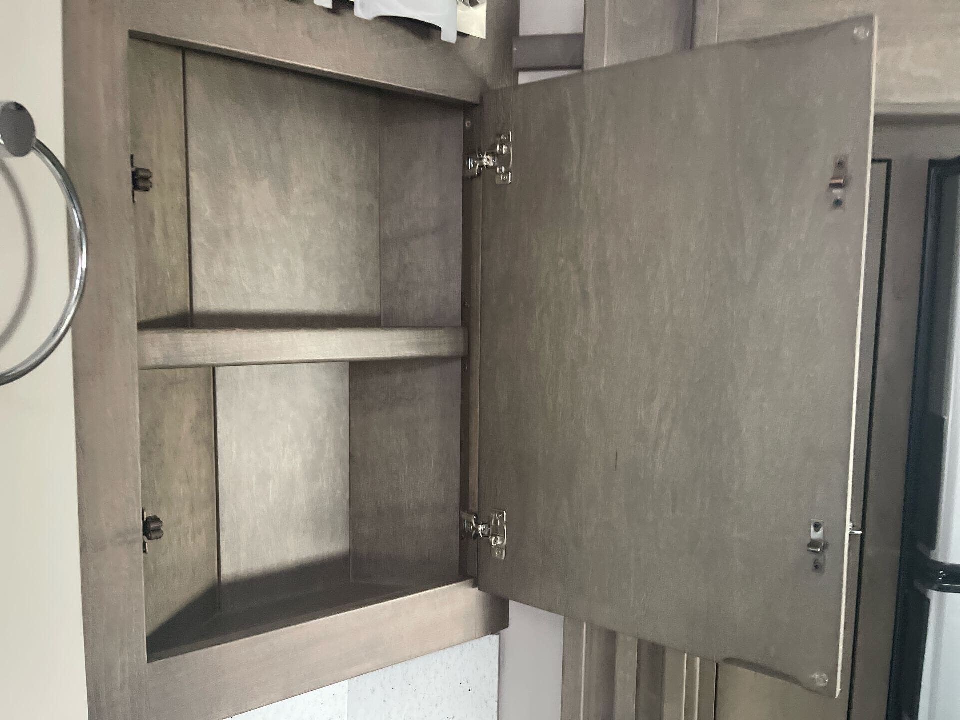 The galley is kitchen-ready with an induction or LP cooktop, 8?cu?ft 12?V compressor refrigerator, convection microwave, and ample storage. A 32″ Smart LED TV in the living area, 24″ TV in bedroom, and an exterior 27″ LED TV offer entertainment indoors and out.
