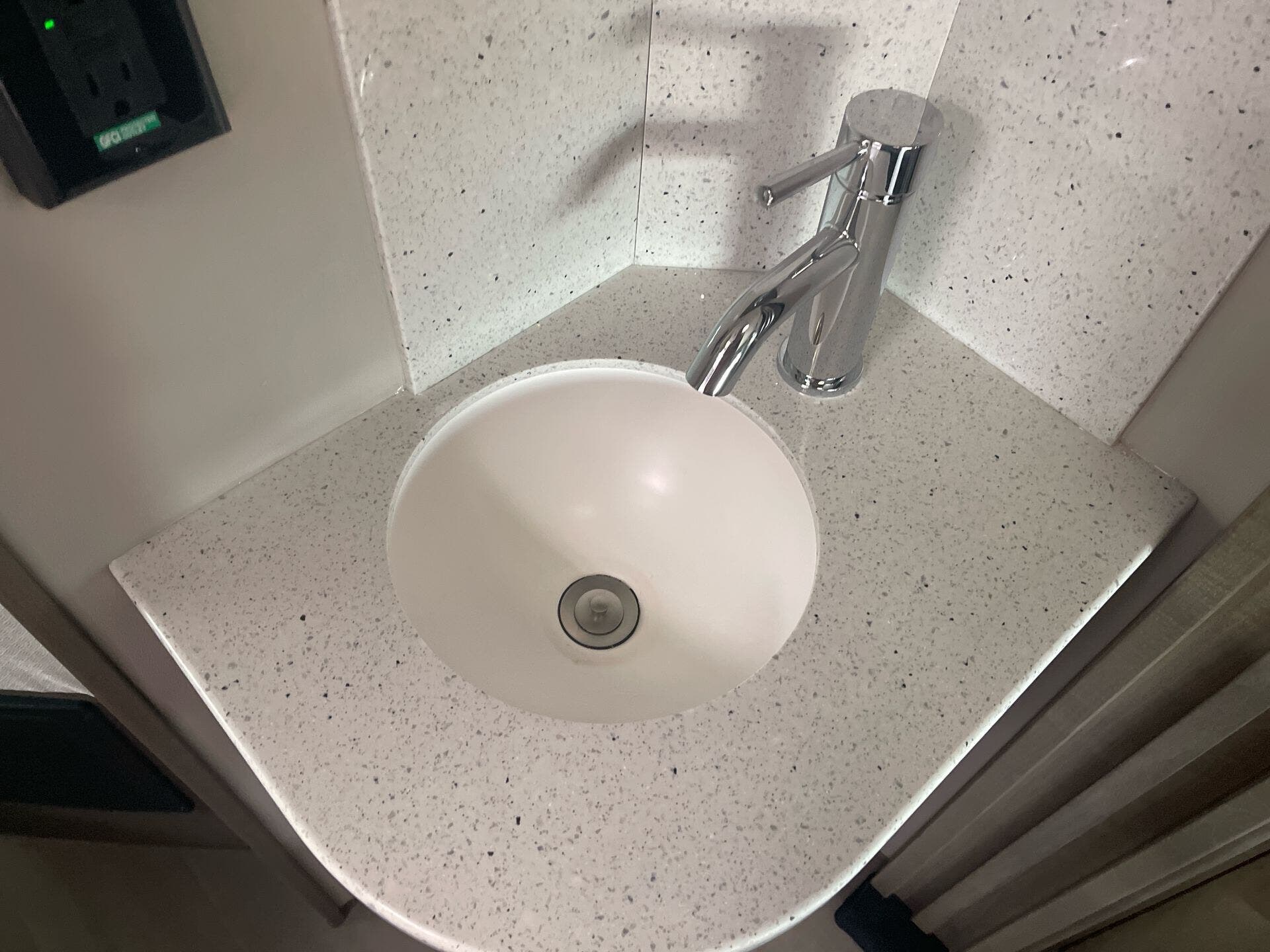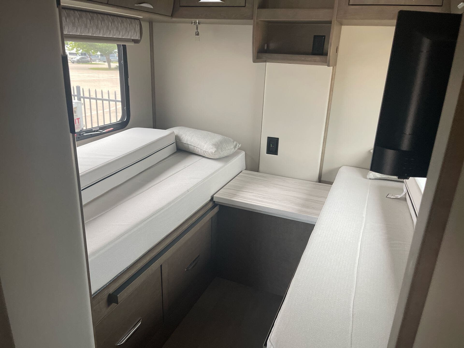 Inside, this single-slide layout sleeps up to four, featuring rear twin beds convertible into a large sleeping space and a private full bathroom with separate shower and toilet. Hardwood cabinetry, ultra-soft vinyl furniture, and solid-surface countertops elevate the living experience.