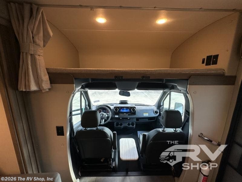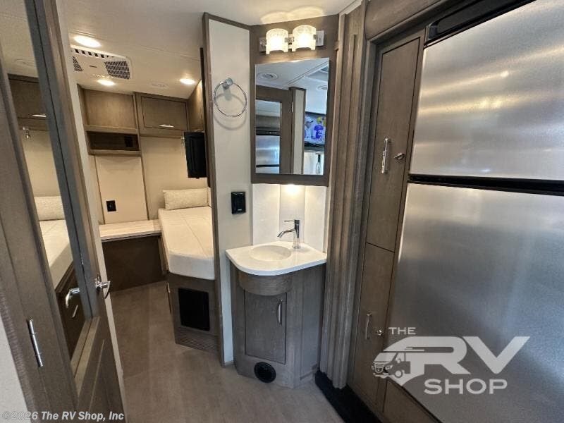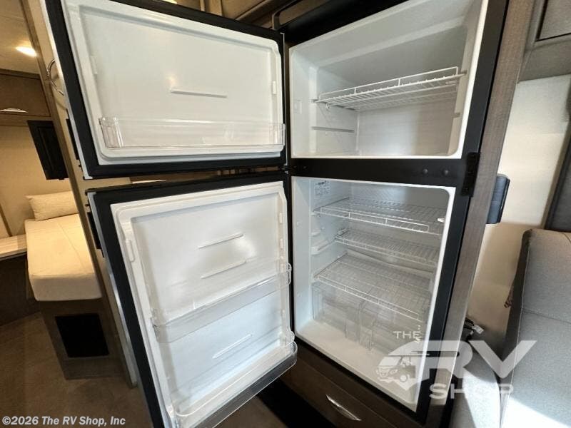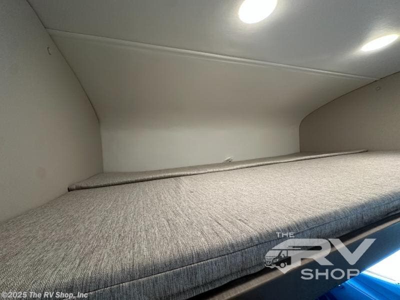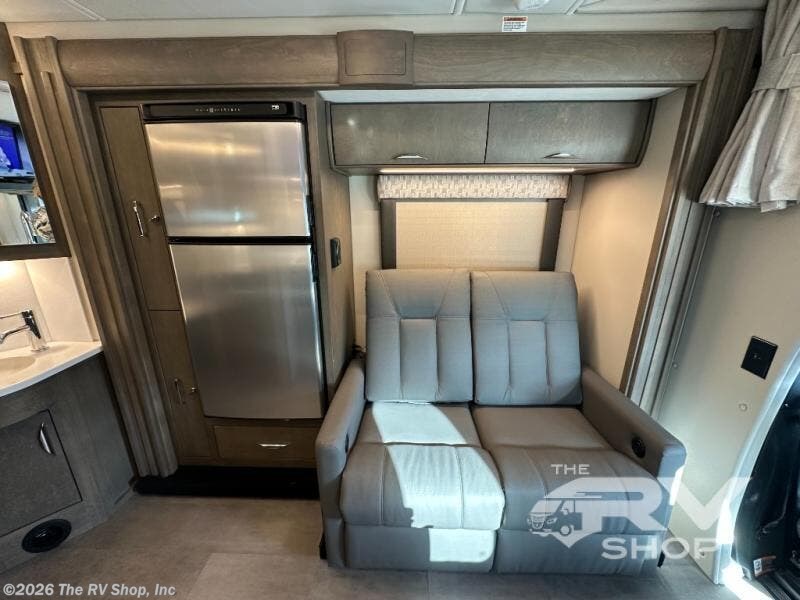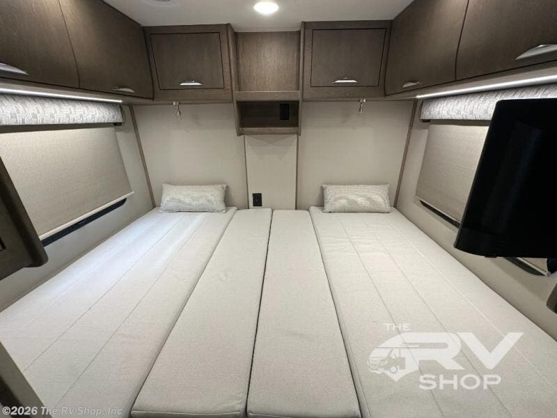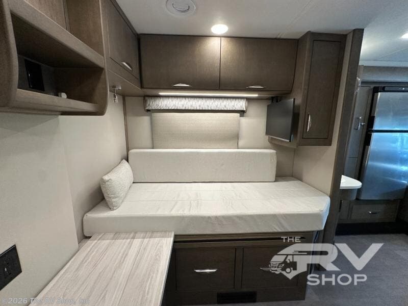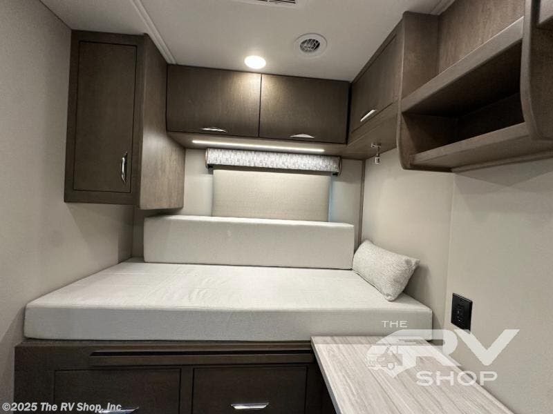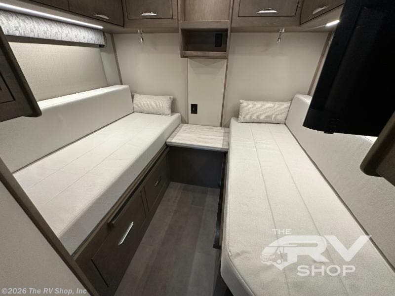 The perfect coach for two along with room for an added guest or little ones with the 46" x 80" over the cab bunk! You will appreciate the storage throughout for your belongings, so no worries about leaving anything behind. The single slide out along the driver's side adds more walking around space inside. Prepare light meals and snacks with ease while you travel with a two-burner cooktop and round sink for cleaning up. There is cupboard storage in the overhead areas for your dishes, and the refrigerator/pantry is located opposite within the sofa slide. The onboard bathroom features a private toilet and shower area with a separate sink just opposite the door. In the rear of the coach, there are two twin mattresses, a 24" TV and overhead storage along each side and rear of the coach, plus more storage can be found at the foot of each bed.