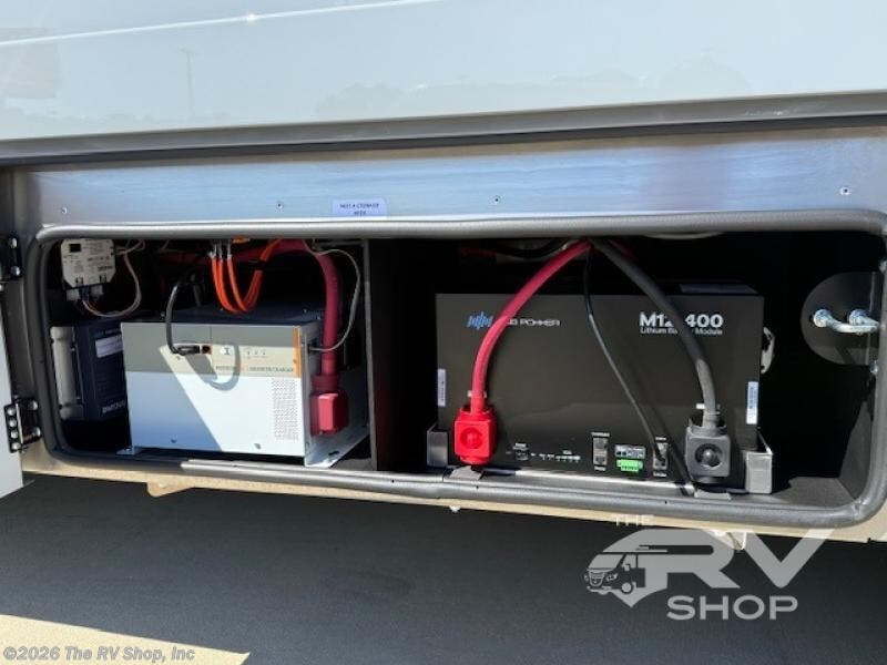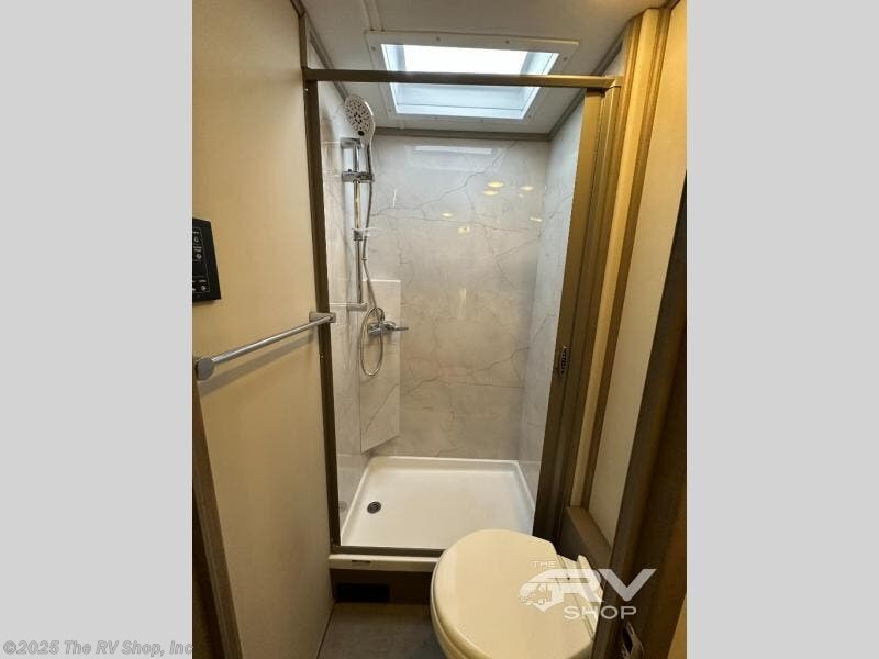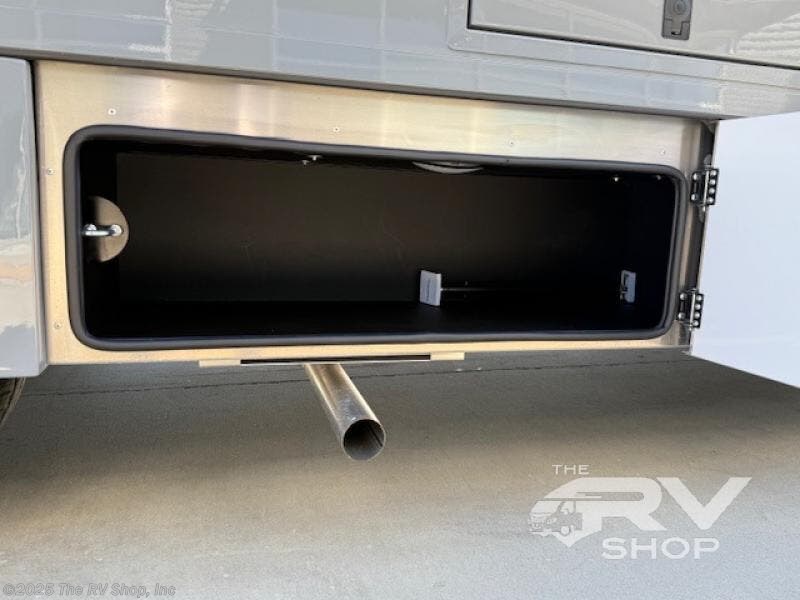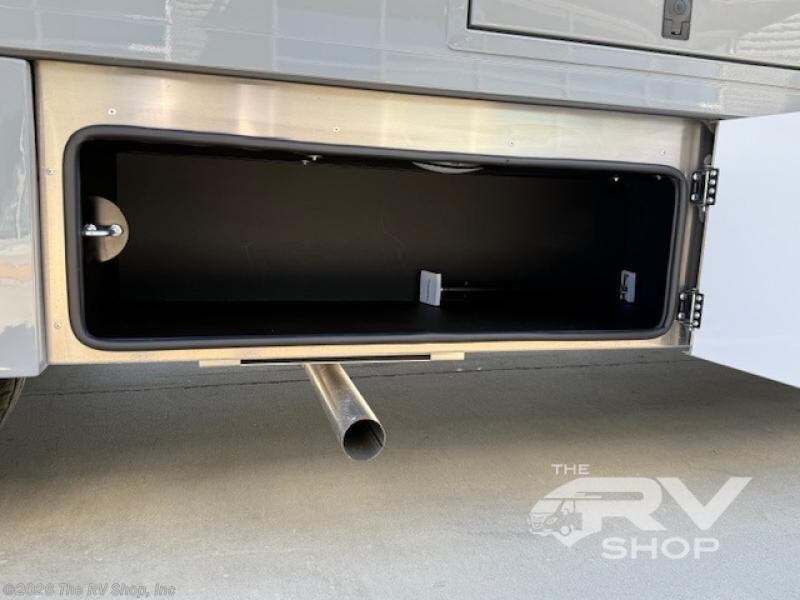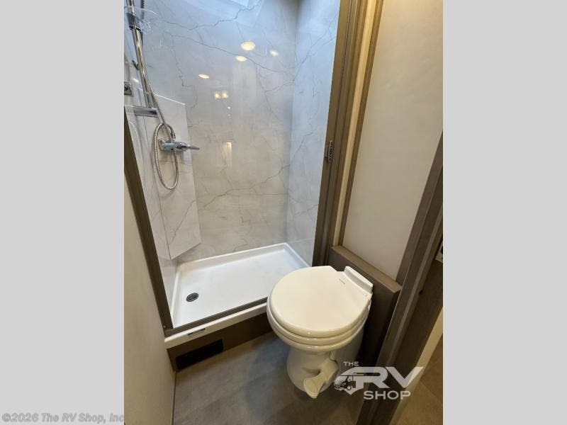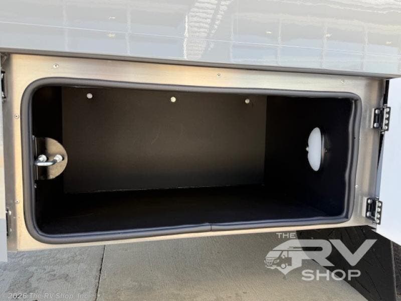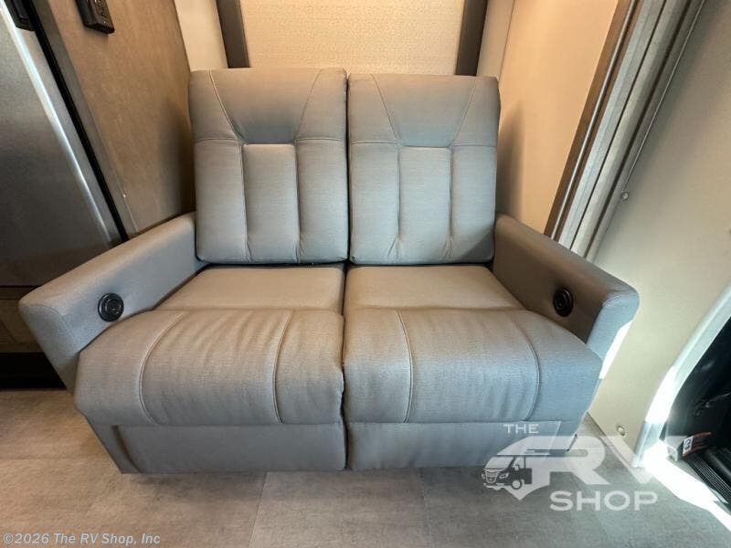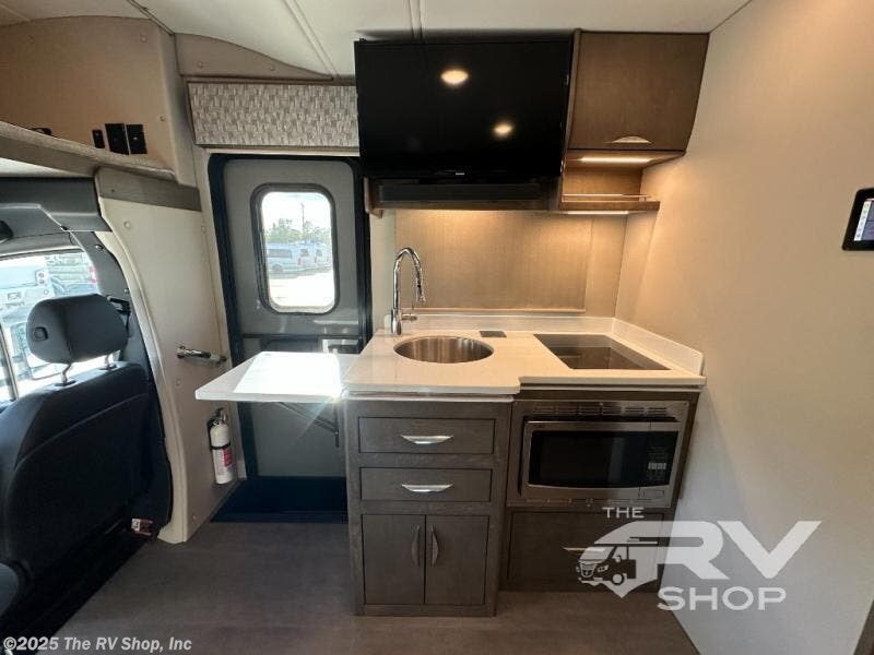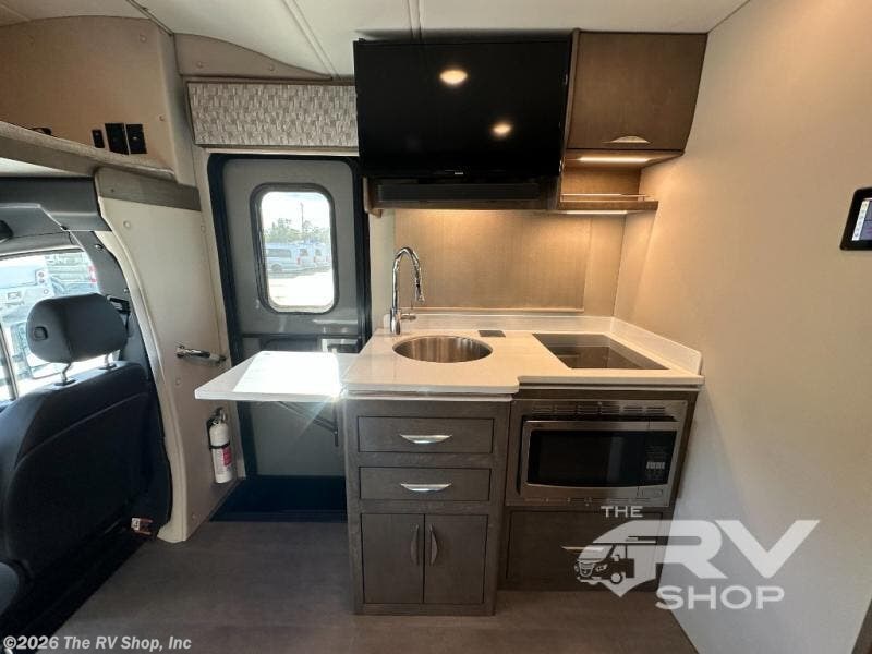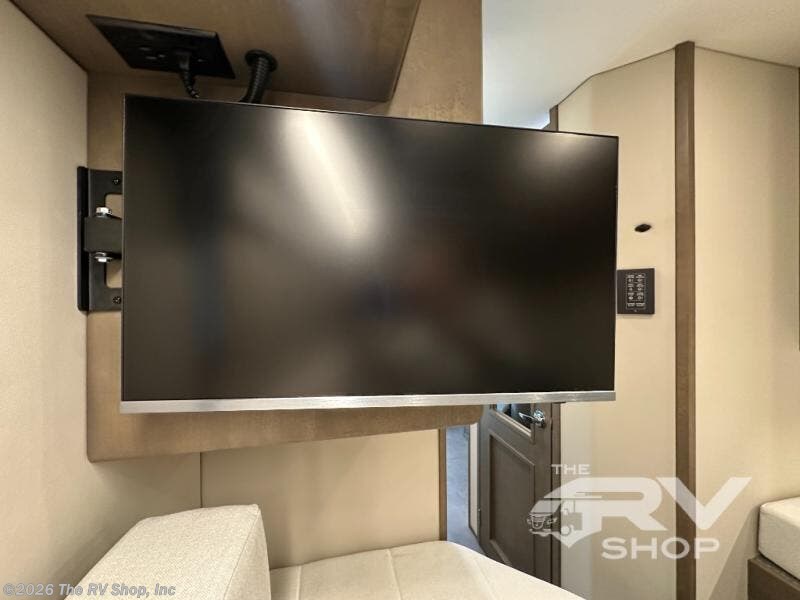 The perfect coach for two along with room for an added guest or little ones with the 46" x 80" over the cab bunk! You will appreciate the storage throughout for your belongings, so no worries about leaving anything behind. The single slide out along the driver's side adds more walking around space inside. Prepare light meals and snacks with ease while you travel with a two-burner cooktop and round sink for cleaning up. There is cupboard storage in the overhead areas for your dishes, and the refrigerator/pantry is located opposite within the sofa slide. The onboard bathroom features a private toilet and shower area with a separate sink just opposite the door. In the rear of the coach, there are two twin mattresses, a 24" TV and overhead storage along each side and rear of the coach, plus more storage can be found at the foot of each bed.