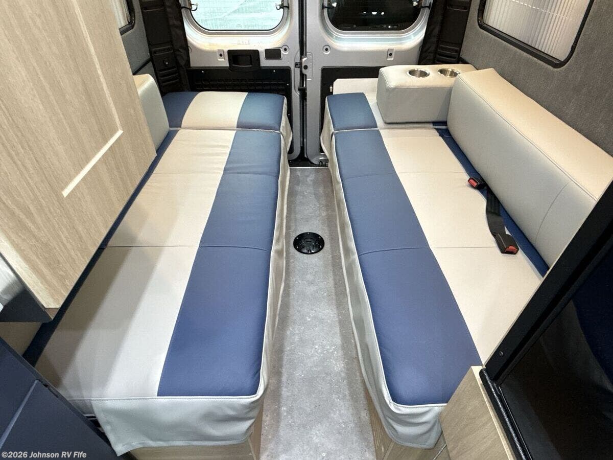 Features Include: 159-inch Wheelbase, 800-Amp CCA Battery, Rear Sumo Springs, LT225/75R16E Tires, Brake Assist, Collision Warning, Cross Path Detection, Crosswind Assist, Driving Assist, Fog Lamps, Park Assist, Remote Start, Cab Floor Mat, Adjustable Cab Seats, Climate Control, Uconnect 5, 10.1-inch Display, HD Radio, Apple Car Play, Android Auto, Side Entry Step Bar, Rear Door, Adjustable Tables, Slideout Pantry, Seamless Countertop, High Rise Sink, Systems Center, USB Charge Ports, King Bed 68x75, Twin Beds 29x74, Secure Storage Space, Sink and Shower, Solar Ready