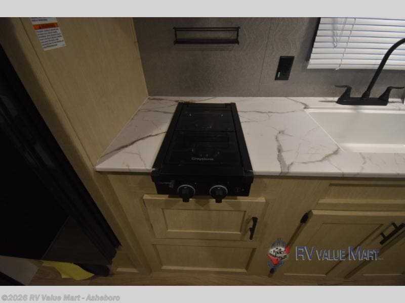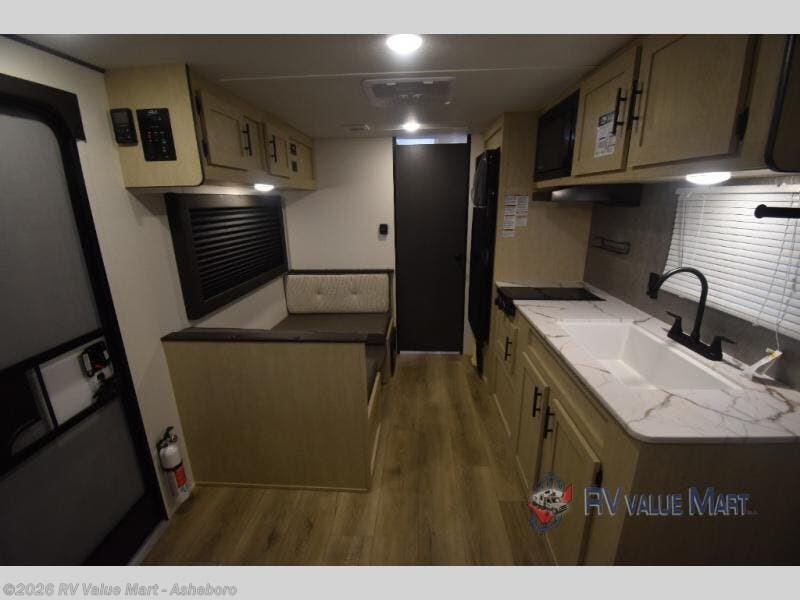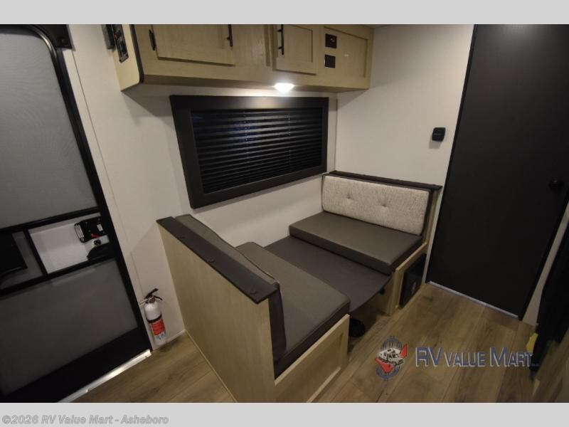 This travel trailer will feel just like home since there is a front bedroom with a queen bed, dual wardrobes to keep your clothes tidy, plus a spacious full rear bath. There is a shower pan here, plus a medicine cabinet and a spacious bath linen closet to keep clean towels close by. Head to the kitchen to prepare lunch on the two burner cooktop or use the microwave cabinet to heat up leftovers. There is a booth dinette where you can dine together and even let an overnight guests or two littles ones sleep on!
