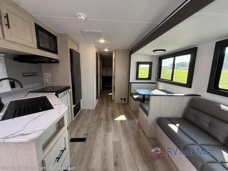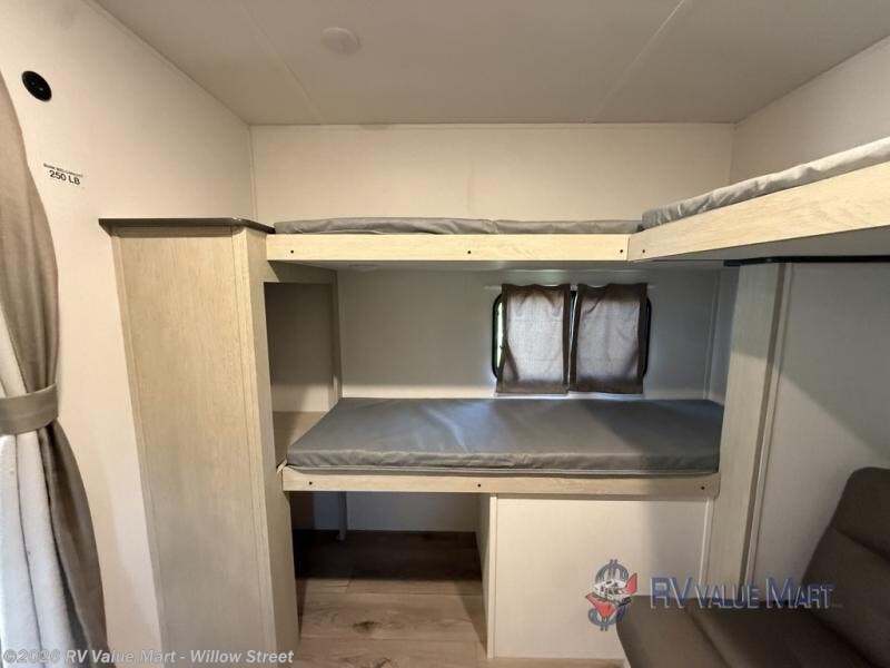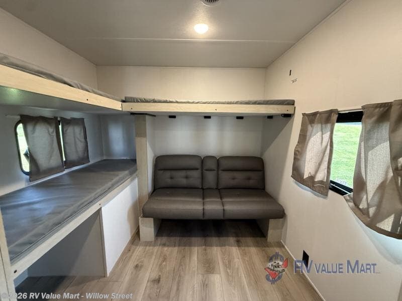 The little ones or your guests will love the bunkhouse in this spacious trailer. There area a set of 26" x 74" bunks, along with a flip-up bunk above a sofa they can sleep and relax. You'll find your own space in the front bedroom that includes a walk-around queen bed and dual wardrobes. Everyone can meet in the middle living area and kitchen to dine around the booth dinette or relax on the sofa. The chef will be able to create delicious meals each day on the three burner cooktop, and there is a residential style refrigerator for perishables. And the mid-coach full bath is sure to come in handy after a day of swimming or hiking!