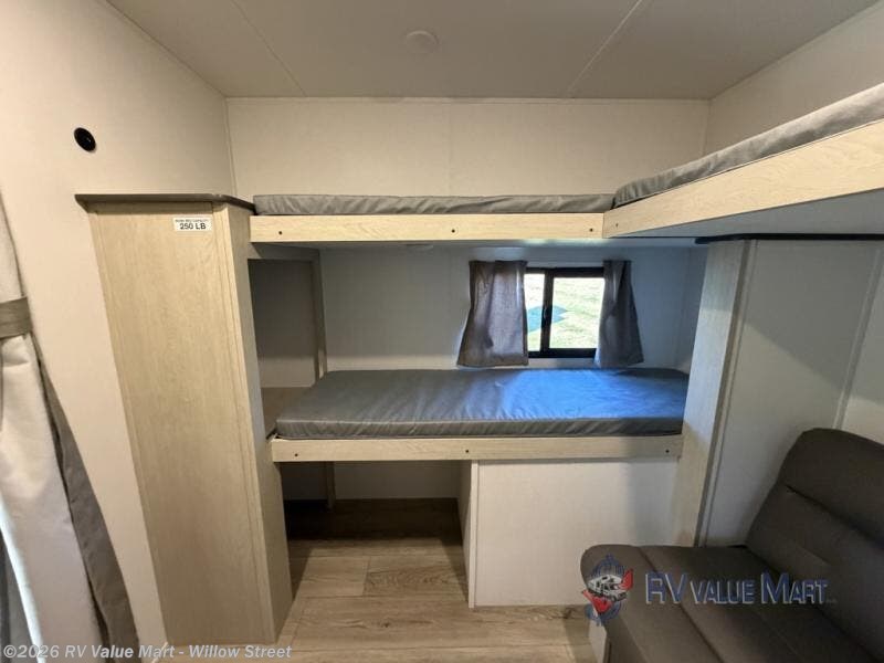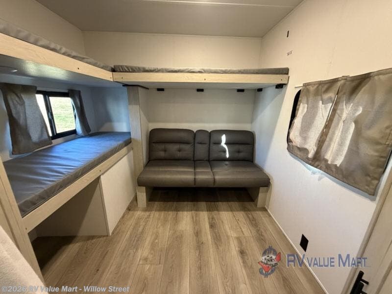 The little ones or your guests will love the bunkhouse in this spacious trailer. There area a set of 26" x 74" bunks, along with a flip-up bunk above a sofa they can sleep and relax. You'll find your own space in the front bedroom that includes a walk-around queen bed and dual wardrobes. Everyone can meet in the middle living area and kitchen to dine around the booth dinette or relax on the sofa. The chef will be able to create delicious meals each day on the three burner cooktop, and there is a residential style refrigerator for perishables. And the mid-coach full bath is sure to come in handy after a day of swimming or hiking!