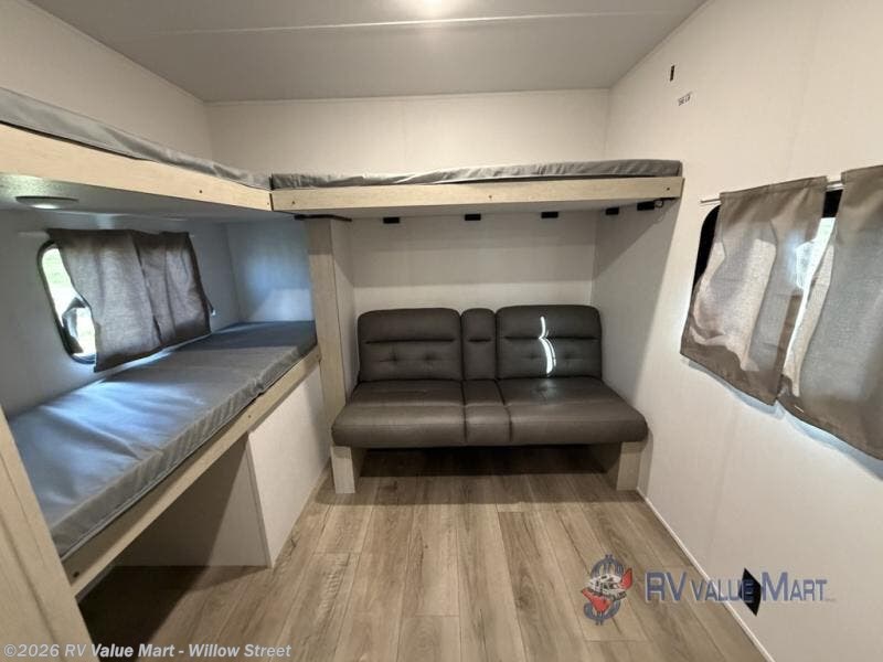 The little ones or your guests will love the bunkhouse in this spacious trailer. There are a set of 26" x 74" bunks, along with a flip-up bunk above a sofa they can sleep and relax. You'll find your own space in the front bedroom that includes a walk-around queen bed and dual wardrobes. Everyone can meet in the middle living area and kitchen to dine around the booth dinette or relax on the sofa. The chef will be able to create delicious meals each day on the three-burner cooktop, and there is a refrigerator for perishables. And the mid-coach full bath is sure to come in handy after a day of swimming or hiking!