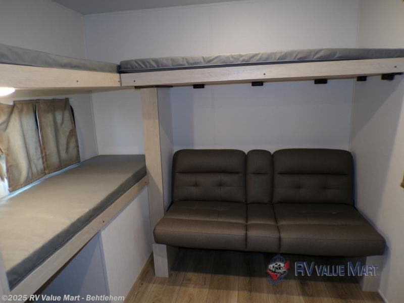 The little ones or your guests will love the bunkhouse in this spacious trailer. There area a set of 26" x 74" bunks, along with a flip-up bunk above a sofa they can sleep and relax. You'll find your own space in the front bedroom that includes a walk-around queen bed and dual wardrobes. Everyone can meet in the middle living area and kitchen to dine around the booth dinette or relax on the sofa. The chef will be able to create delicious meals each day on the three burner cooktop, and there is a residential style refrigerator for perishables. And the mid-coach full bath is sure to come in handy after a day of swimming or hiking!