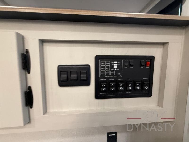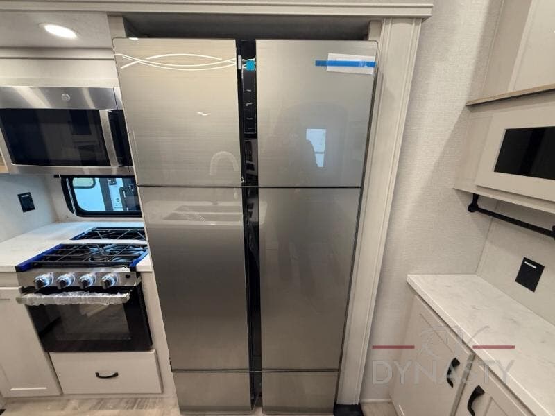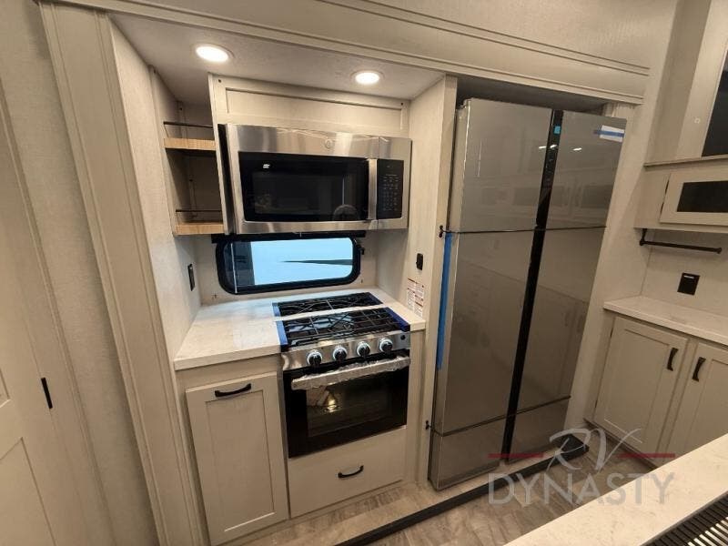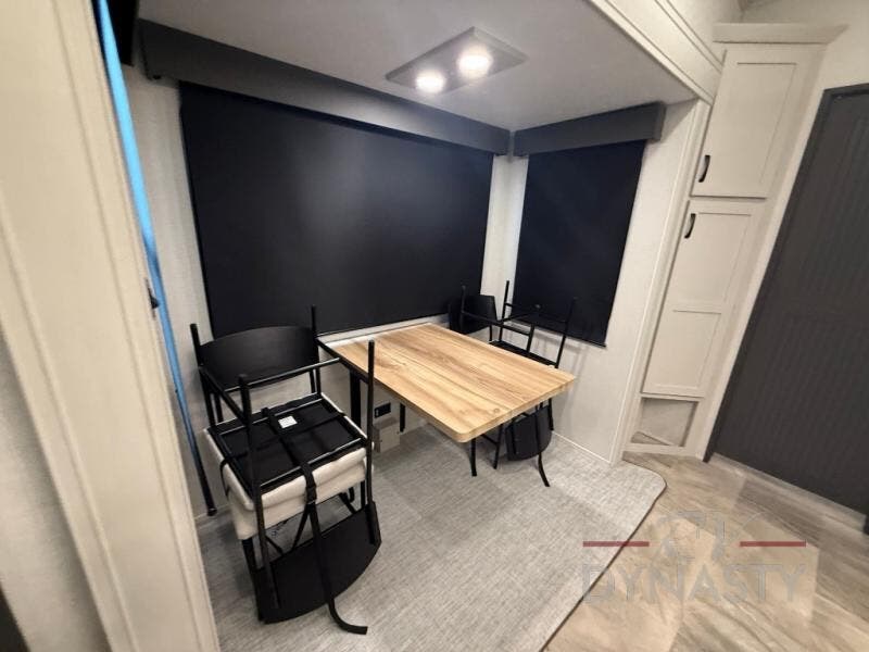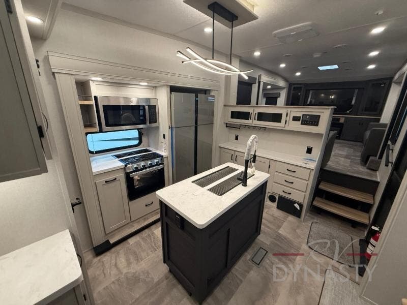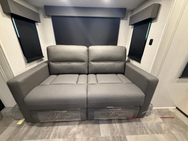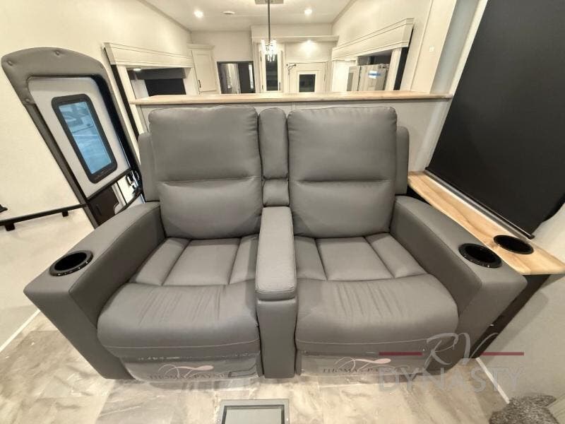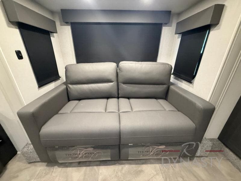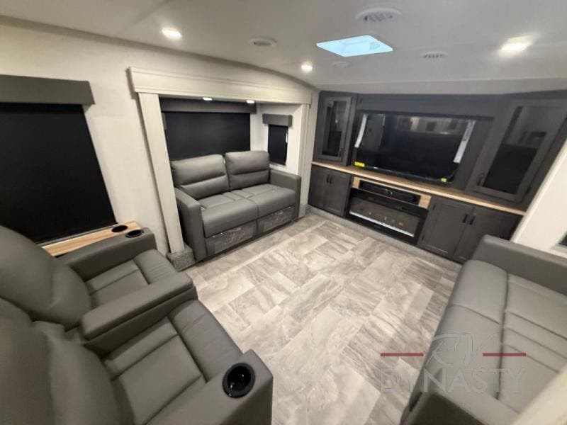 When you are looking for your own room in your next fifth wheel, this Phoenix will show you a spacious front living area with a front wall entertainment center, dual opposing tri-fold hide-a-bed sofas and theater seating that is separate from the centrally located kitchen. The main entry is within the kitchen and there is an island, a pantry, a hutch, full kitchen amenities, plus a table with four chairs. The master suite offers a king bed slide, clothing storage and a spacious rear bathroom with a shower including a seat and glass sliding doors, dual sink vanity, and a space prepped for a washer/dryer.