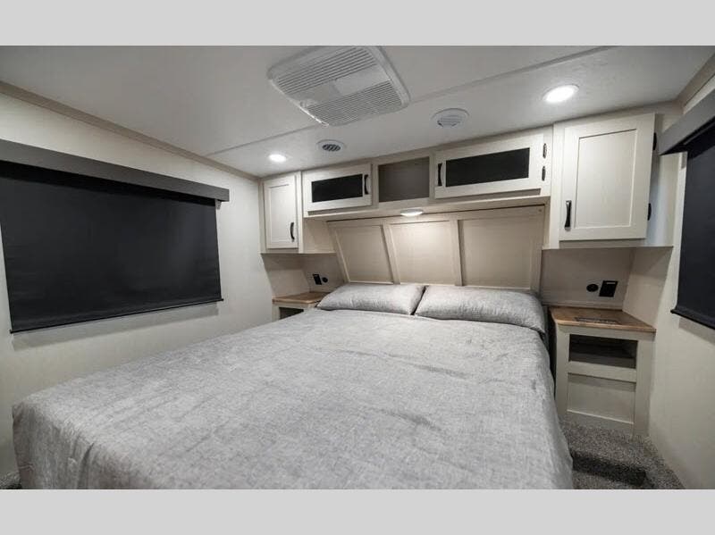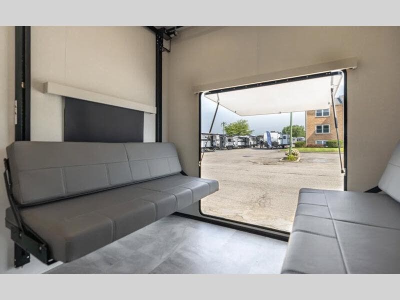 At the front of this fifth wheel, you’ll find a spacious bedroom designed for ultimate comfort, featuring a cozy queen bed flanked by nightstands on each side, perfect for keeping your essentials within reach. A large wardrobe and overhead storage provide ample space for clothing and gear. Moving down the hall, the full bathroom offers a 40" x 30" shower with a convenient seat for accessibility. At the center, the kitchen and living area combine functionality with relaxation. The slide-out houses a 10-cu. ft. refrigerator and a pantry for groceries, a U-shaped dinette for dining and lounging, and a tri-fold hide-a-bed sofa for additional seating and sleeping space. Opposite the slide, the well-equipped kitchen features a 21" stainless steel oven, residential-size cooktop, microwave, and an extra-deep single basin sink, everything the trip’s chef needs to cook in comfort. At the rear, there is a multipurpose area boasts a motorized Happy Jack system with a top 60" x 80" queen bed and dual rollover sofas below that convert into another 60" x 80" bed, ensuring everyone has a comfortable place to unwind after a day of adventure.